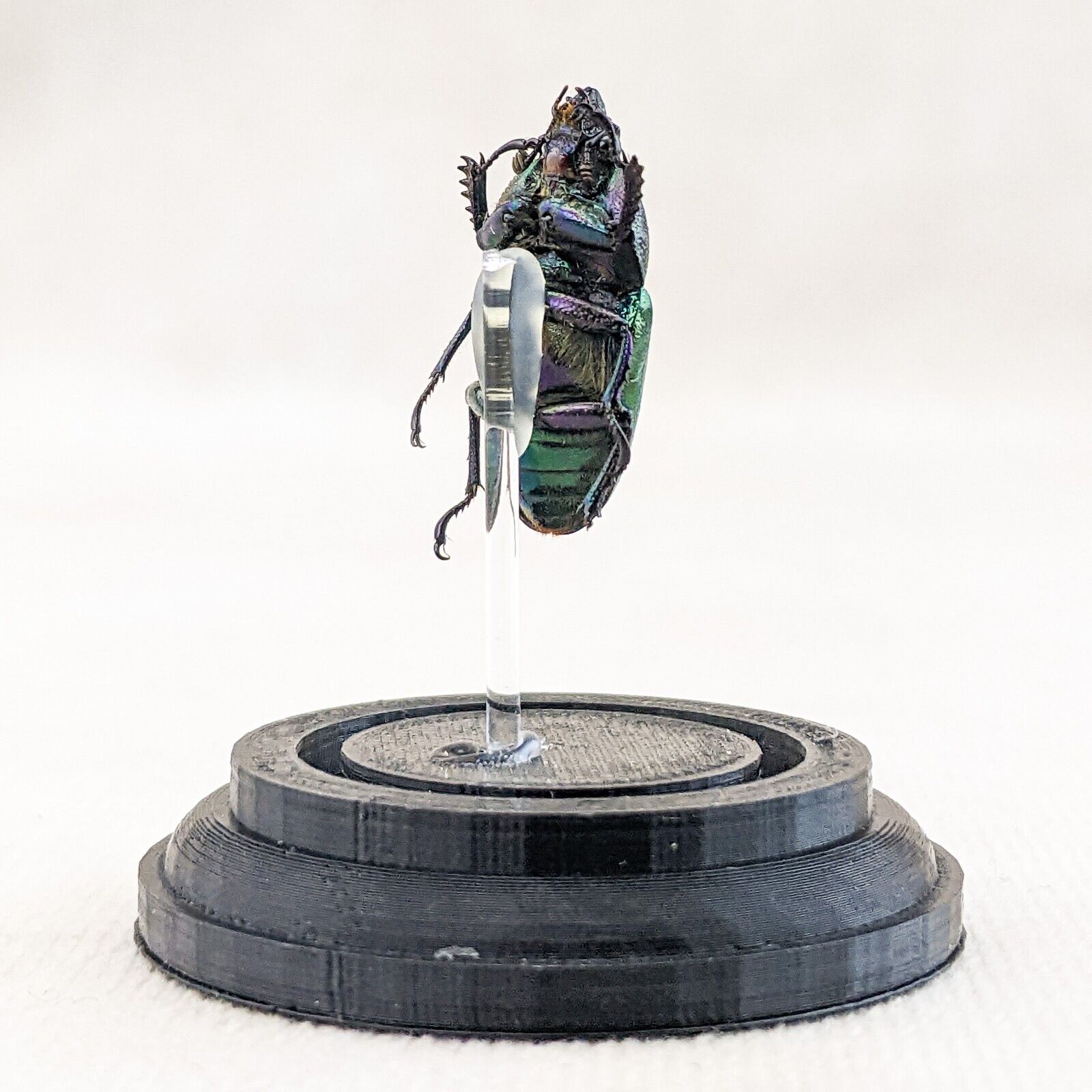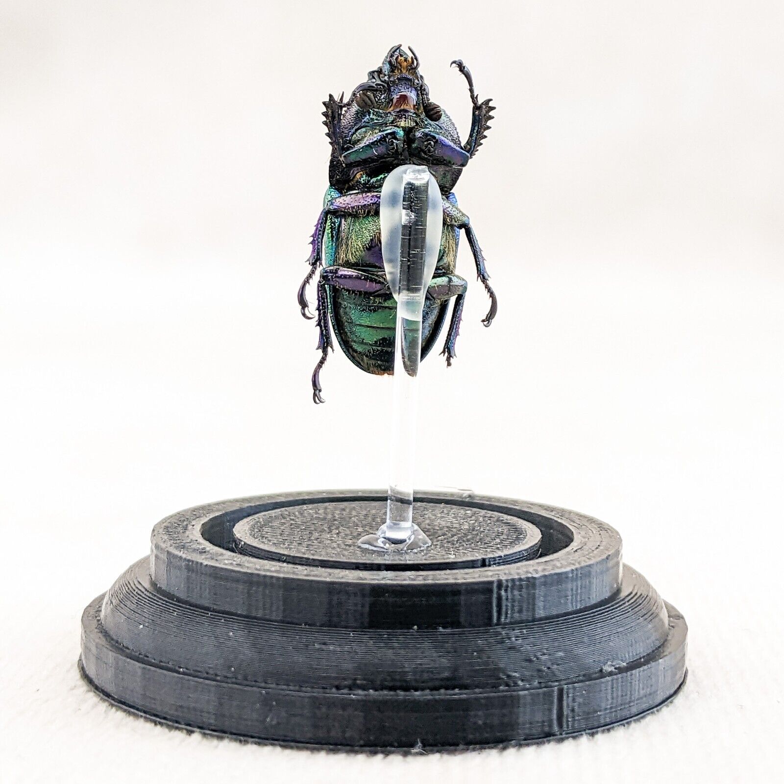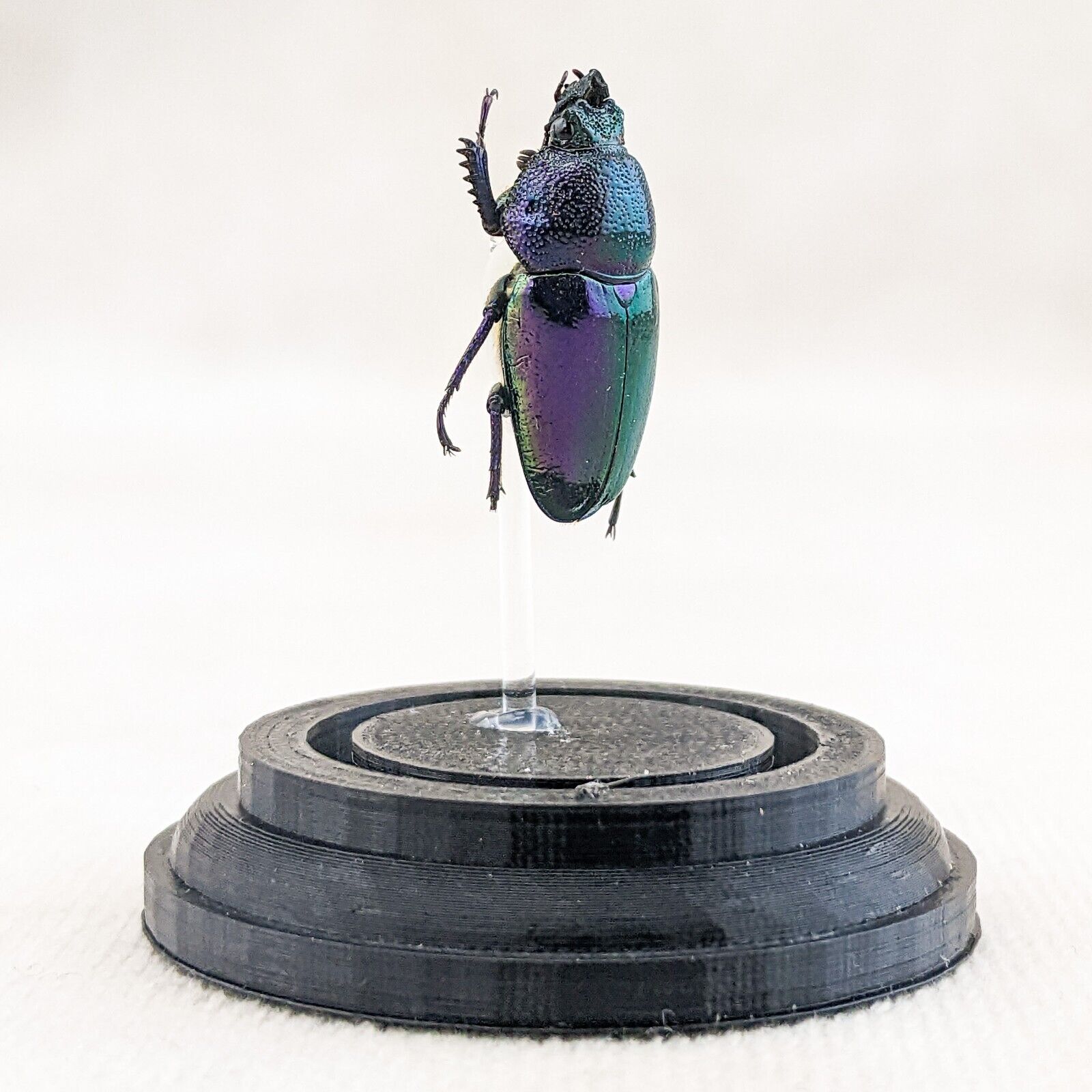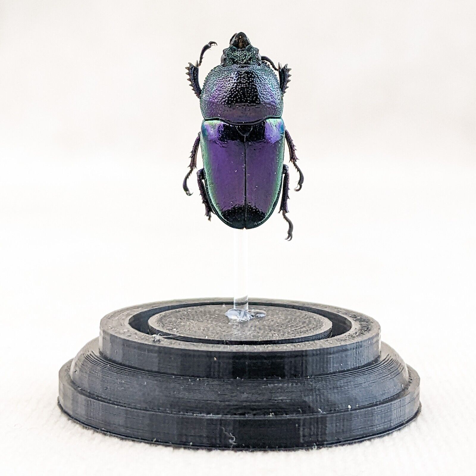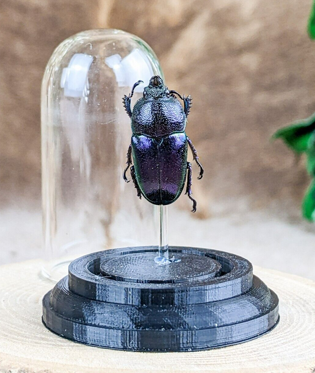 A24d #2  Beautiful Coloring-purple!  This is a very nice Mount Arfak Female stag beetle (Lamprina Adolphinae-species) specimen showcased nicely in a display dome to add to your collection!   The dome will keep her safe and clean for years to come.  This display is approx. 1 3/4" x 1 1/2" x 2 1/4" and is a glass dome with clear bottom.  The beetle is attached to a post for easy viewing.   This is a great specimen to start your collection with!