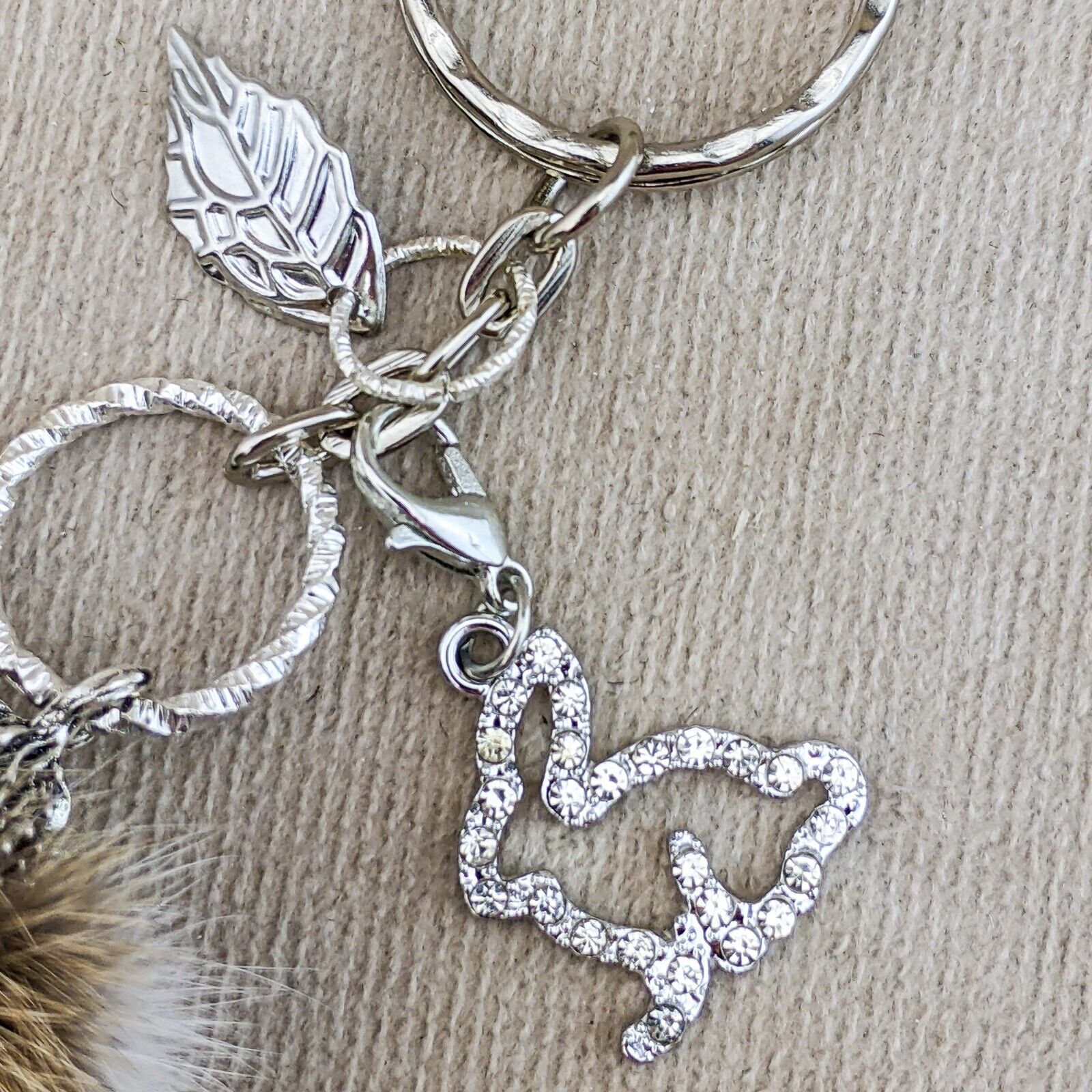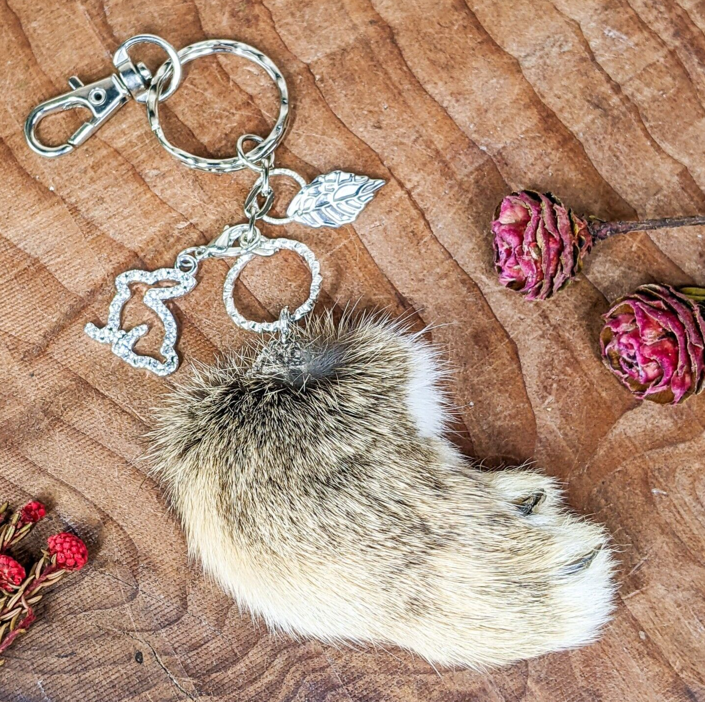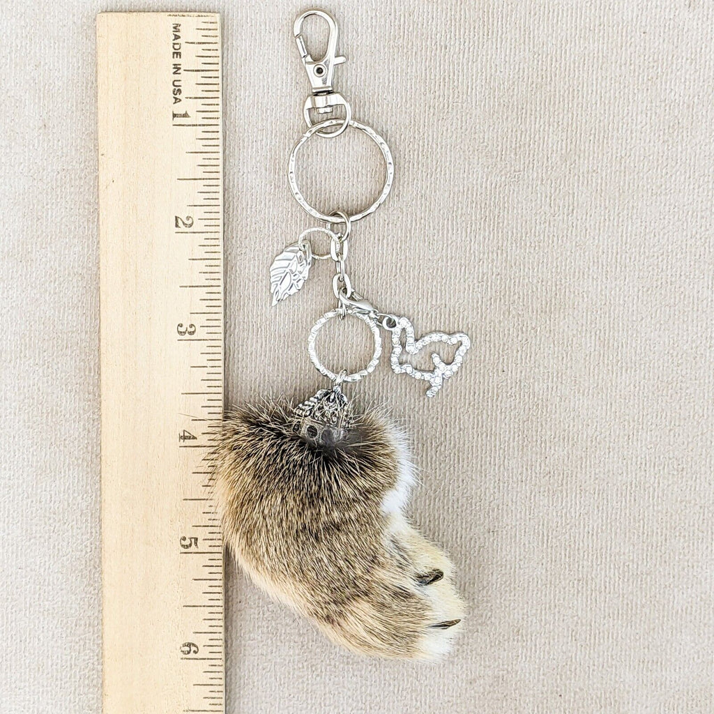 rf11 #1 This is a Fancy capped Lucky Real Rabbits foot charm with a shimmering rhinestone Bunny Charm and silver leaf charm on a keychain and hook! This is the one you will be receiving. It is approx. 6 x 2". Last picture shows item with ruler.