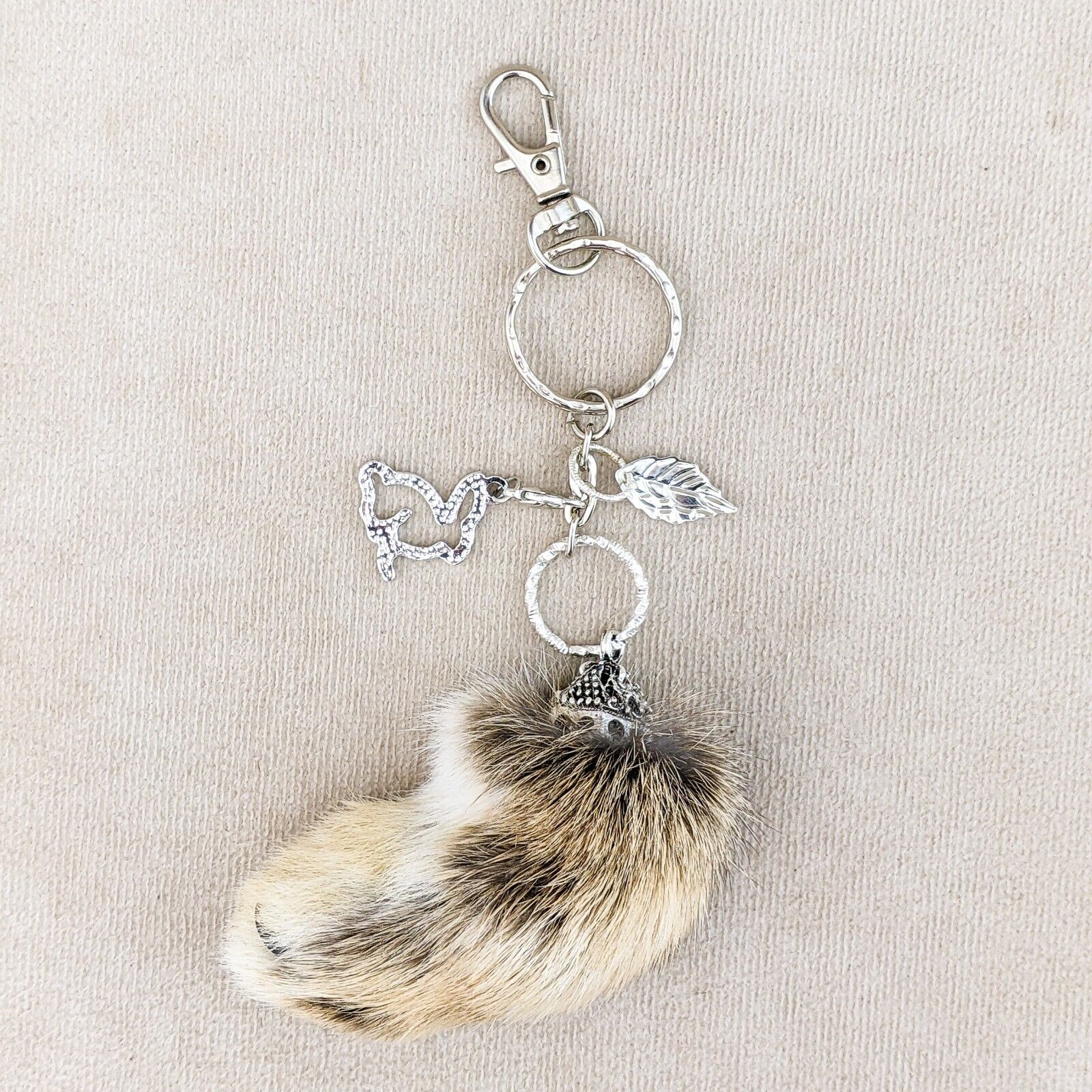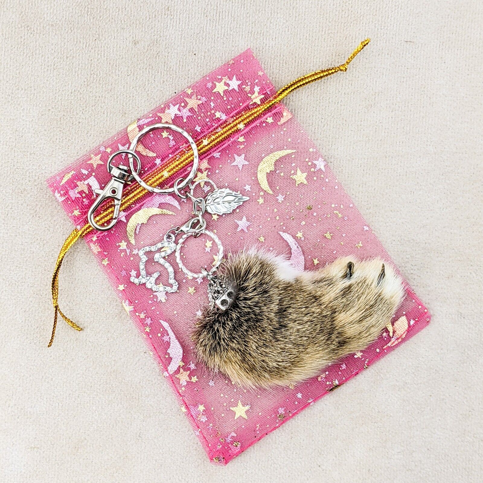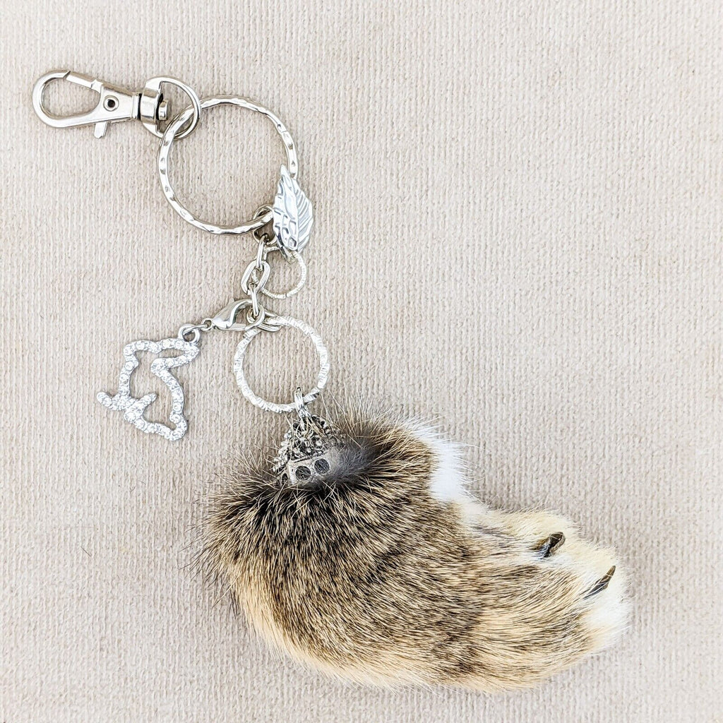 rf11 #1 This is a Fancy capped Lucky Real Rabbits foot charm with a shimmering rhinestone Bunny Charm and silver leaf charm on a keychain and hook! This is the one you will be receiving. It is approx. 6 x 2". Last picture shows item with ruler.