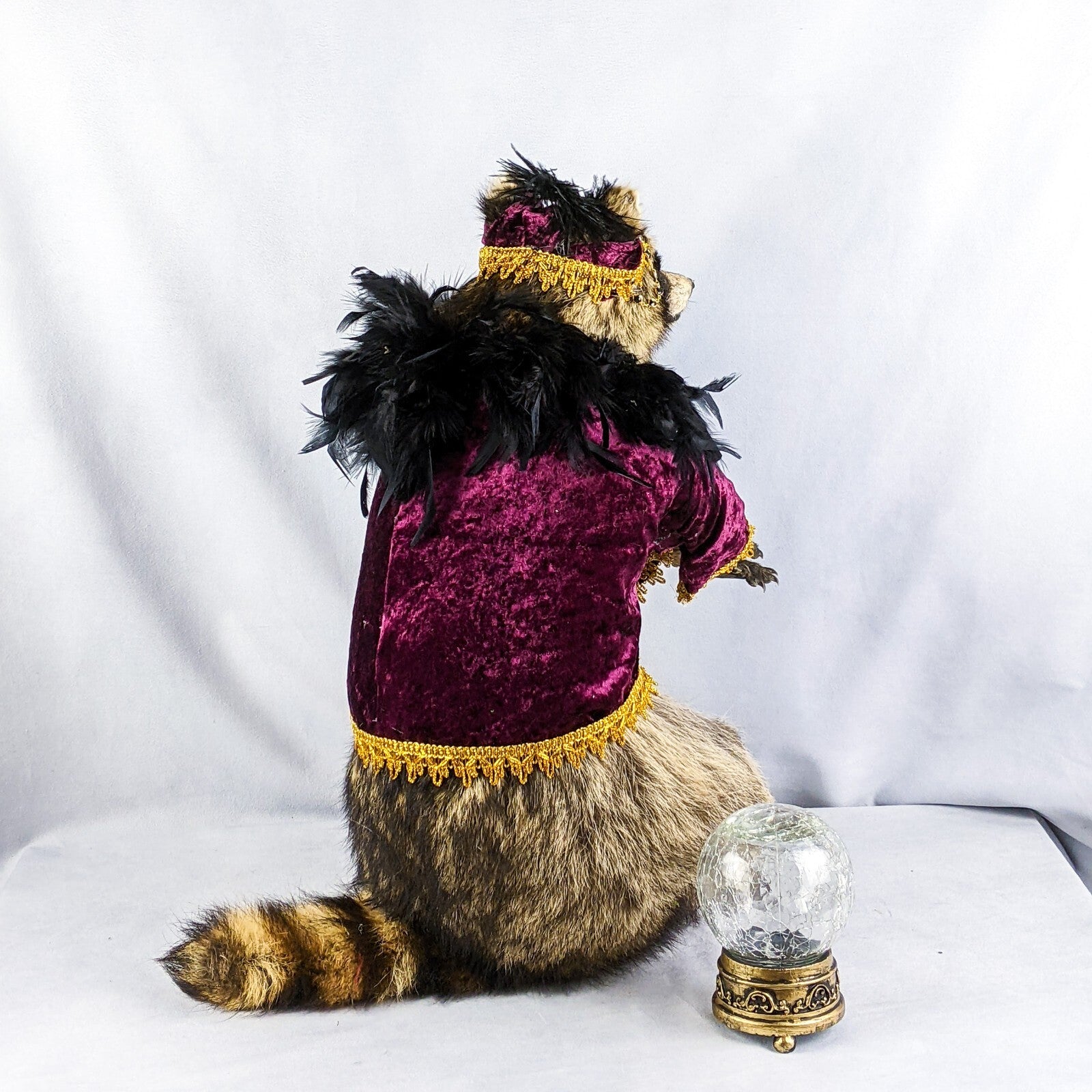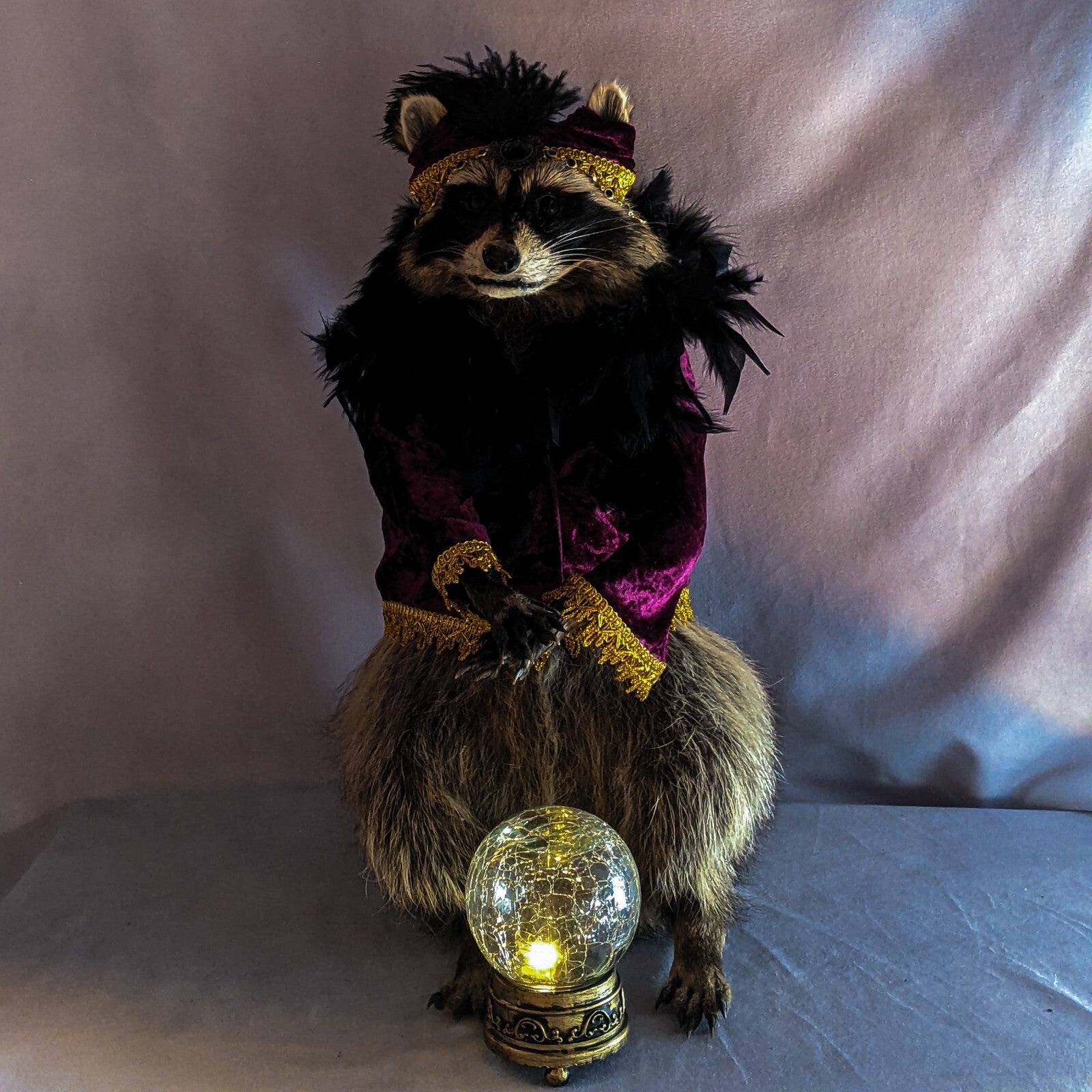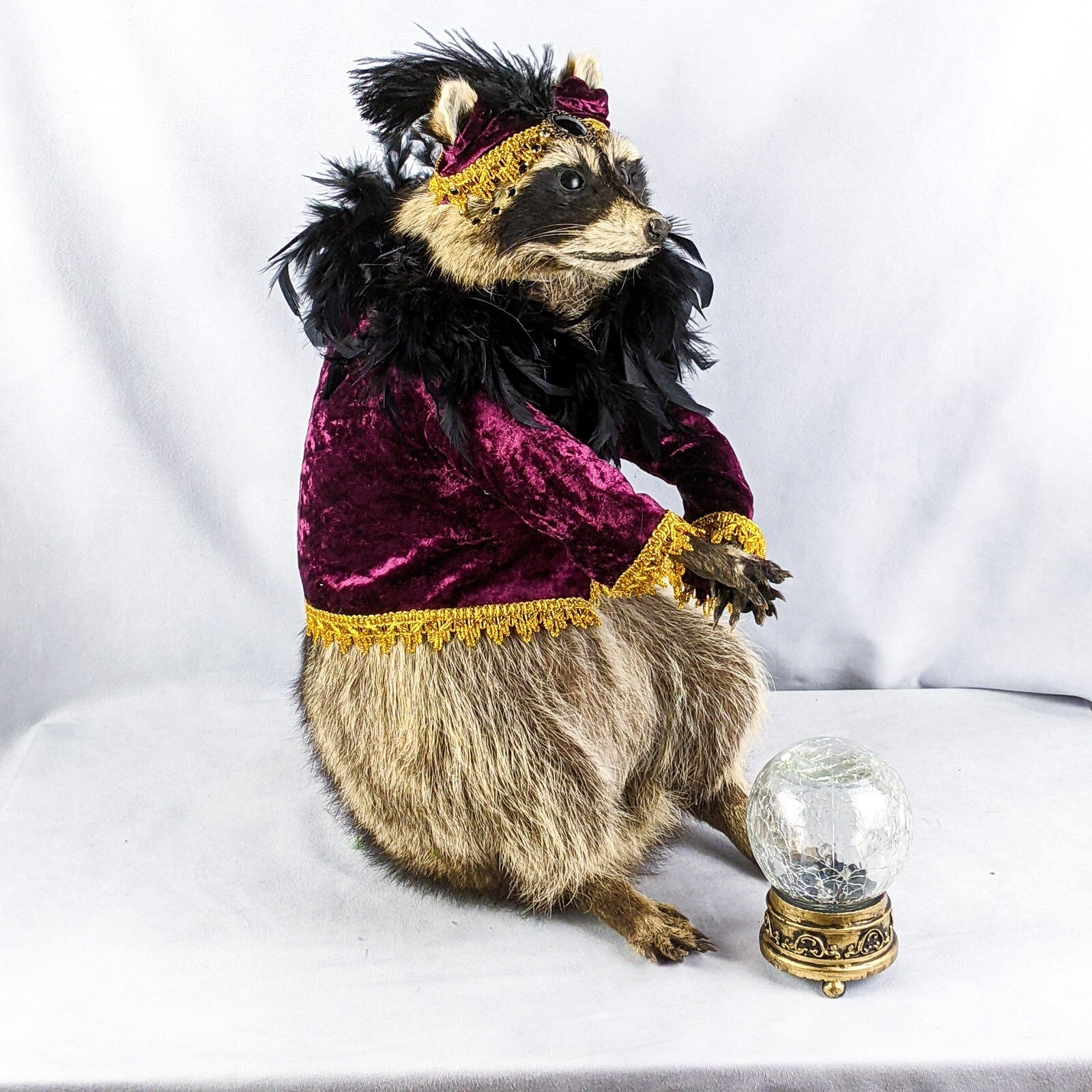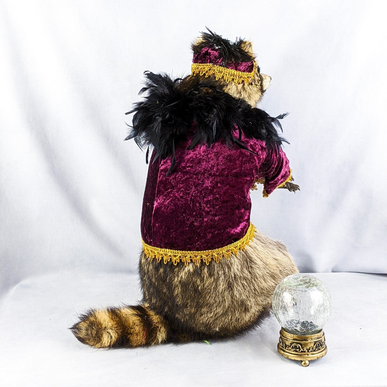 Who's been going through your trash at night? Look into Wendy's crystal ball and it might tell you all! This Fortune Teller Racoon has a fabulous hat, a custom made purple velvet top with a feathery boa, and a very nice, REAL and heavy crystal ball on a stand that lights up. She's a big girl standing approx. 21 1/2" x 19" x 10". She's a spooky statement piece all year long.