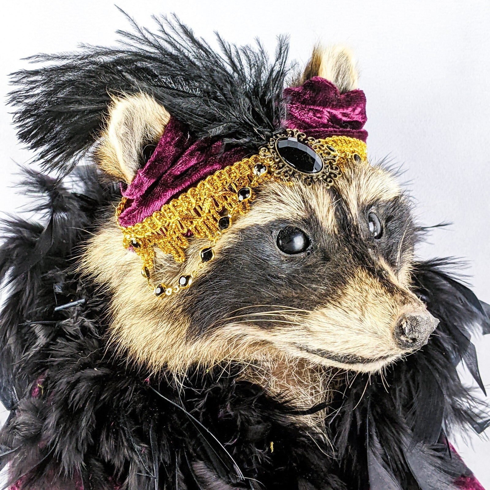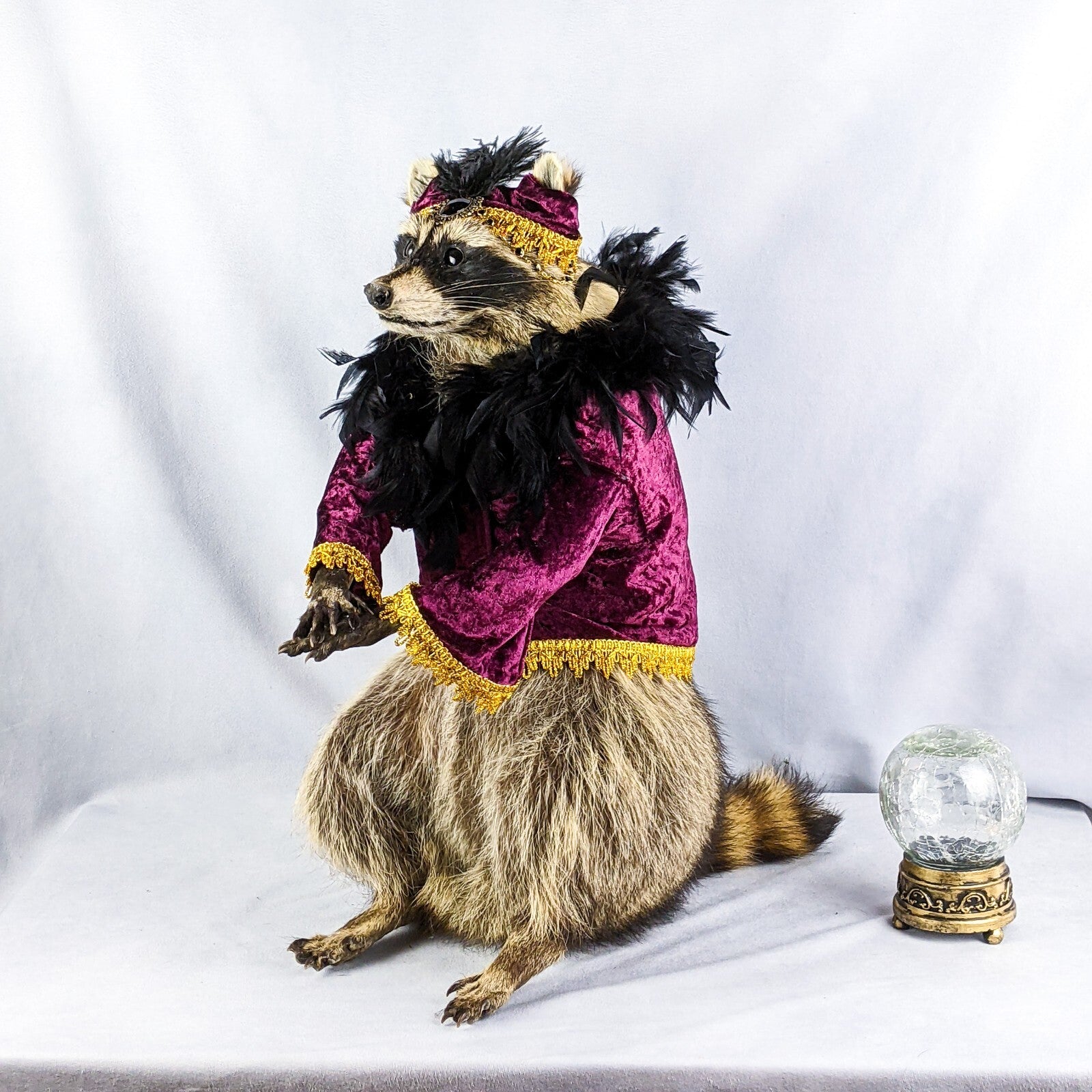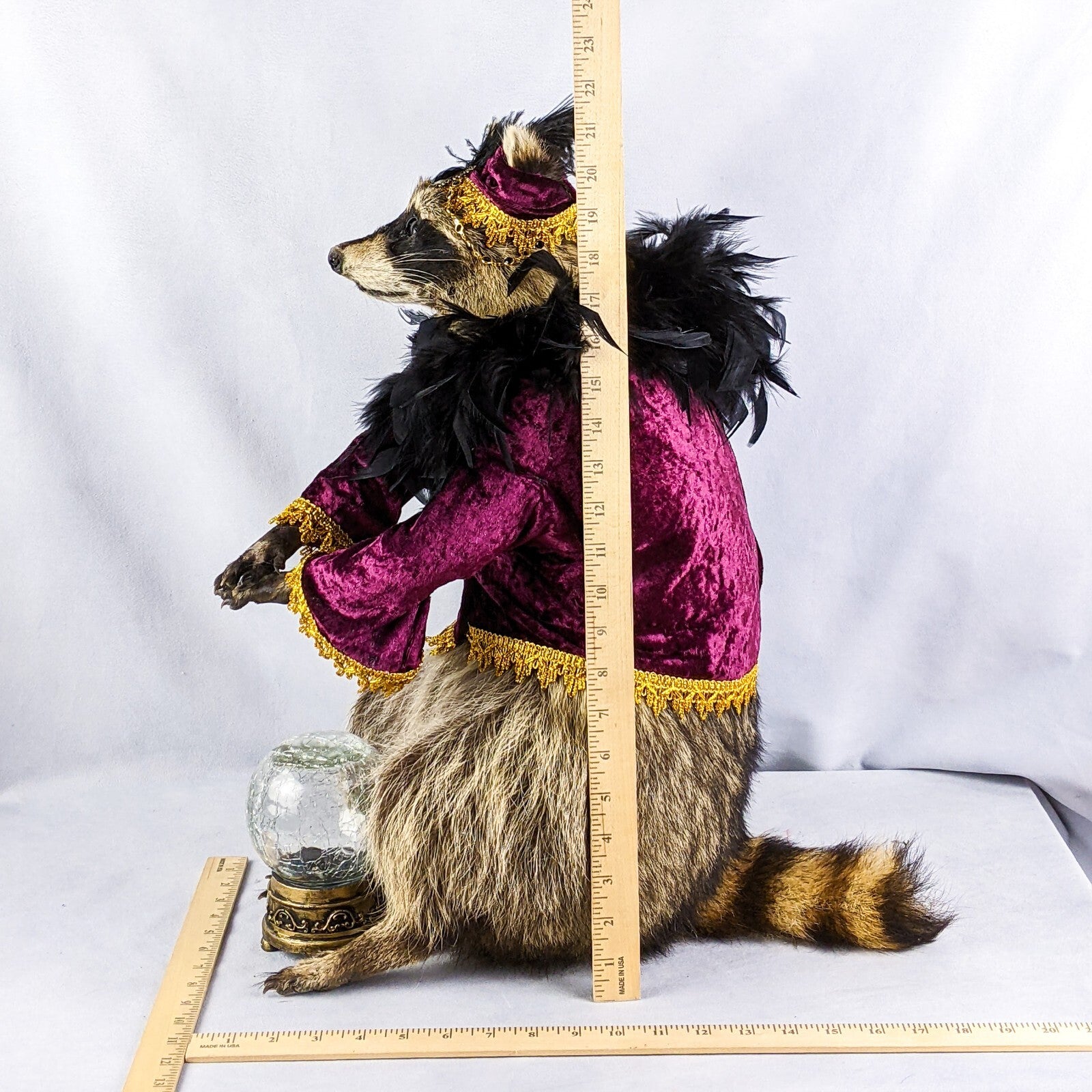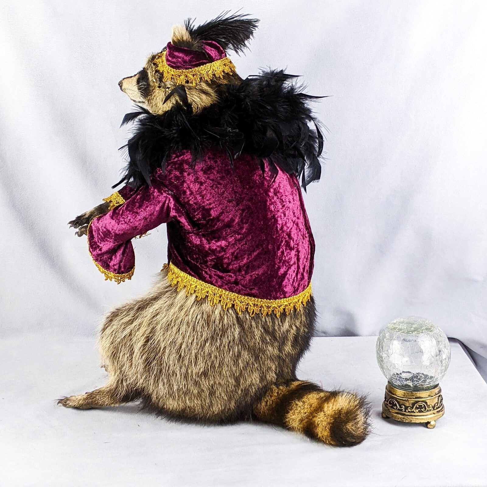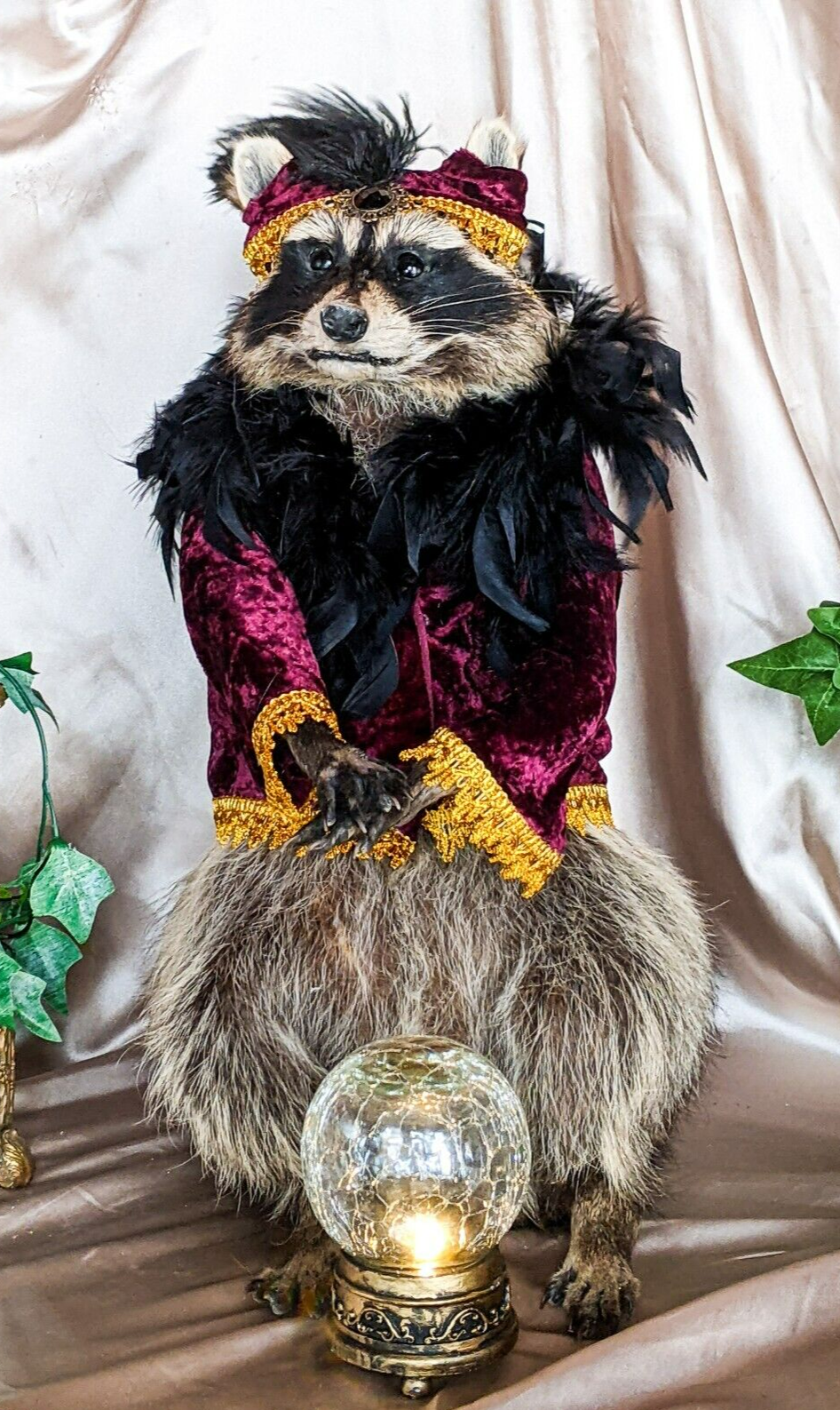 Who's been going through your trash at night? Look into Wendy's crystal ball and it might tell you all! This Fortune Teller Racoon has a fabulous hat, a custom made purple velvet top with a feathery boa, and a very nice, REAL and heavy crystal ball on a stand that lights up. She's a big girl standing approx. 21 1/2" x 19" x 10". She's a spooky statement piece all year long.
