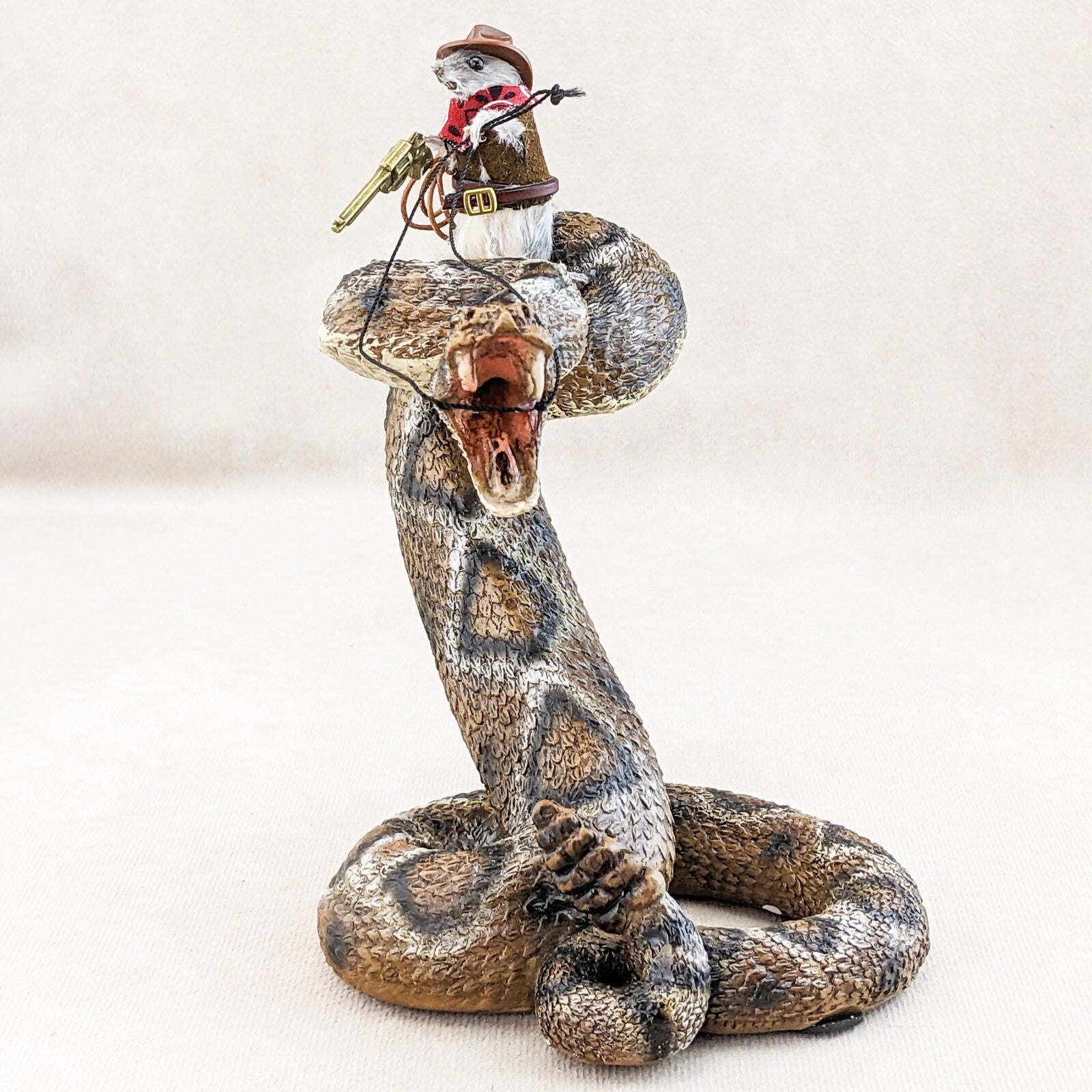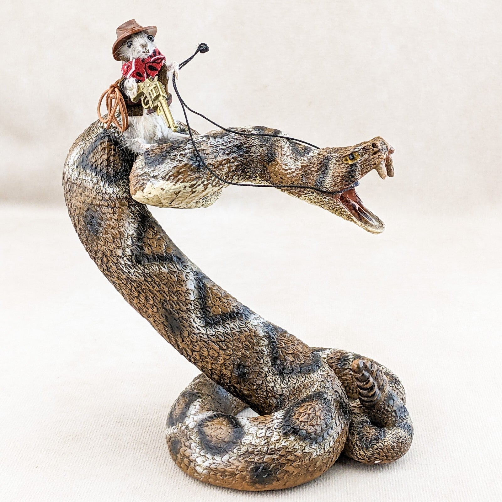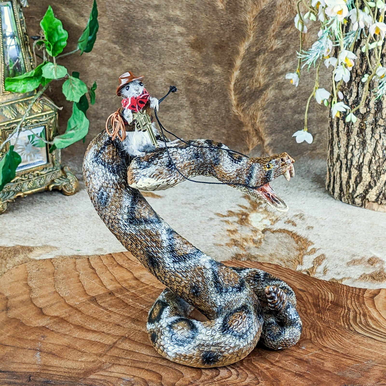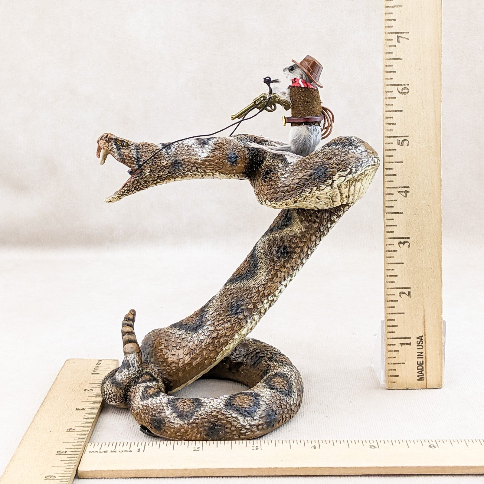 "Rattle Rick" is what they call him (taxidermy Mouse) and he is riding this wild rattlesnake (made of resin) like a champ! He's sporting his cowboy hat, bandana, belt holding his lasso, and has his gun ready to go! This would be a great shelf sitter and conversation piece! Definitely will make your friends smile! The dimensions of the snake are approx: 6 3/4" x 4 1/2" x 5 1/2"