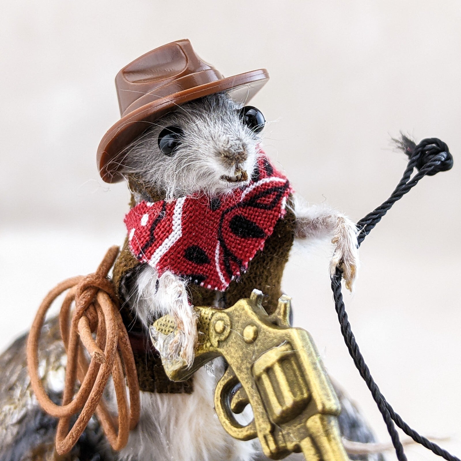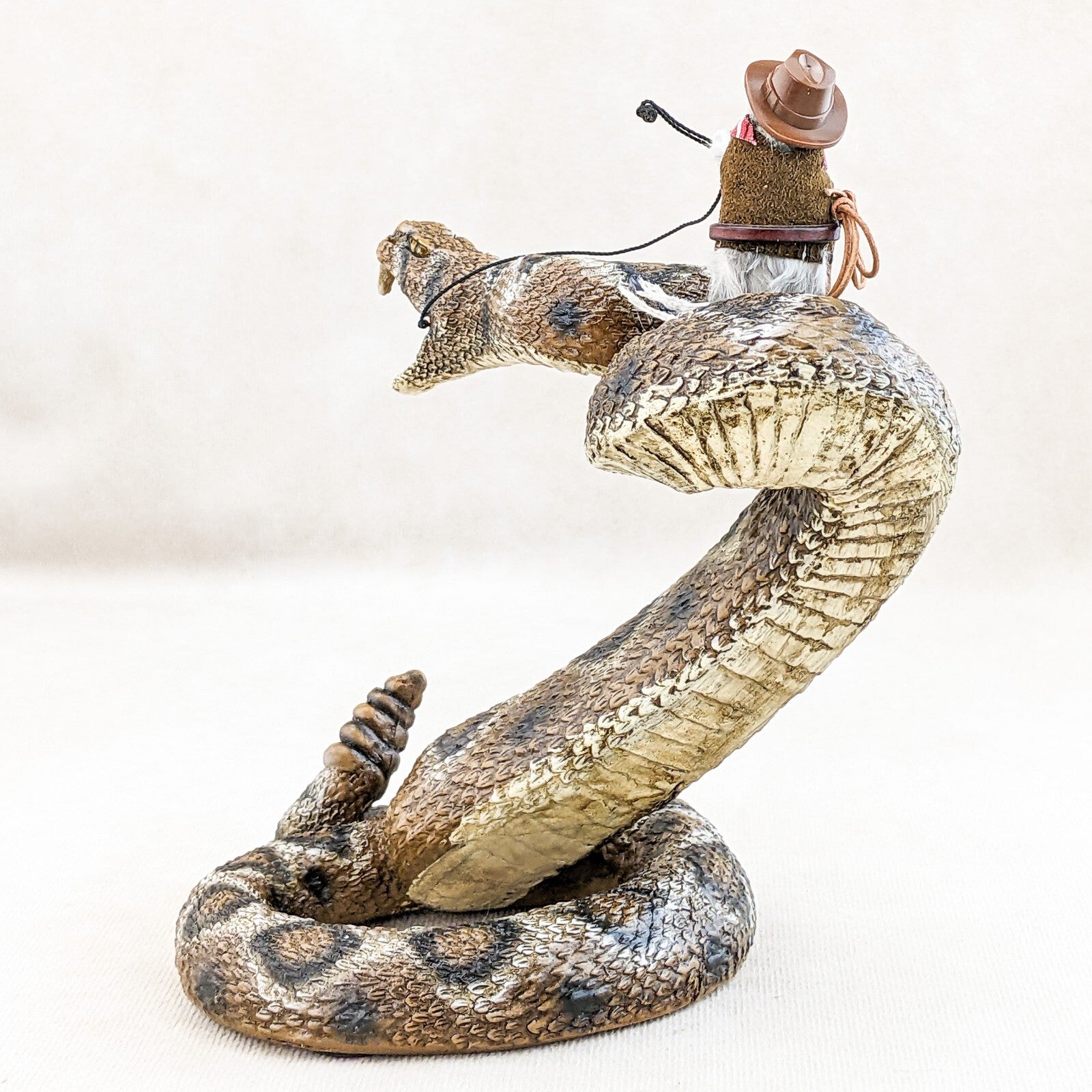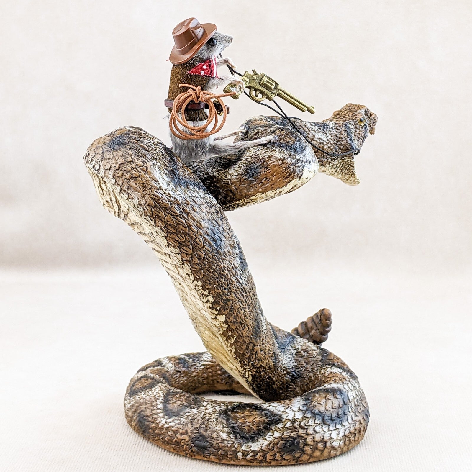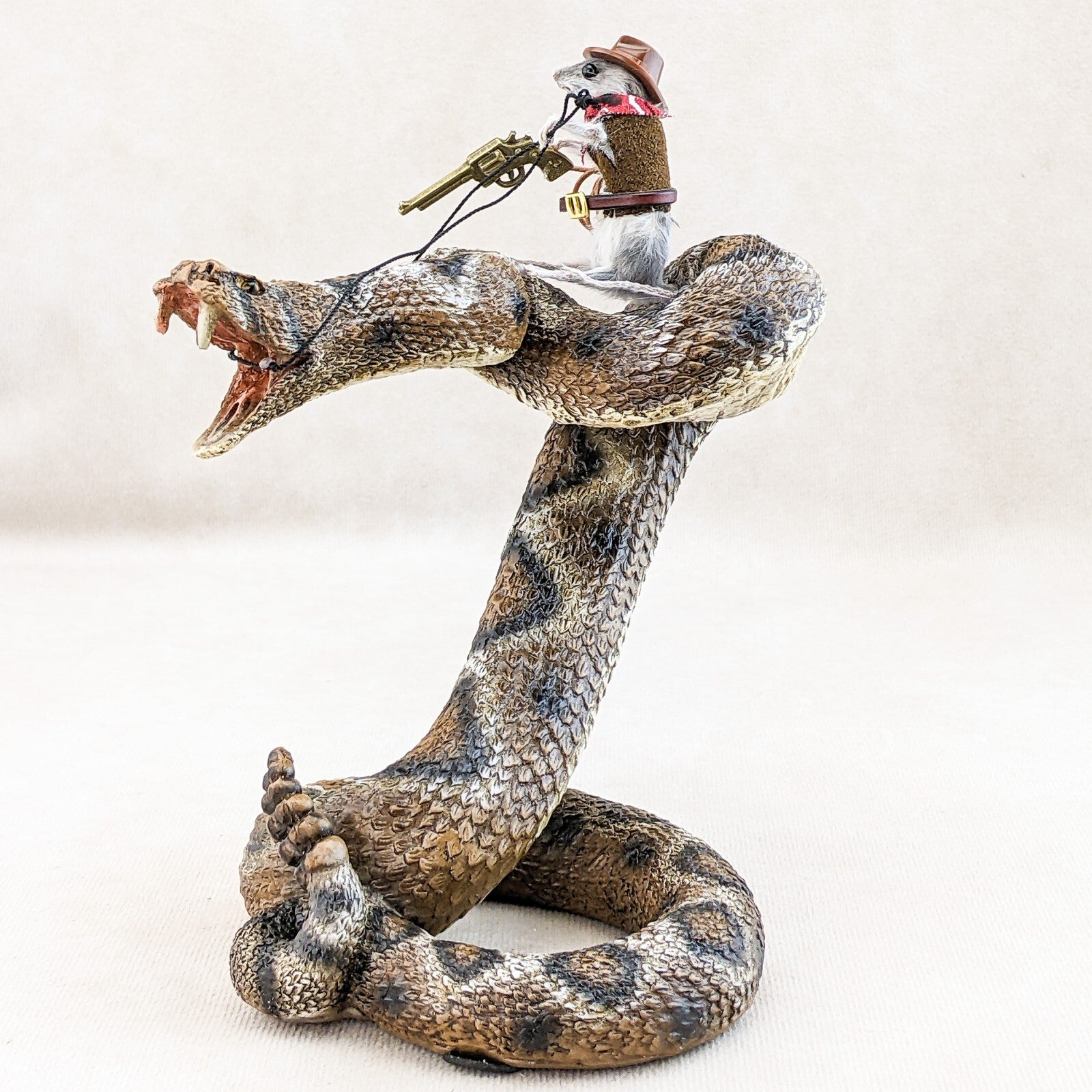 "Rattle Rick" is what they call him (taxidermy Mouse) and he is riding this wild rattlesnake (made of resin) like a champ! He's sporting his cowboy hat, bandana, belt holding his lasso, and has his gun ready to go! This would be a great shelf sitter and conversation piece! Definitely will make your friends smile! The dimensions of the snake are approx: 6 3/4" x 4 1/2" x 5 1/2"