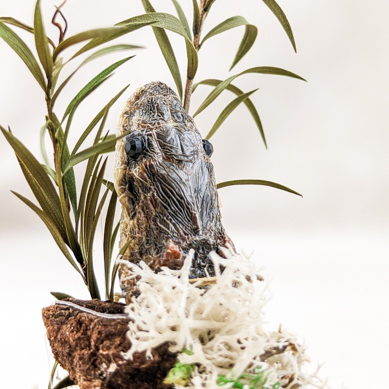 z38d #4 This is a nice display of a common Red banded snake head. He is displayed on wood in a glass dome display with a black base and has preserved fern and moss surrounding. This would be a great addition to any collection and sure to attract some attention! This is the specimen you will be receiving so please check out the pictures! This display is approx. 2 3/4 x 2".