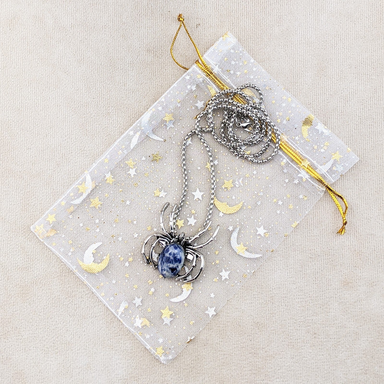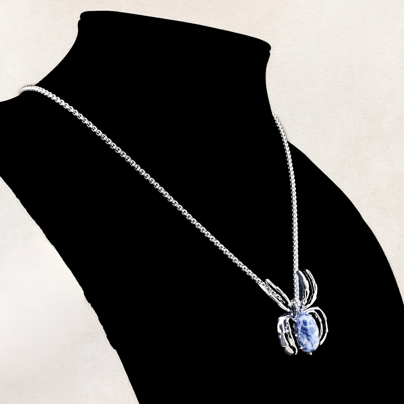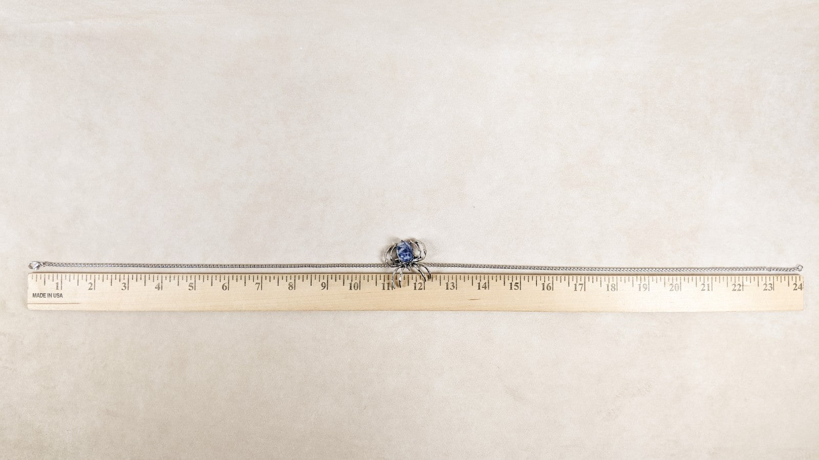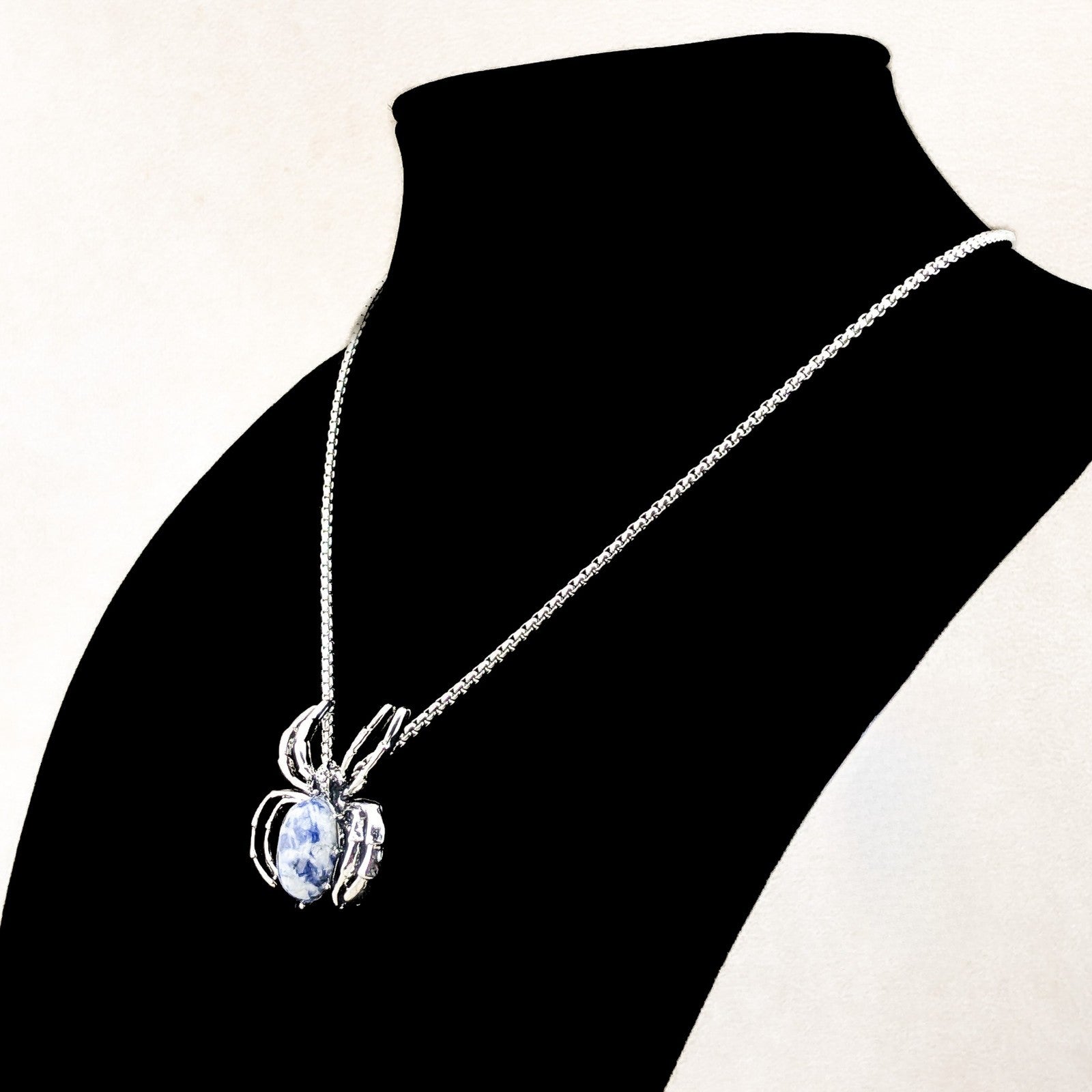 u63k #4 If you like spiders you are going to love this beauty! Large spider pin brooch with a gleaming white and blue body! Silver tone in color metal chain necklace and brooch with a blue lapis stone center. Very highly reflective and a nice piece. This pin is approx. 1 1/2 x 1 1/2 with a 24" chain.