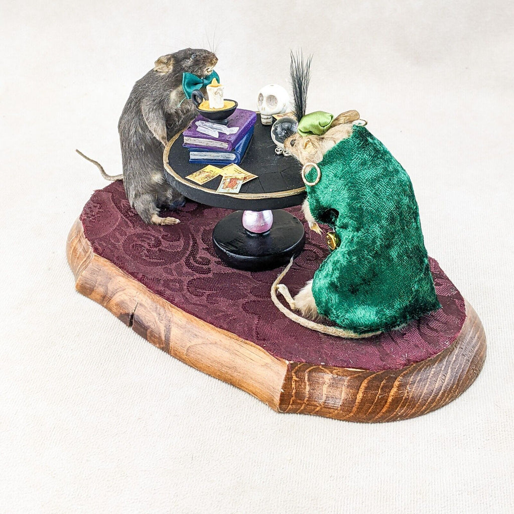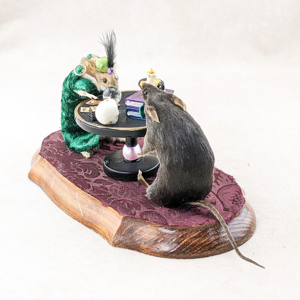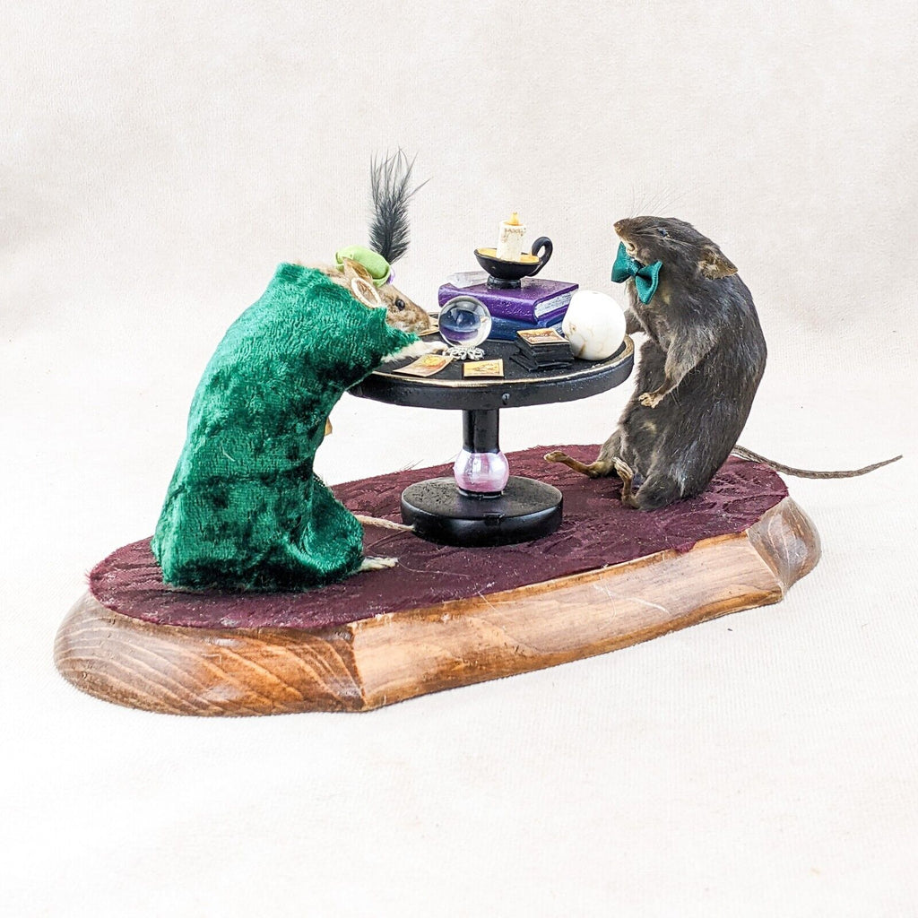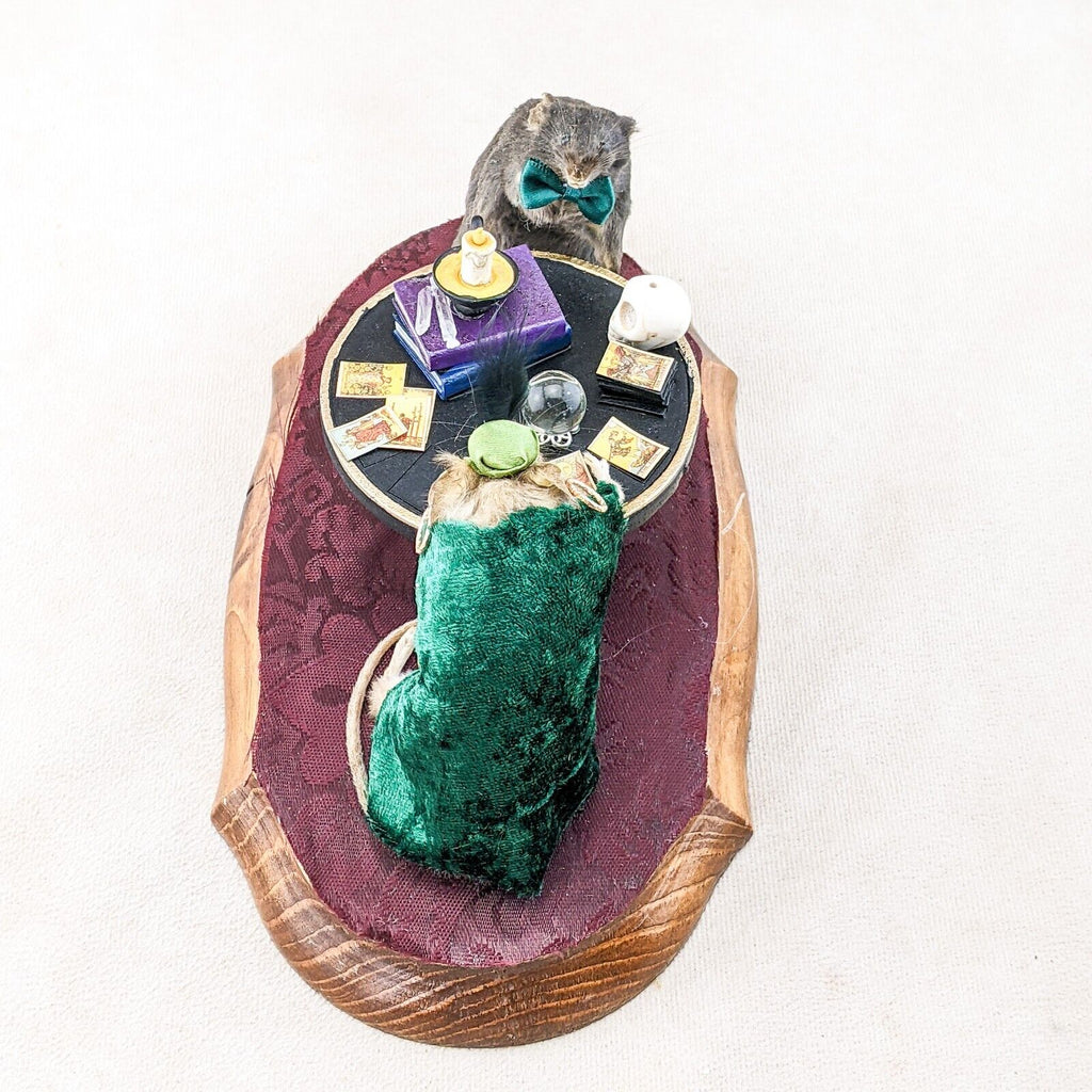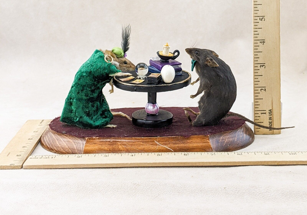 Madame Sylvia Squeak has her tarot cards, crystal ball, crystals, spell books and skull. Henry is wearing his dapper hat and bow tie. They are displayed charmingly on a wooden base. This is the perfect piece for any collector of anthropomorphic taxidermy, paranormal enthusiasts, and fans of Victorian Spiritualism.  Display is approx. 10 1/2" x 5" x 5"