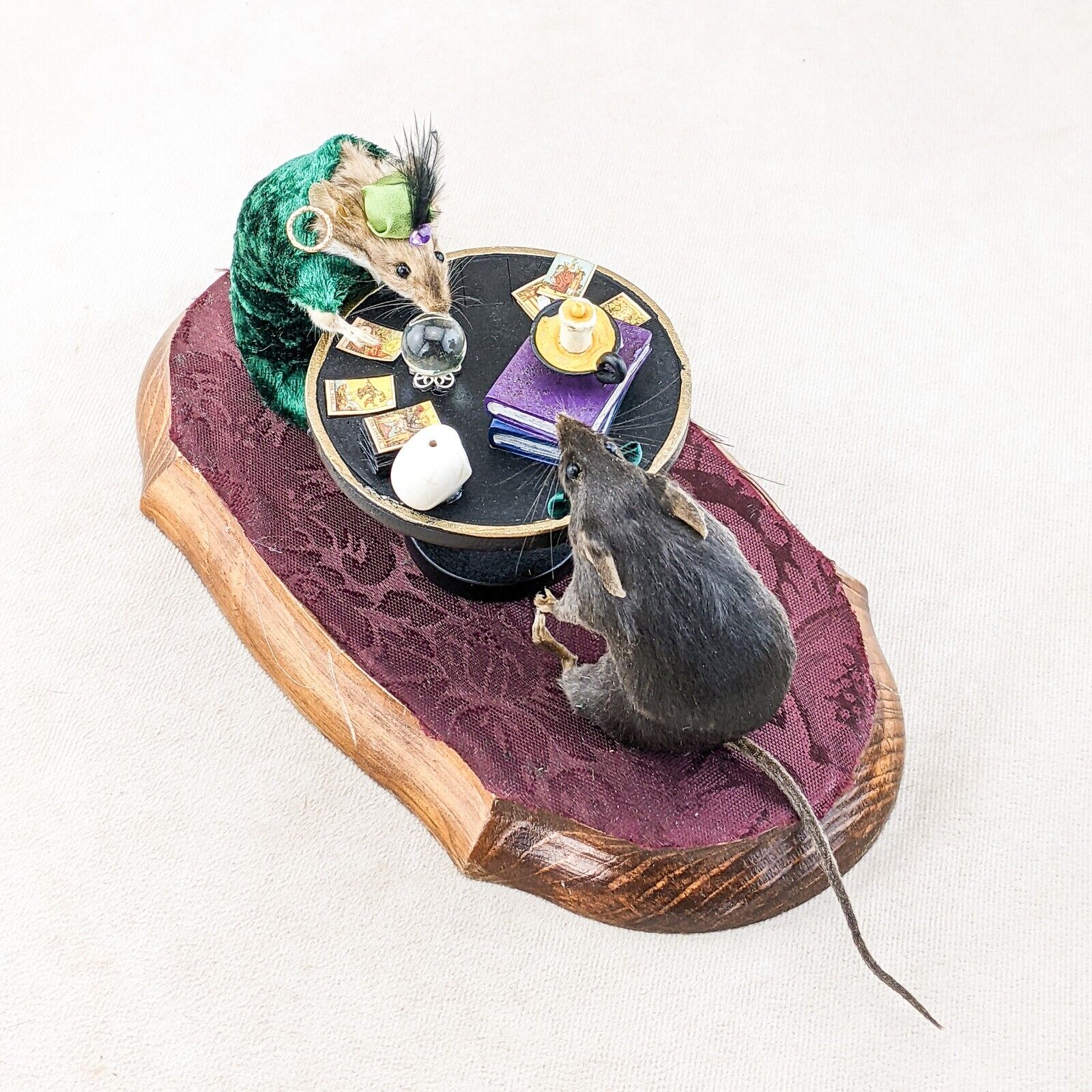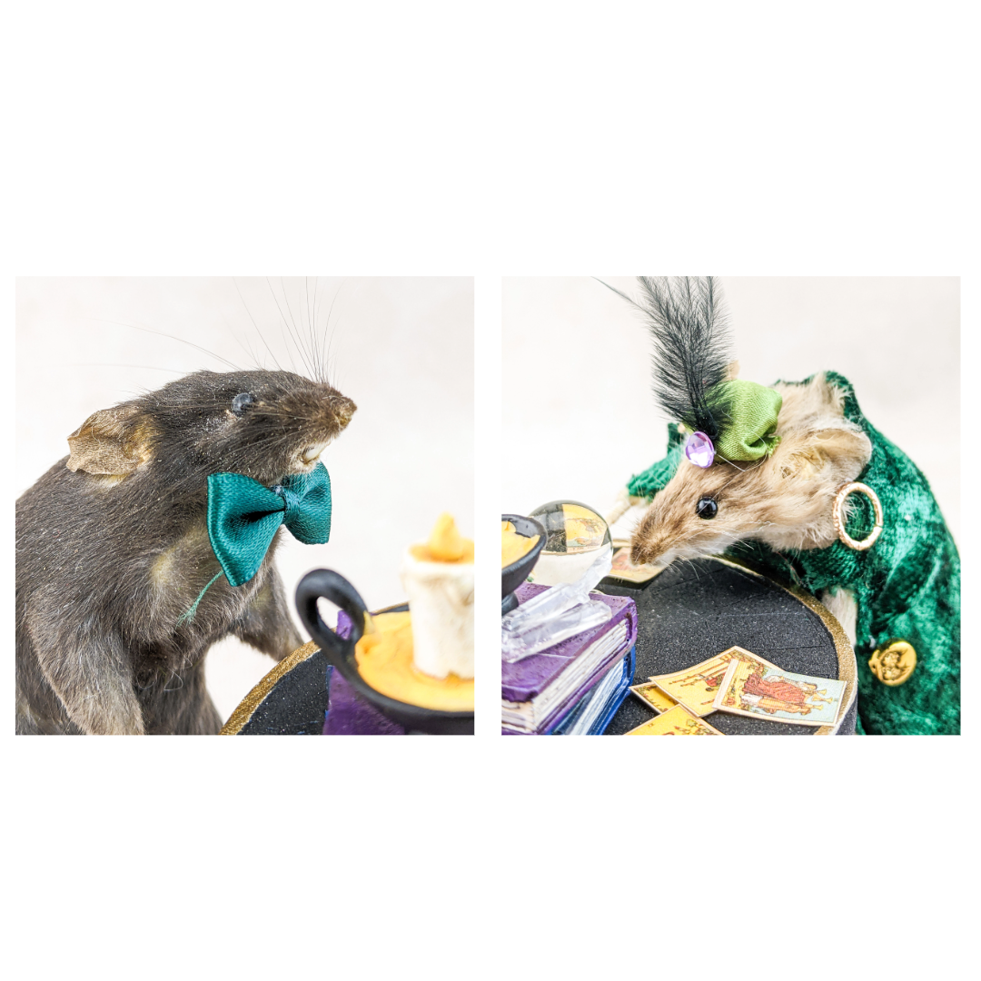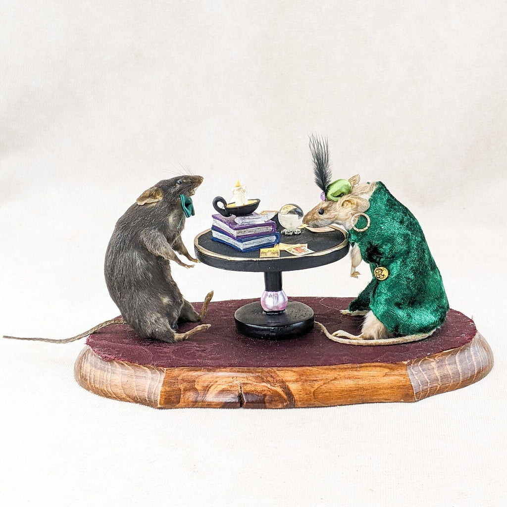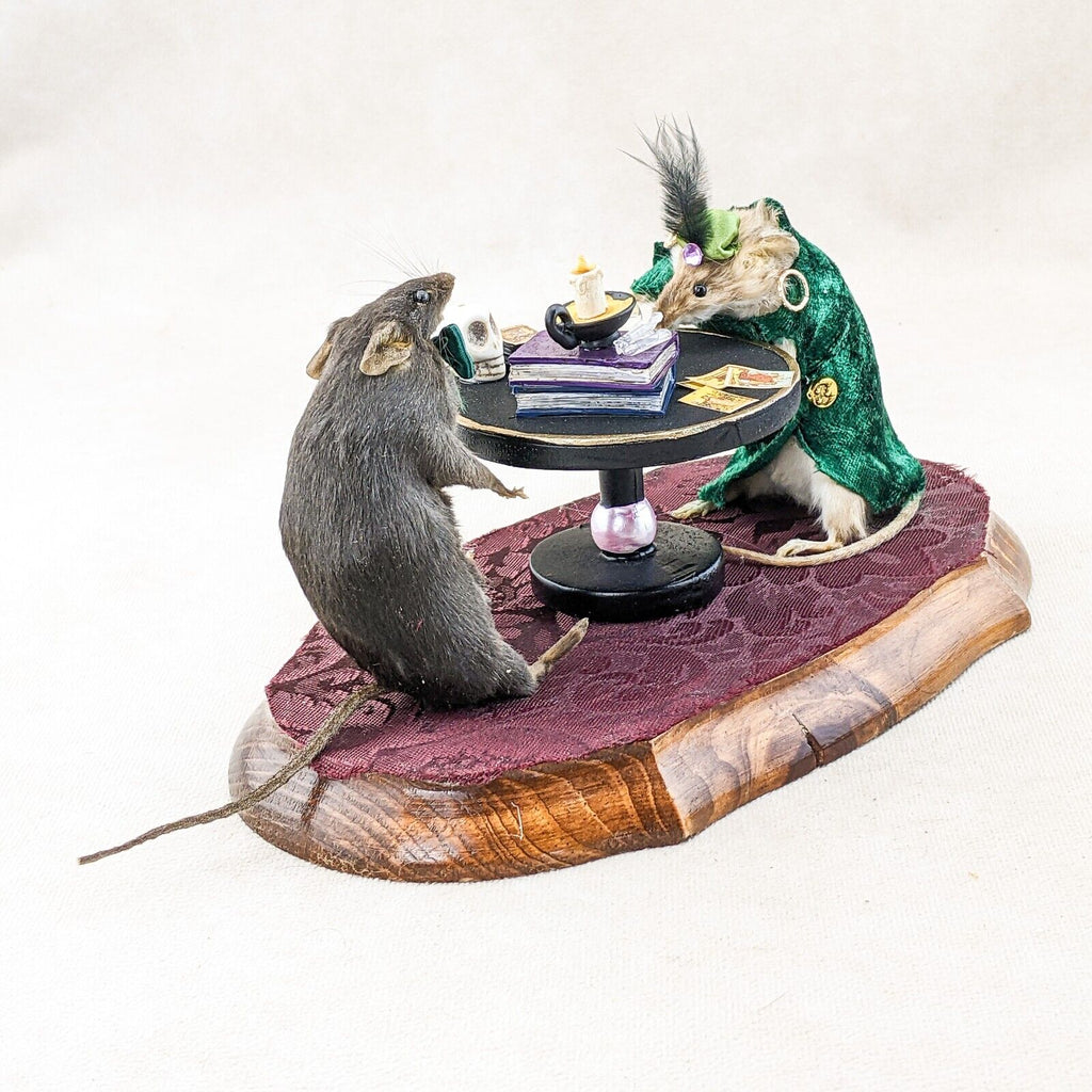Madame Sylvia Squeak has her tarot cards, crystal ball, crystals, spell books and skull. Henry is wearing his dapper hat and bow tie. They are displayed charmingly on a wooden base. This is the perfect piece for any collector of anthropomorphic taxidermy, paranormal enthusiasts, and fans of Victorian Spiritualism.  Display is approx. 10 1/2" x 5" x 5"