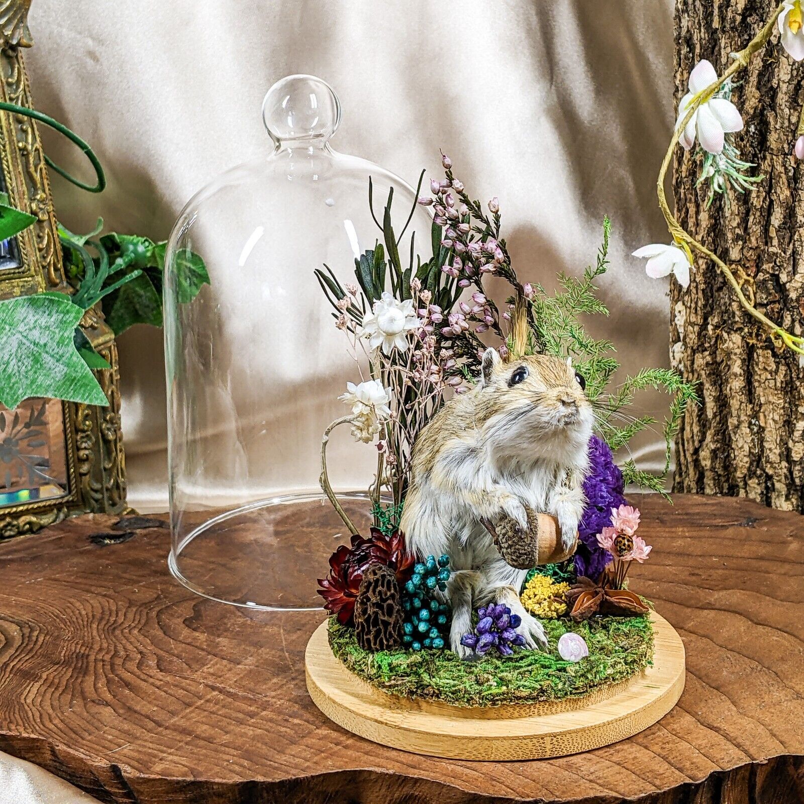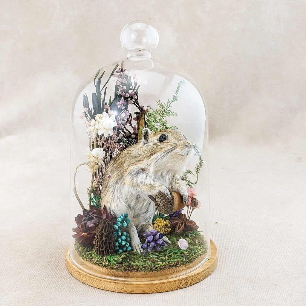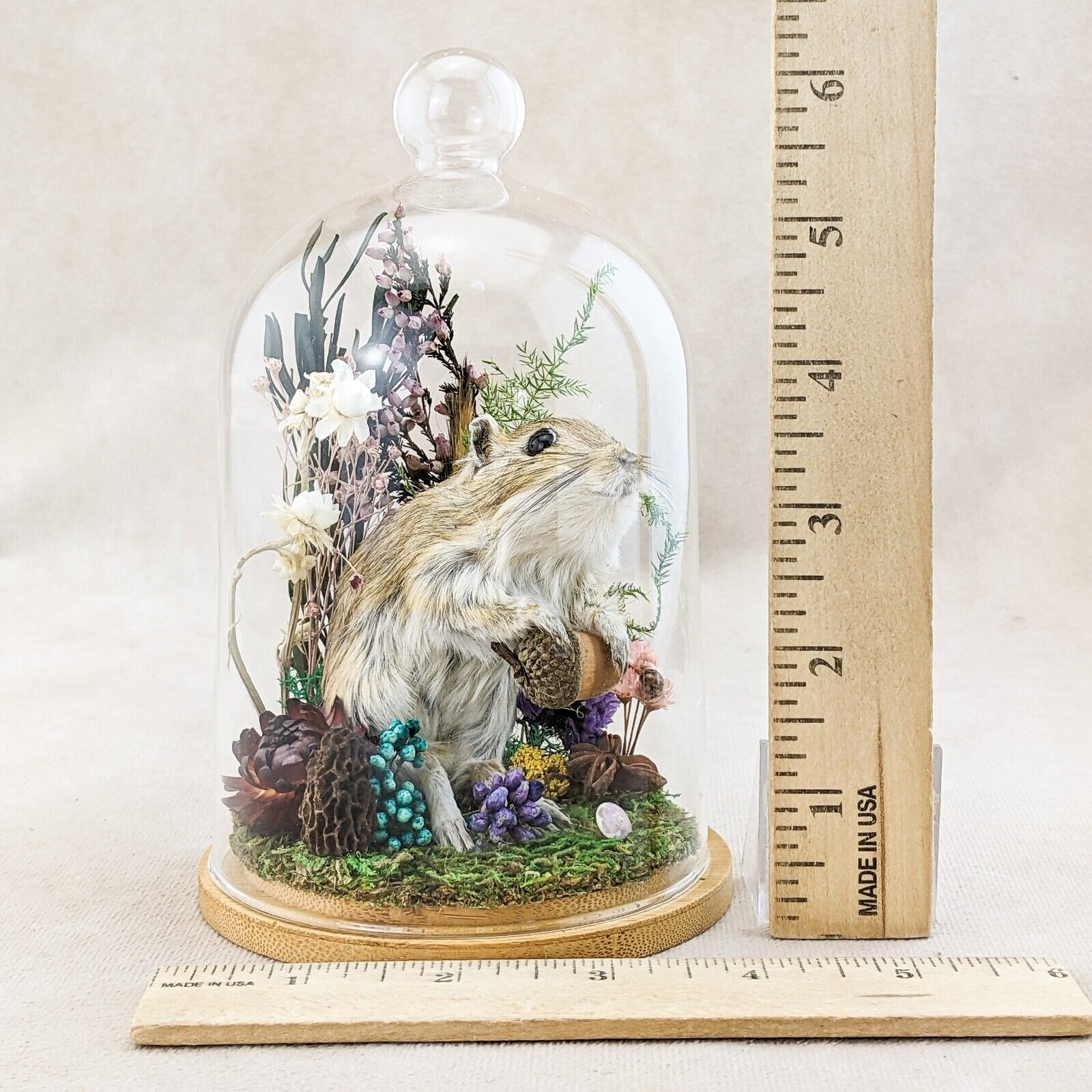 This unique glass dome display showcases a stunning gerbil specimen from Scenic City Oddities. The dome is made of high-quality natural glass and the display features intricate details that bring out the beauty of this small animal. The display is perfect for taxidermy collectors and gerbil or small animal enthusiasts alike, and would make a great addition to any home decor or taxidermy collection. This glass dome display is a one-of-a-kind piece that is sure to impress. The gerbil specimen is carefully preserved and displayed in a stunning manner, making it a great conversation starter. Whether you're looking for a unique gift or a loved one or simply want to add to your collection, this Gerbil surrounded by nature and displayed under glass is sure to be a hit.