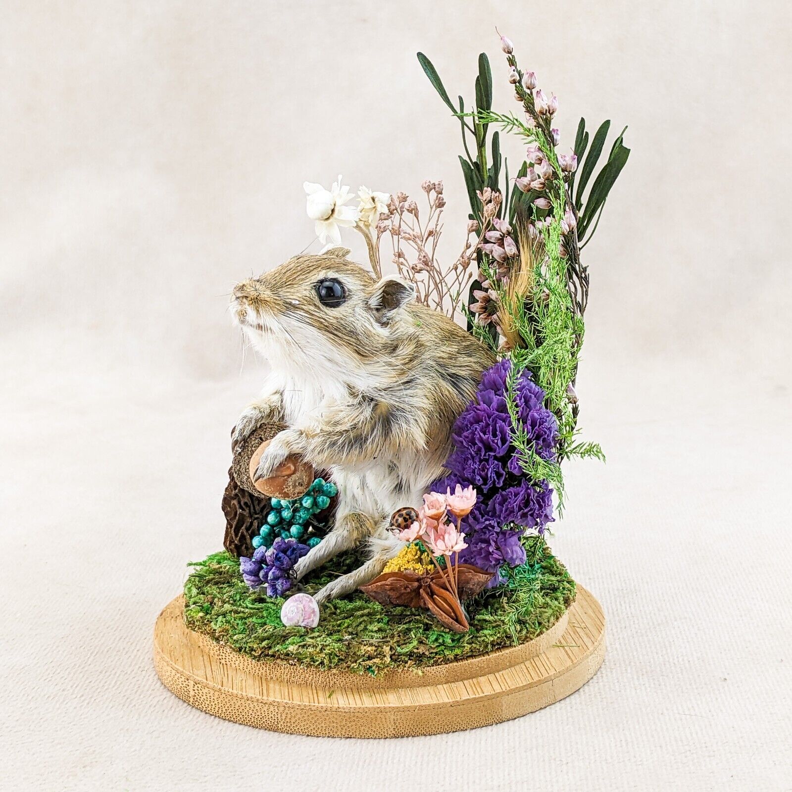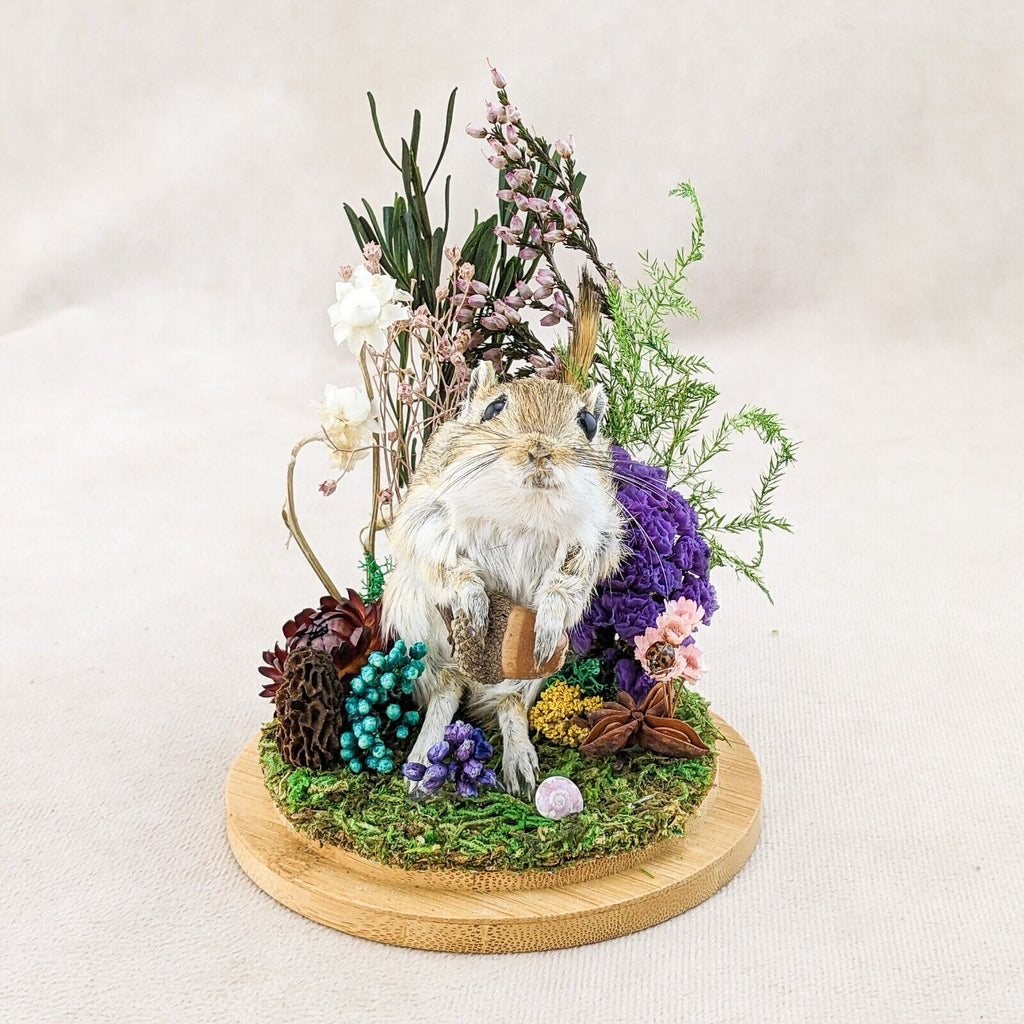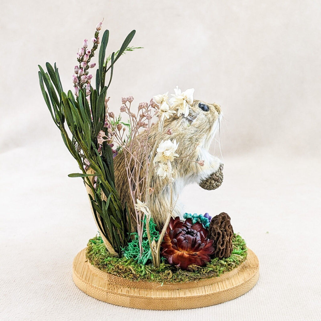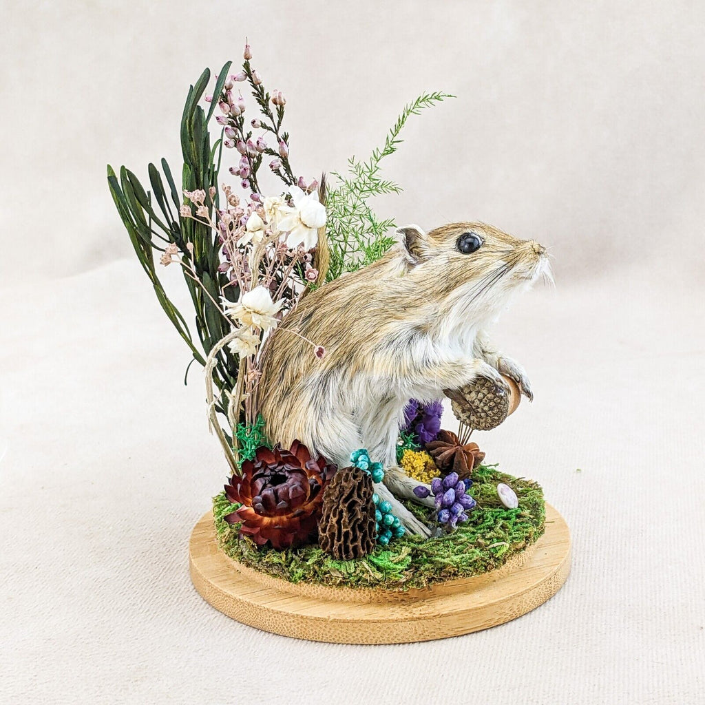 This unique glass dome display showcases a stunning gerbil specimen from Scenic City Oddities. The dome is made of high-quality natural glass and the display features intricate details that bring out the beauty of this small animal. The display is perfect for taxidermy collectors and gerbil or small animal enthusiasts alike, and would make a great addition to any home decor or taxidermy collection. This glass dome display is a one-of-a-kind piece that is sure to impress. The gerbil specimen is carefully preserved and displayed in a stunning manner, making it a great conversation starter. Whether you're looking for a unique gift or a loved one or simply want to add to your collection, this Gerbil surrounded by nature and displayed under glass is sure to be a hit.