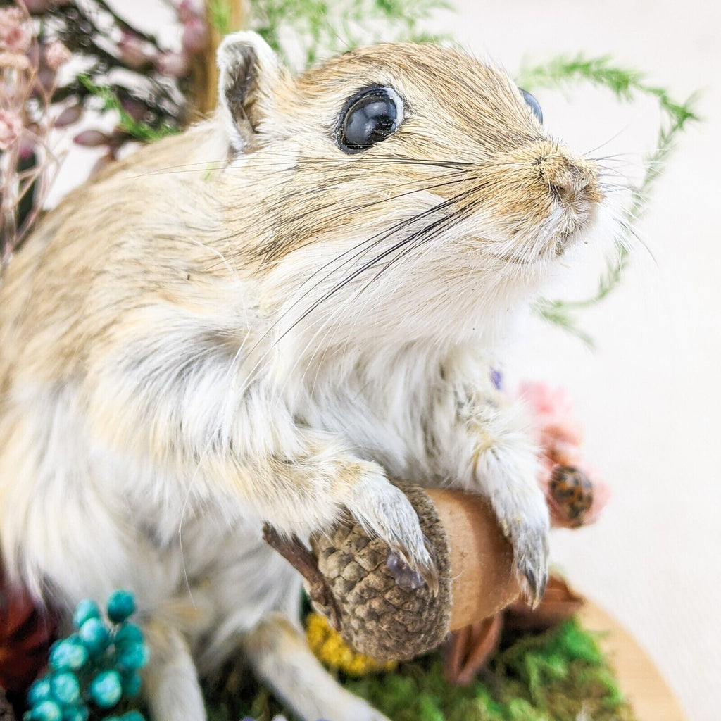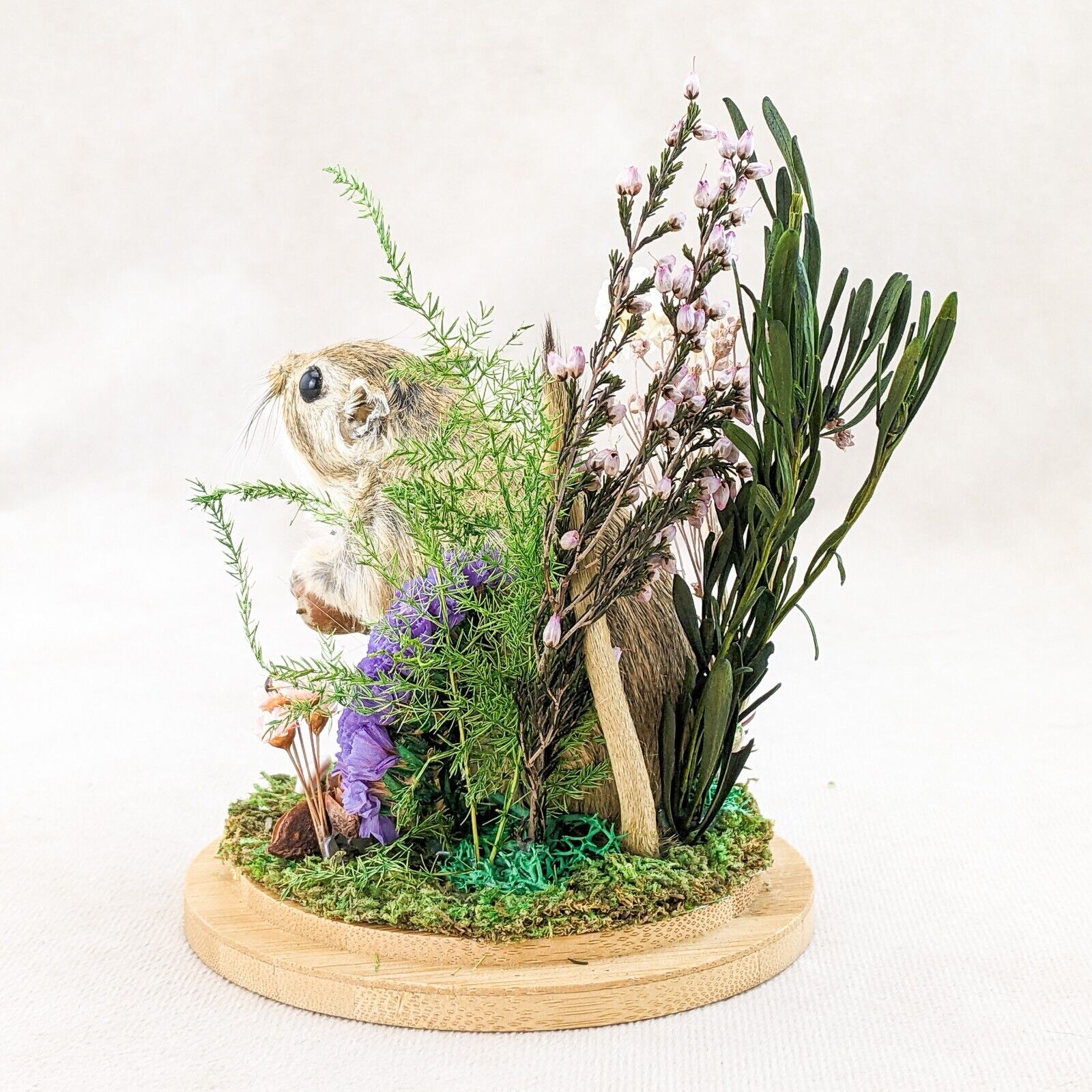 Check this guy out! This cute lil gerbil is holding an acorn in a glass dome decorated with preserved flowers, ferns, mosses, berries, nuts and other natural foliage. He is mounted to a wooden base and is has the cutest little face! This piece measure approx. 6 1/4 x 4"