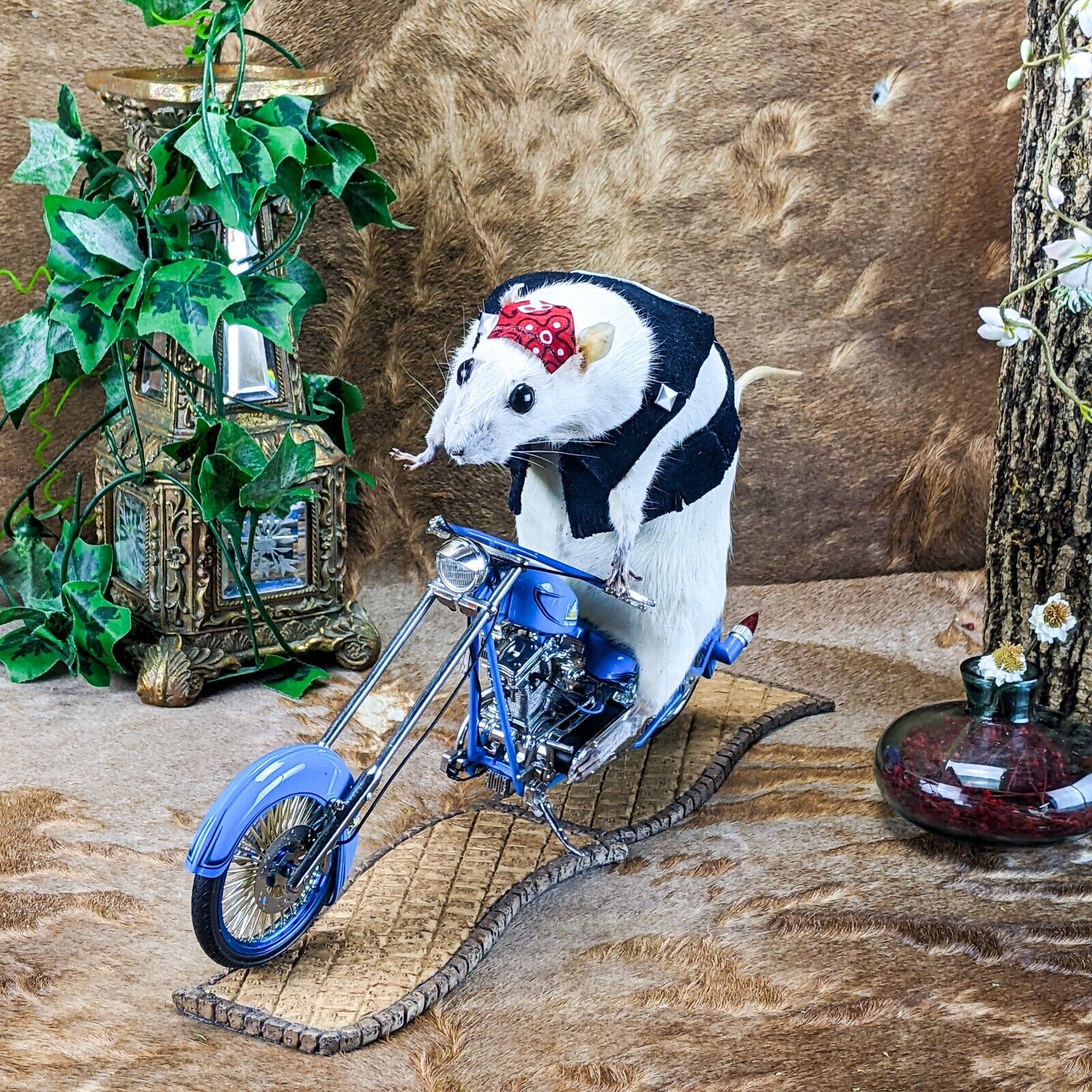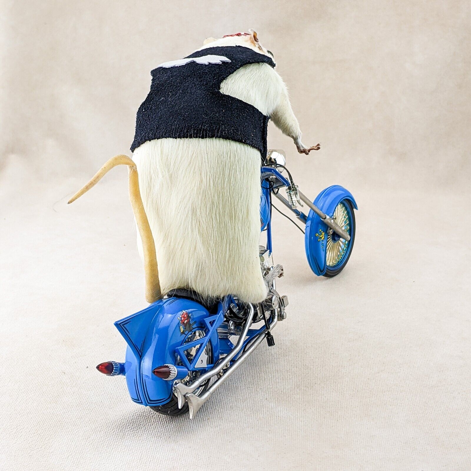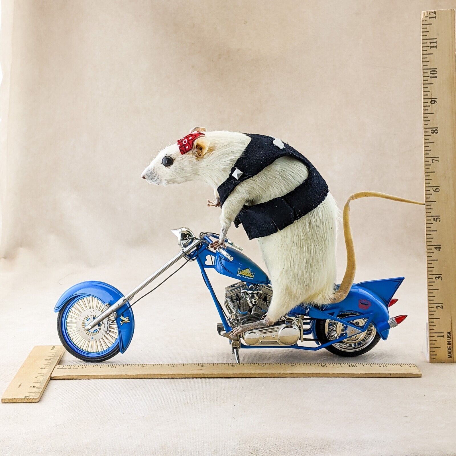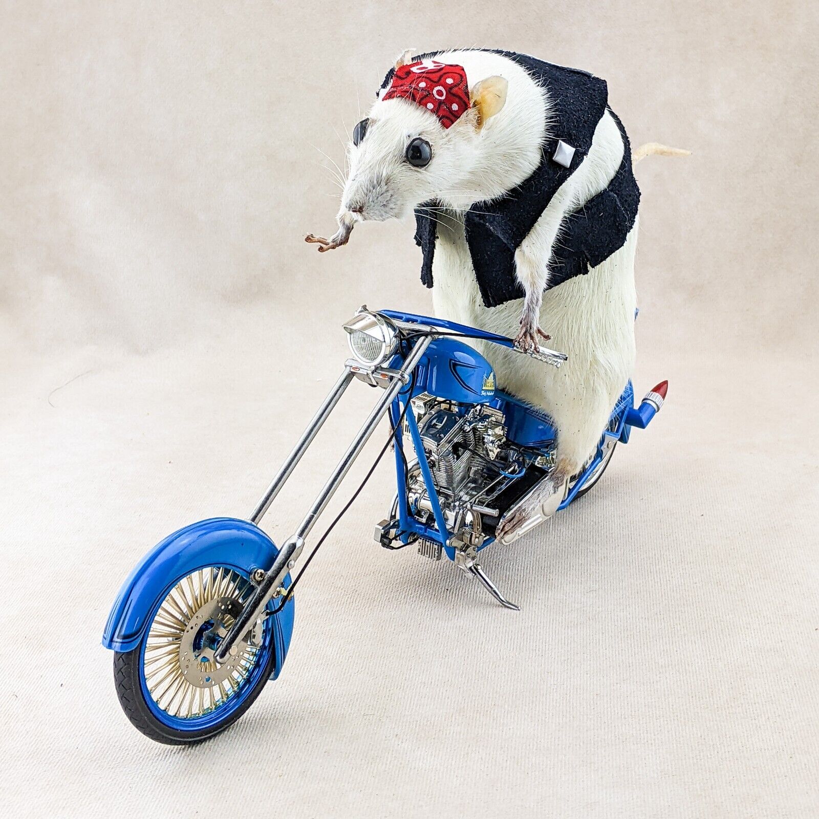 W221 #1.14 Taxidermy Rat Motorcycle Rider!  "Max" is ready for action!  He is on his bike and ready to go.  He is riding his blue cycle, has his black leather tasseled vest stitched with leather stitched on wings on the back and red bandanna for extra style!  He is in Illinois so there is no helmet law! He measures is approximately 12" x 8" x 3" and sits up using the bike's kickstand. This makes a great gift for the local motorcycle club or the rider in your family!