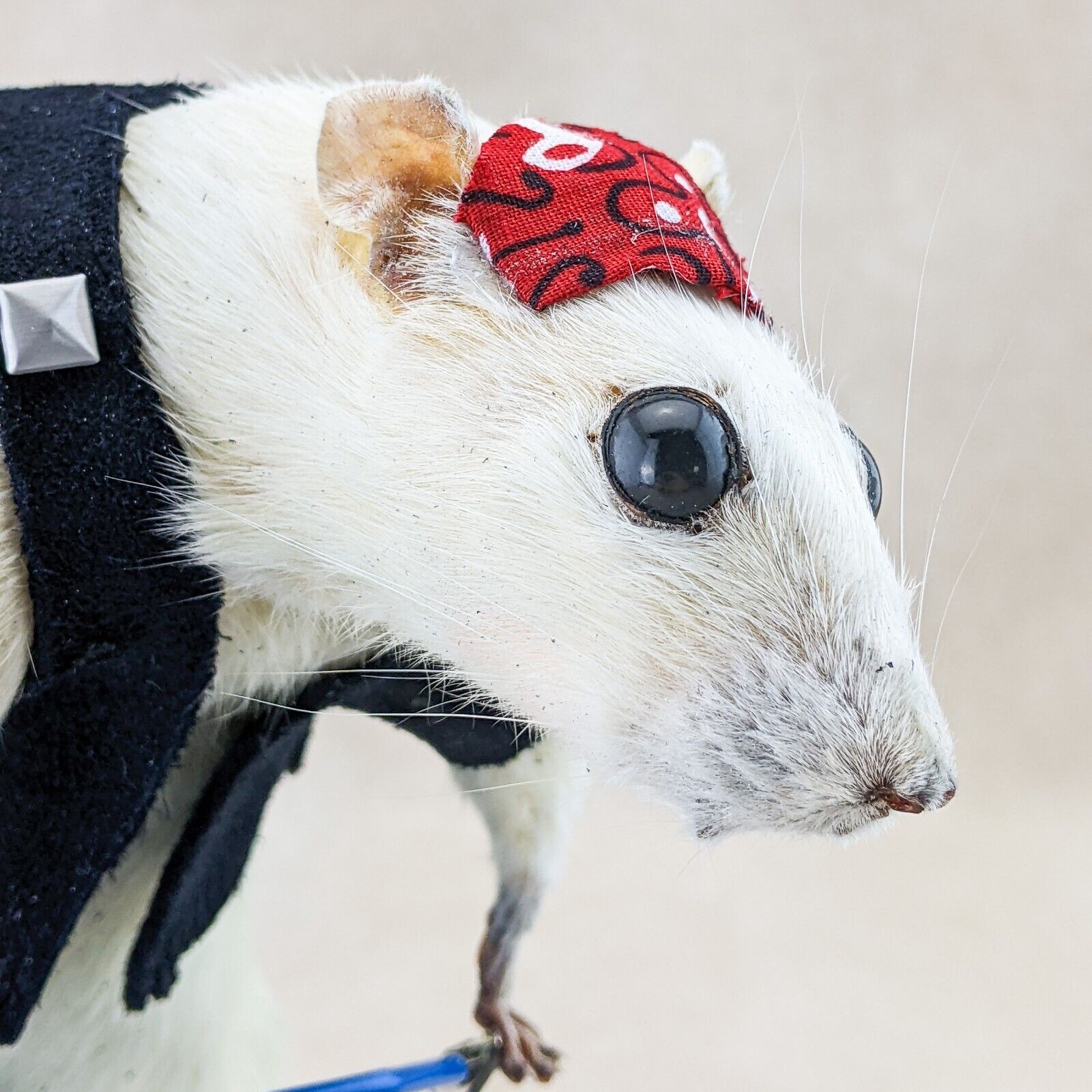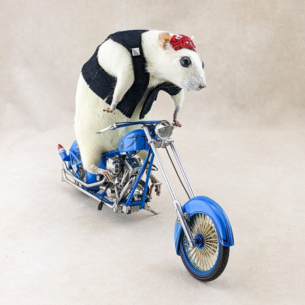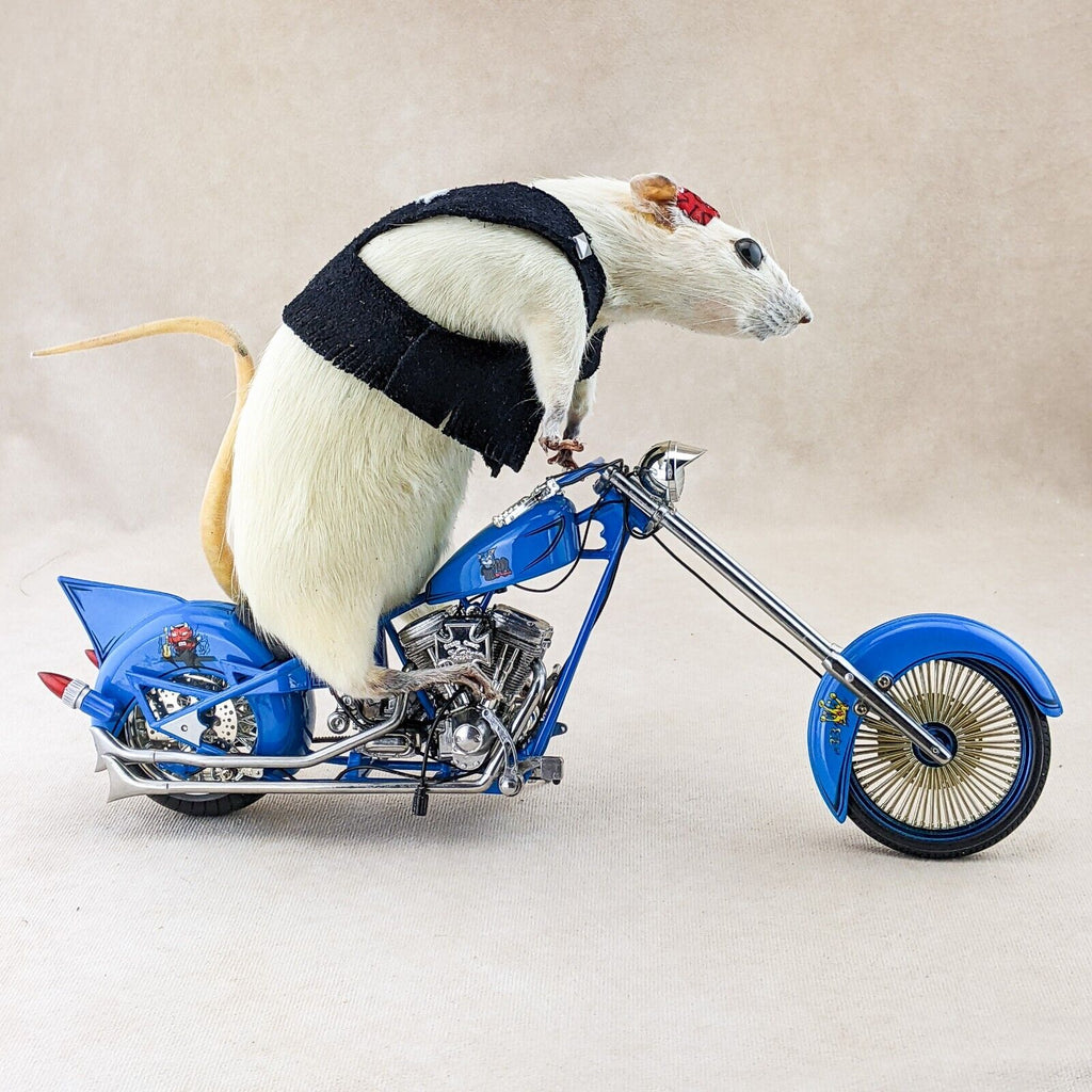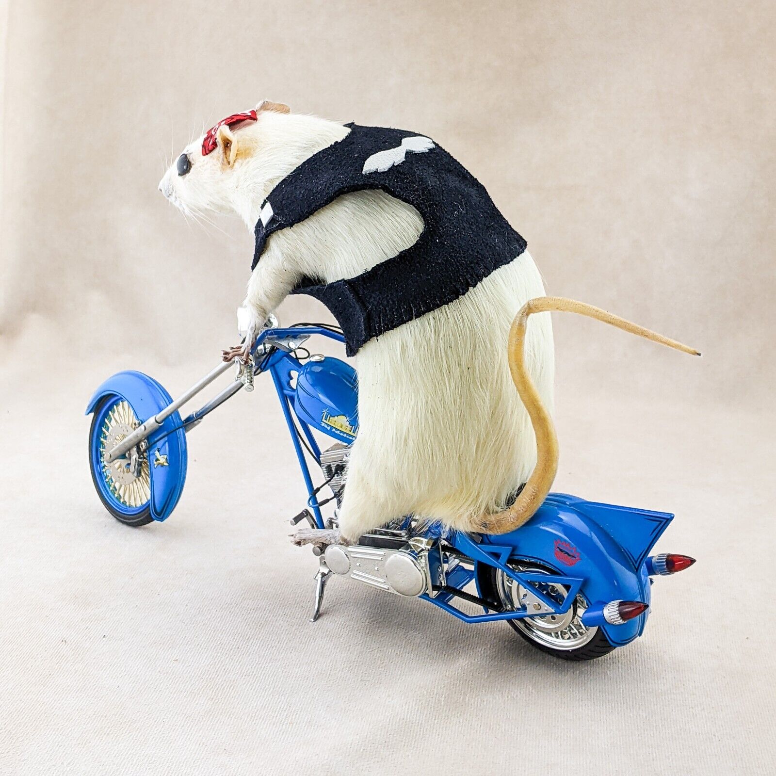 W221 #1.14 Taxidermy Rat Motorcycle Rider!  "Max" is ready for action!  He is on his bike and ready to go.  He is riding his blue cycle, has his black leather tasseled vest stitched with leather stitched on wings on the back and red bandanna for extra style!  He is in Illinois so there is no helmet law! He measures is approximately 12" x 8" x 3" and sits up using the bike's kickstand. This makes a great gift for the local motorcycle club or the rider in your family!