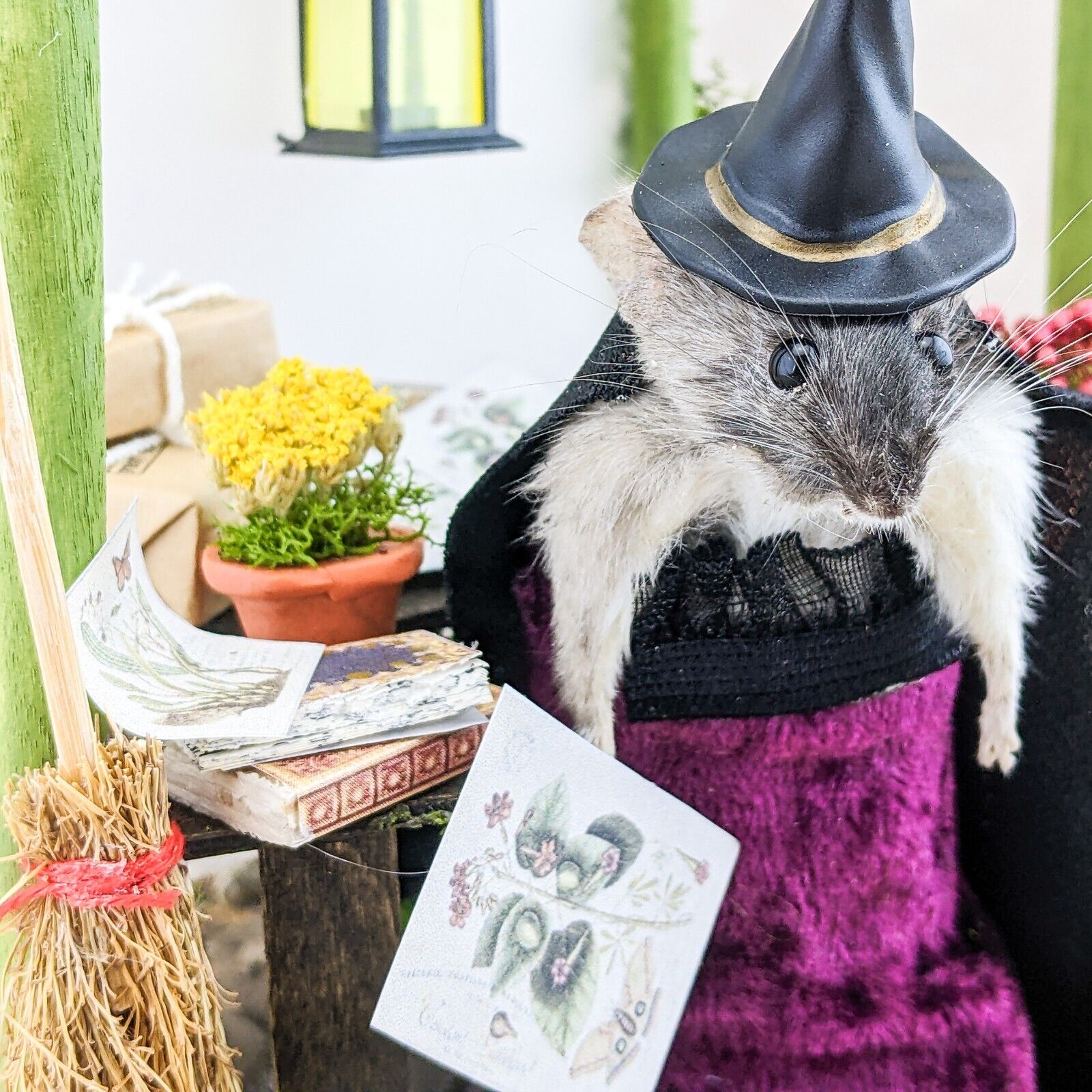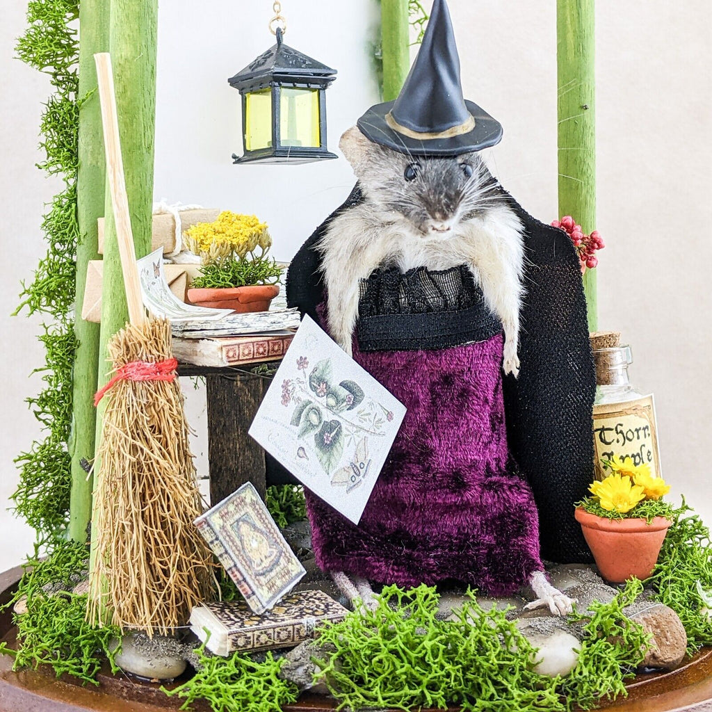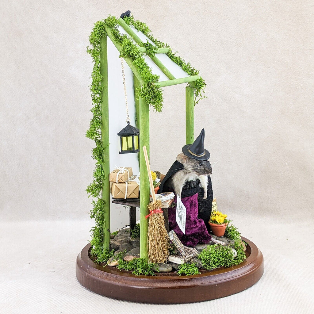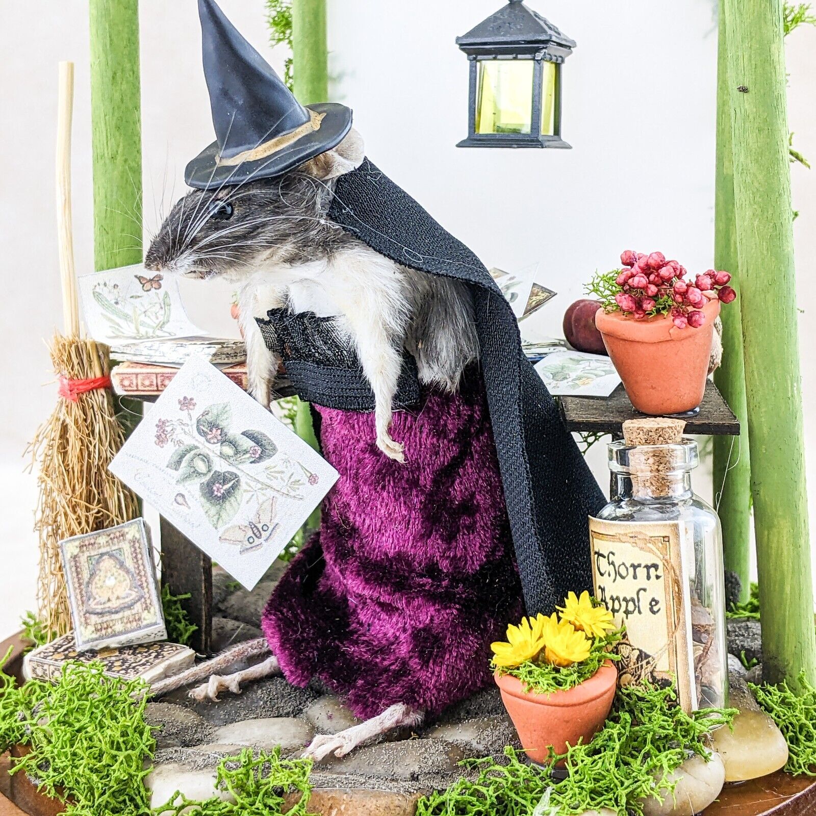 Welcome to the enchanting world of the taxidermy mouse witch in a greenhouse scene! This unique and whimsical display features a carefully preserved mouse witch surrounded by a magical garden setting. The base is adorned with river rocks crafted into a cobblestone floor, with moss lining the edges for an added touch of nature.