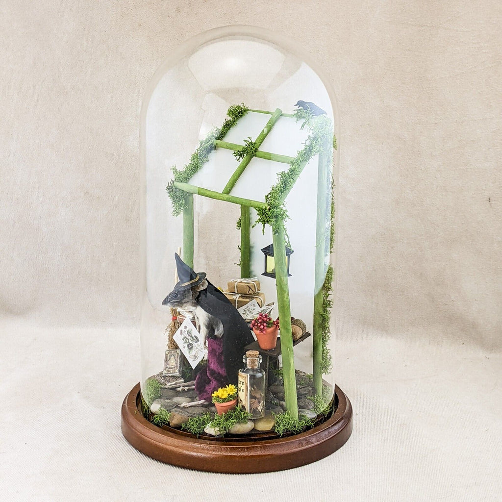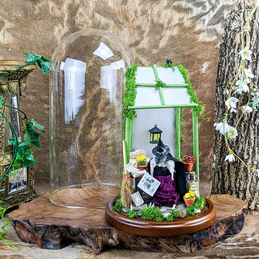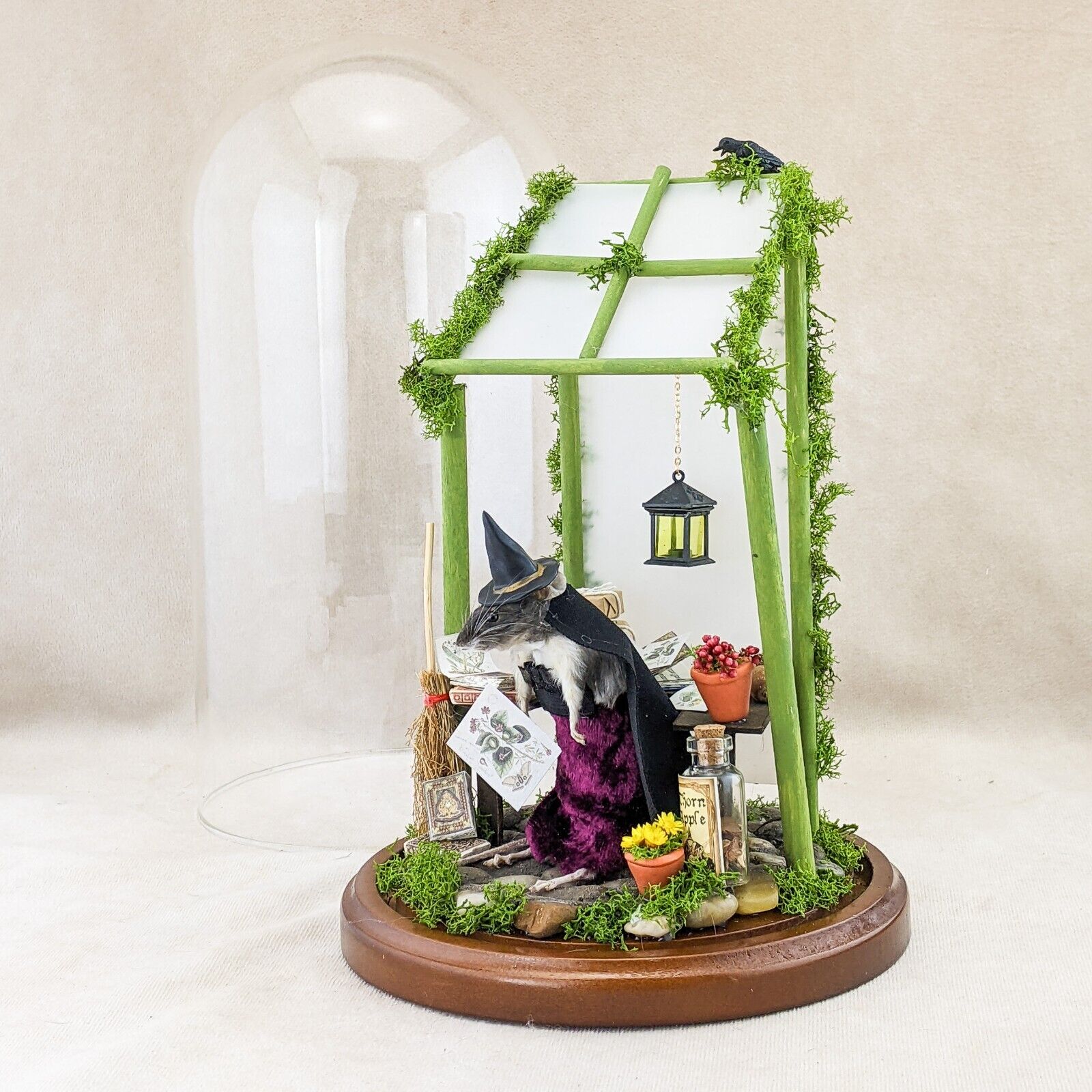 The cute mouse witch is holding a botanical diagram paper in her hands, with her trusty broom resting against the side of the greenhouse. This one-of-a-kind piece will make a delightful addition to any witchy collection or make a unique gift for the witch or nature lover in your life. Bring a touch of magic into your home with this charming dome display!