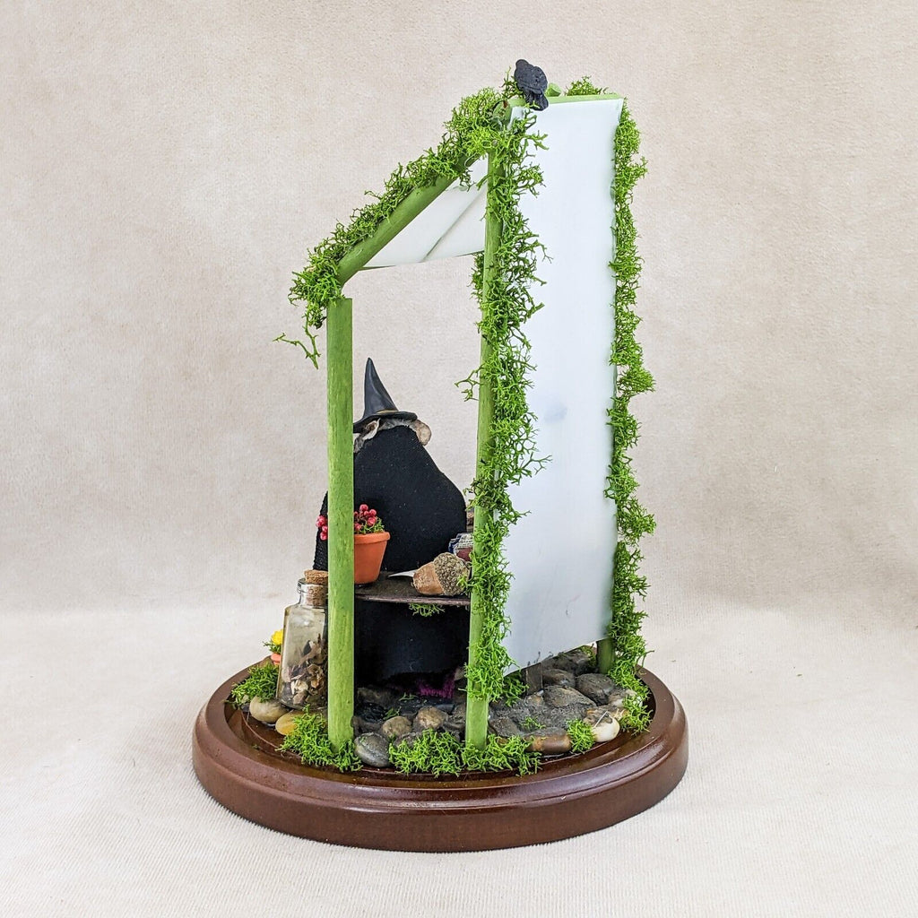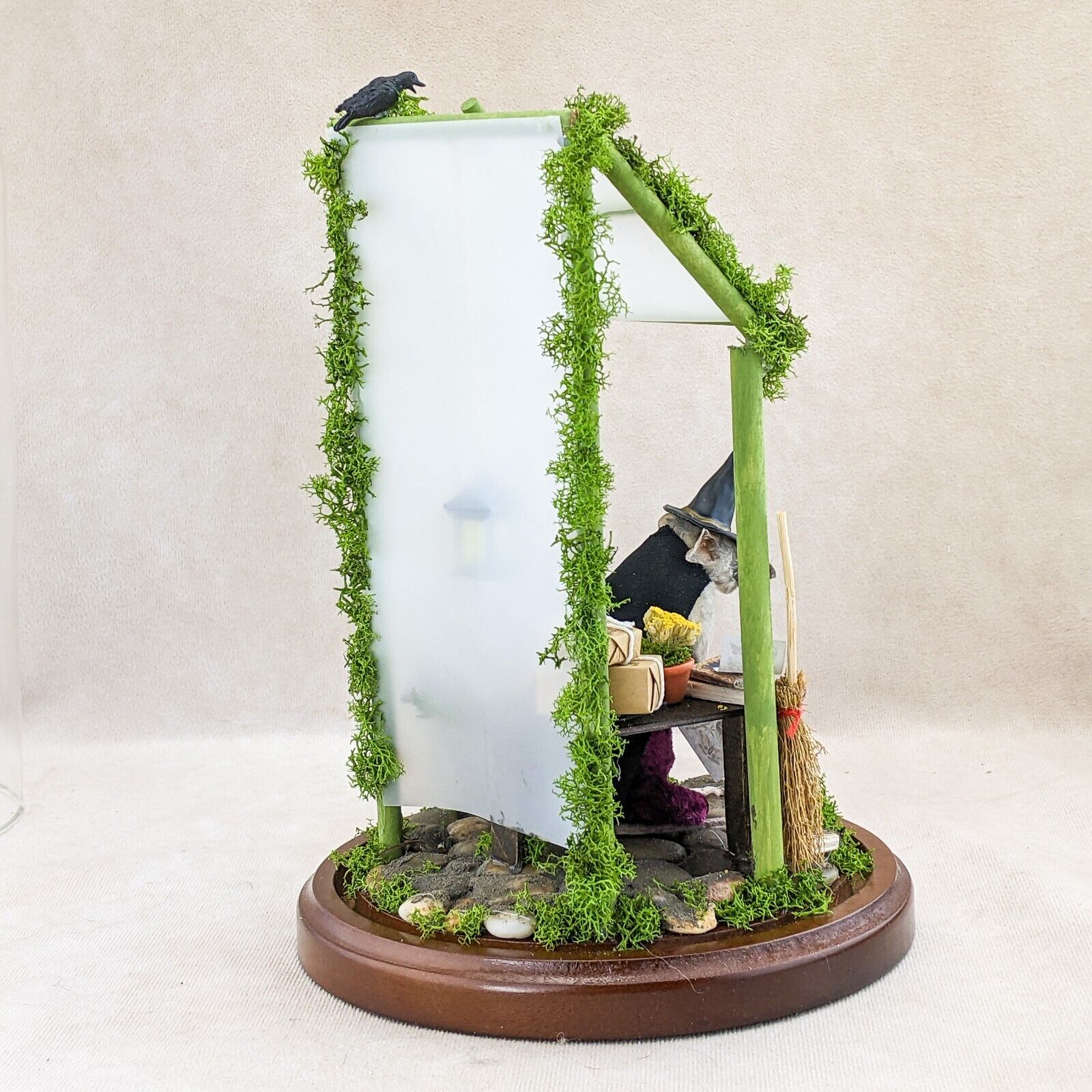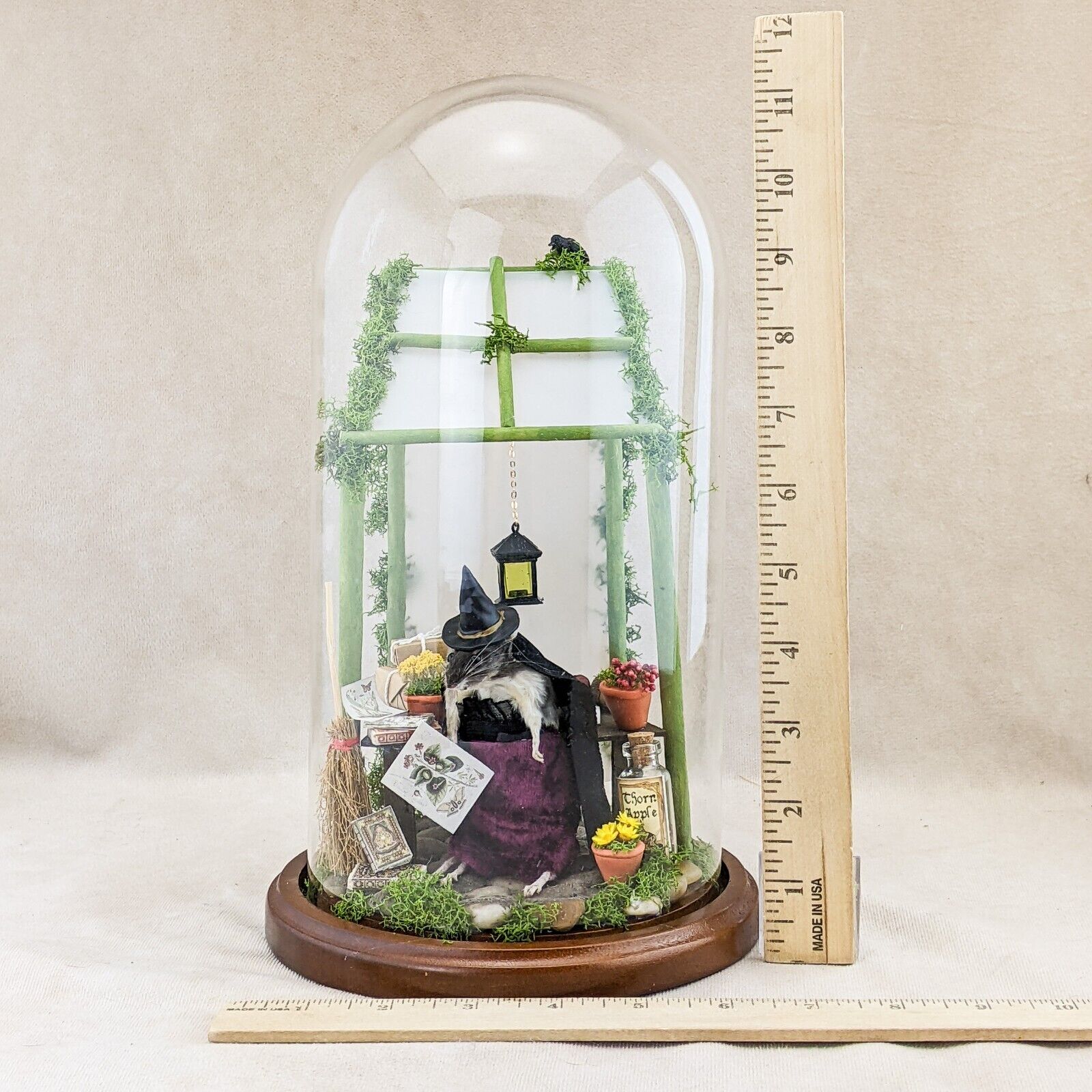 The cute mouse witch is holding a botanical diagram paper in her hands, with her trusty broom resting against the side of the greenhouse. This one-of-a-kind piece will make a delightful addition to any witchy collection or make a unique gift for the witch or nature lover in your life. Bring a touch of magic into your home with this charming dome display!