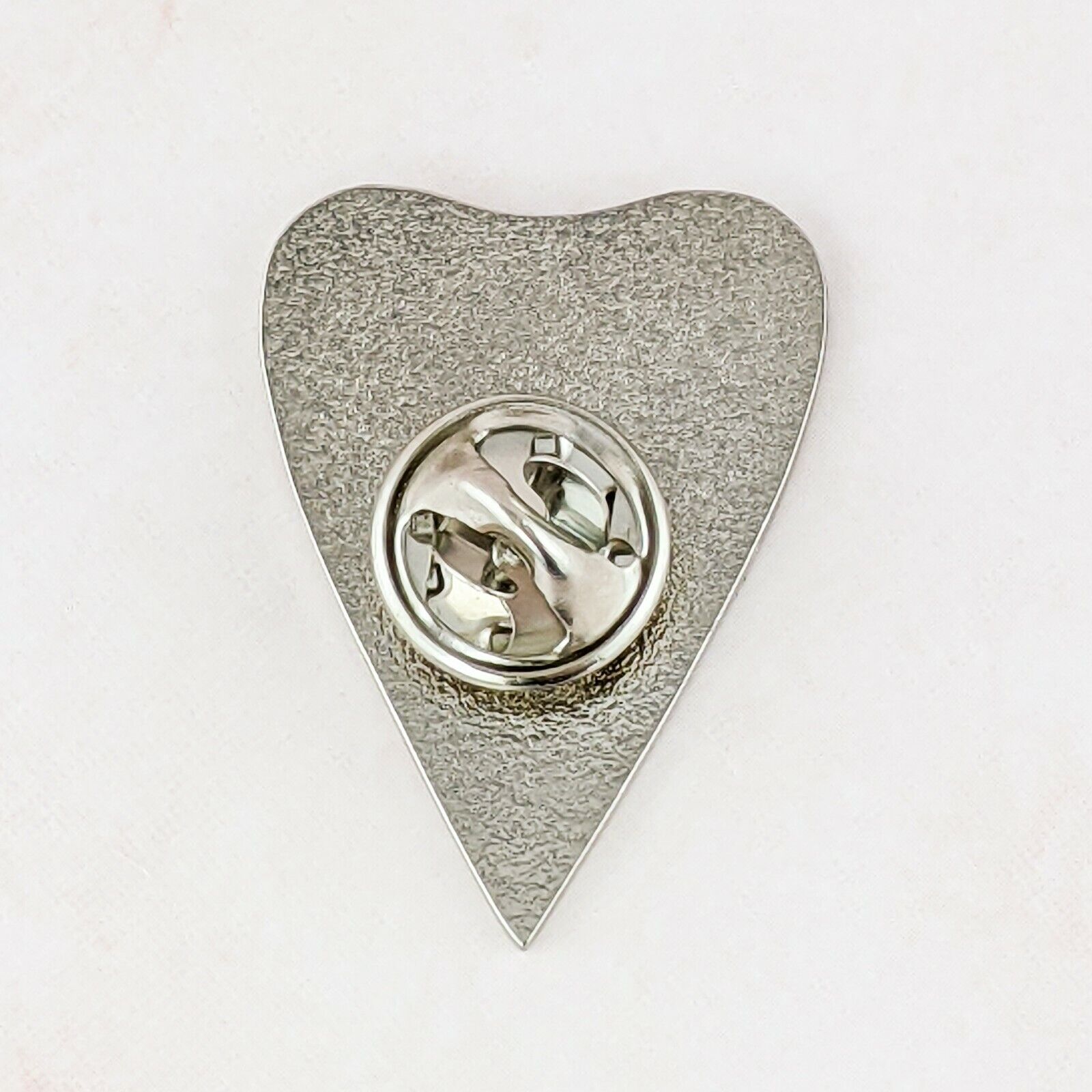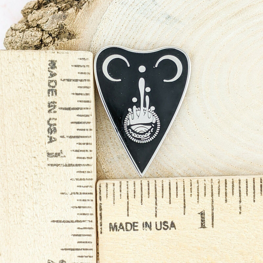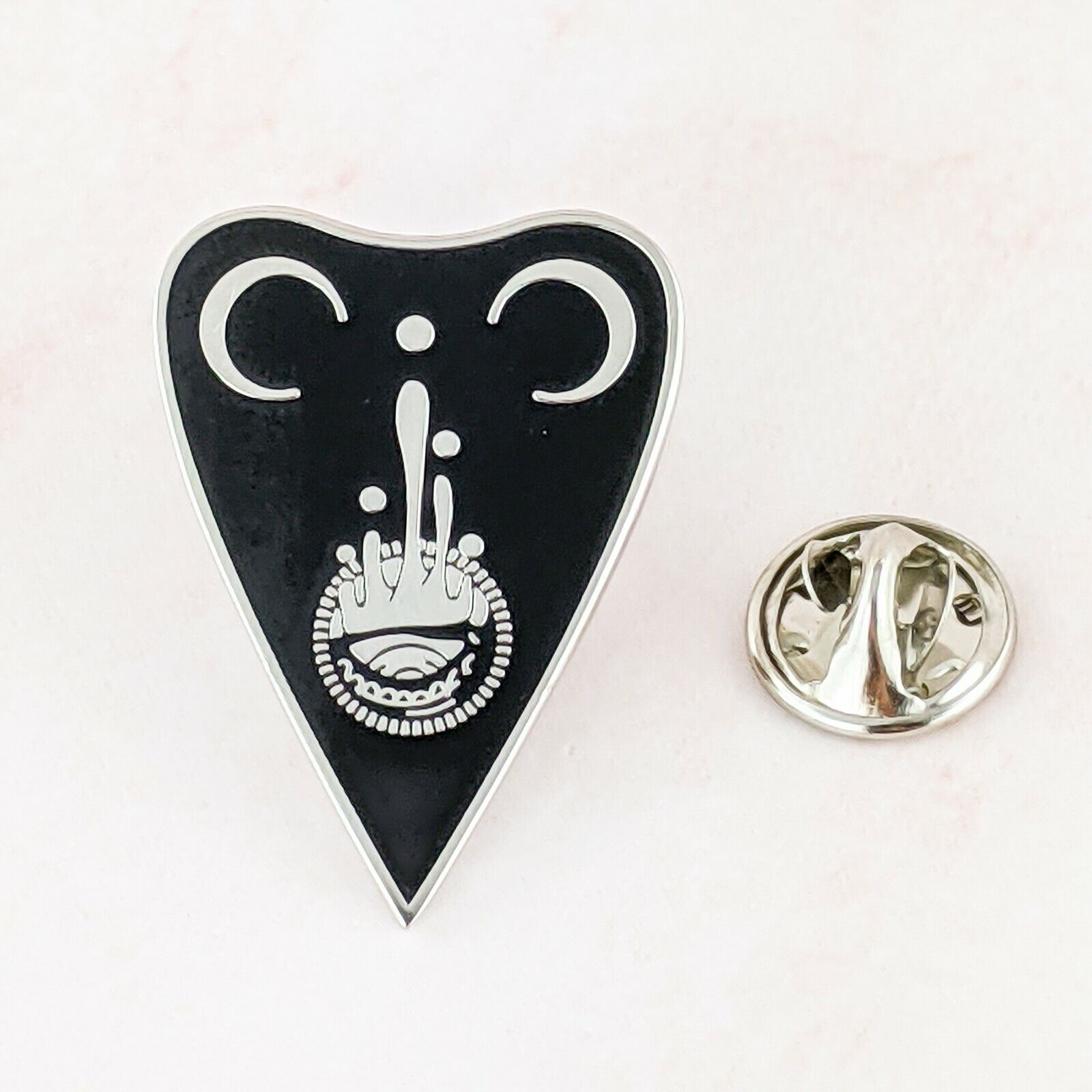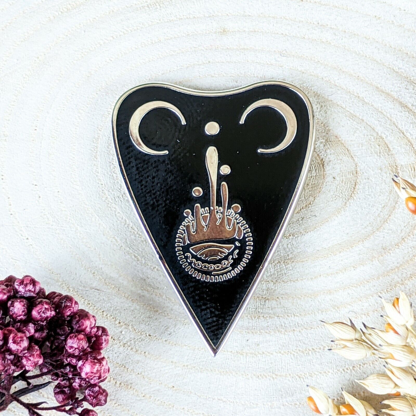 w25t This Ouija Planchette pin is sure to dress up your outfit!  It is a single back pin done in black enamel and is approx. 1 x 1 1/4".