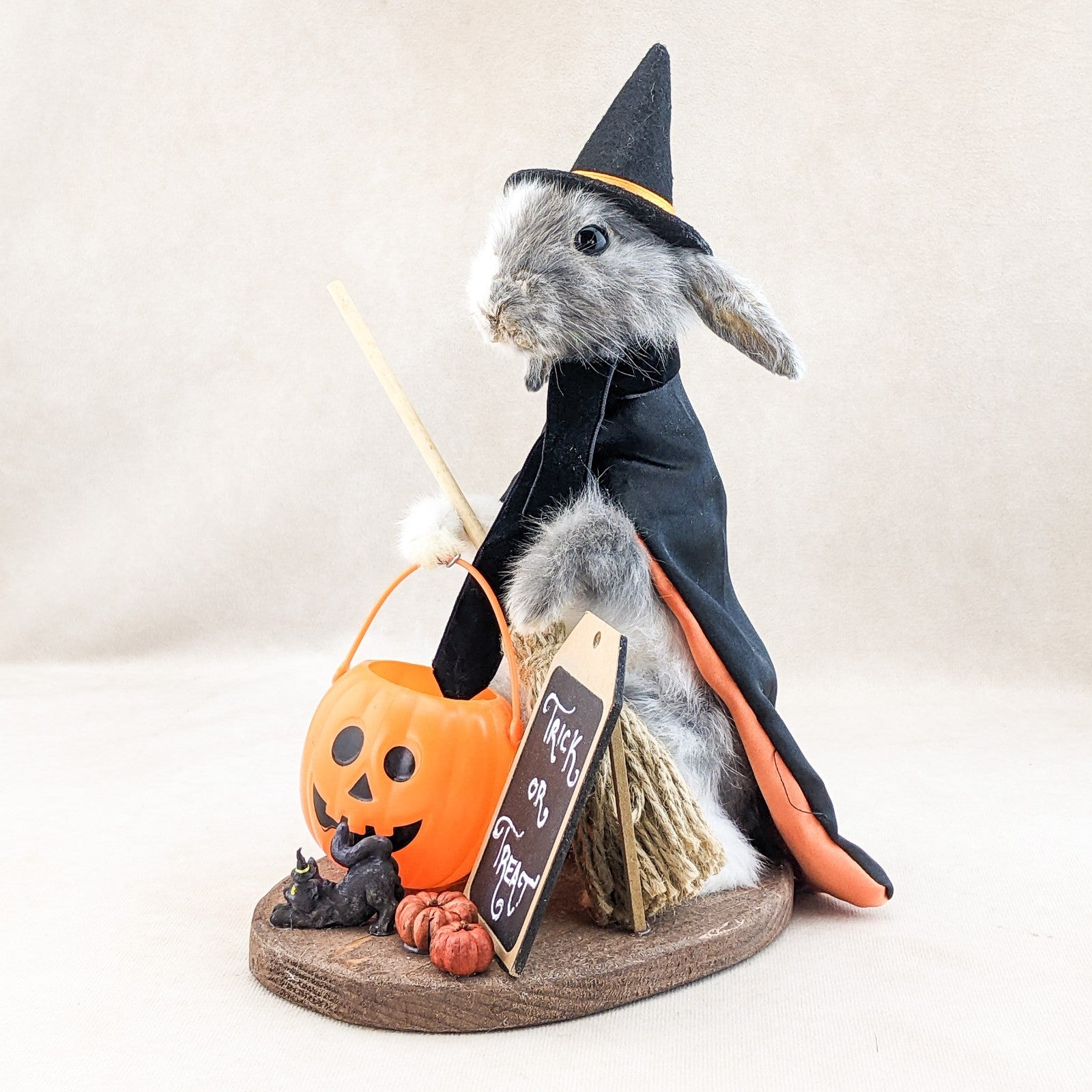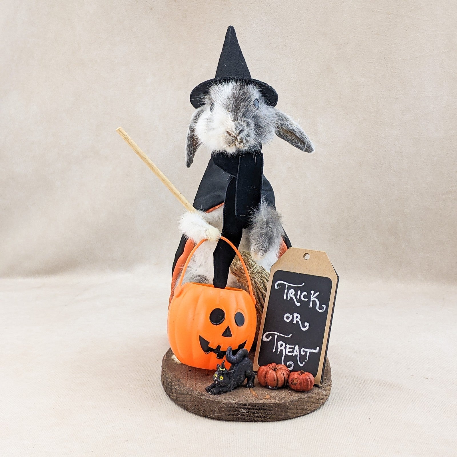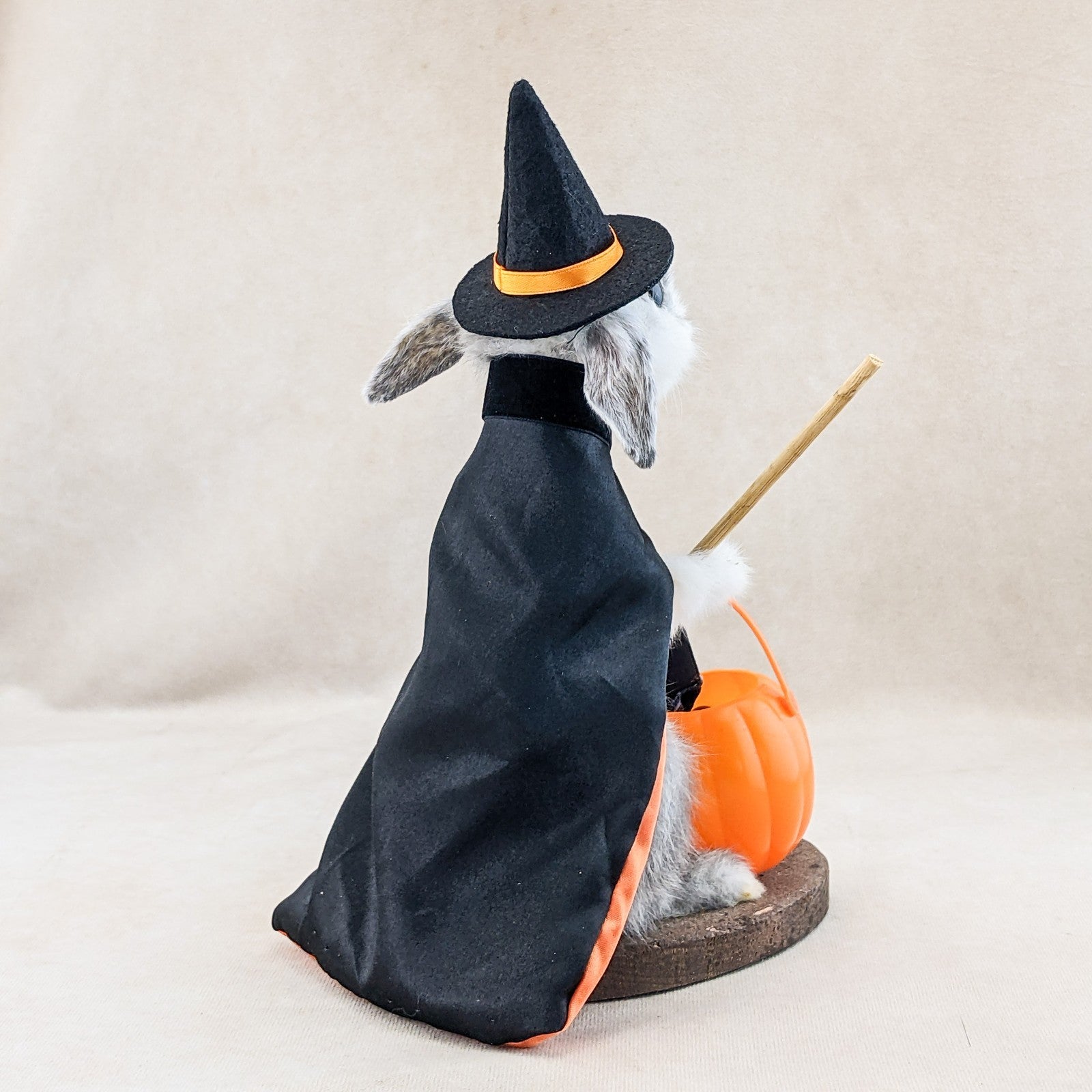 Trick or Treat! This witch bunny has put on her little black and orange witch hat and matching cape to collect candy! She stands next to a trick or treat chalkboard sign and pumpkins while holding a cute pumpkin pail, a detachable broom, and has witch cat familiar to keep her company. Approx 11 x 7 x 4.5"