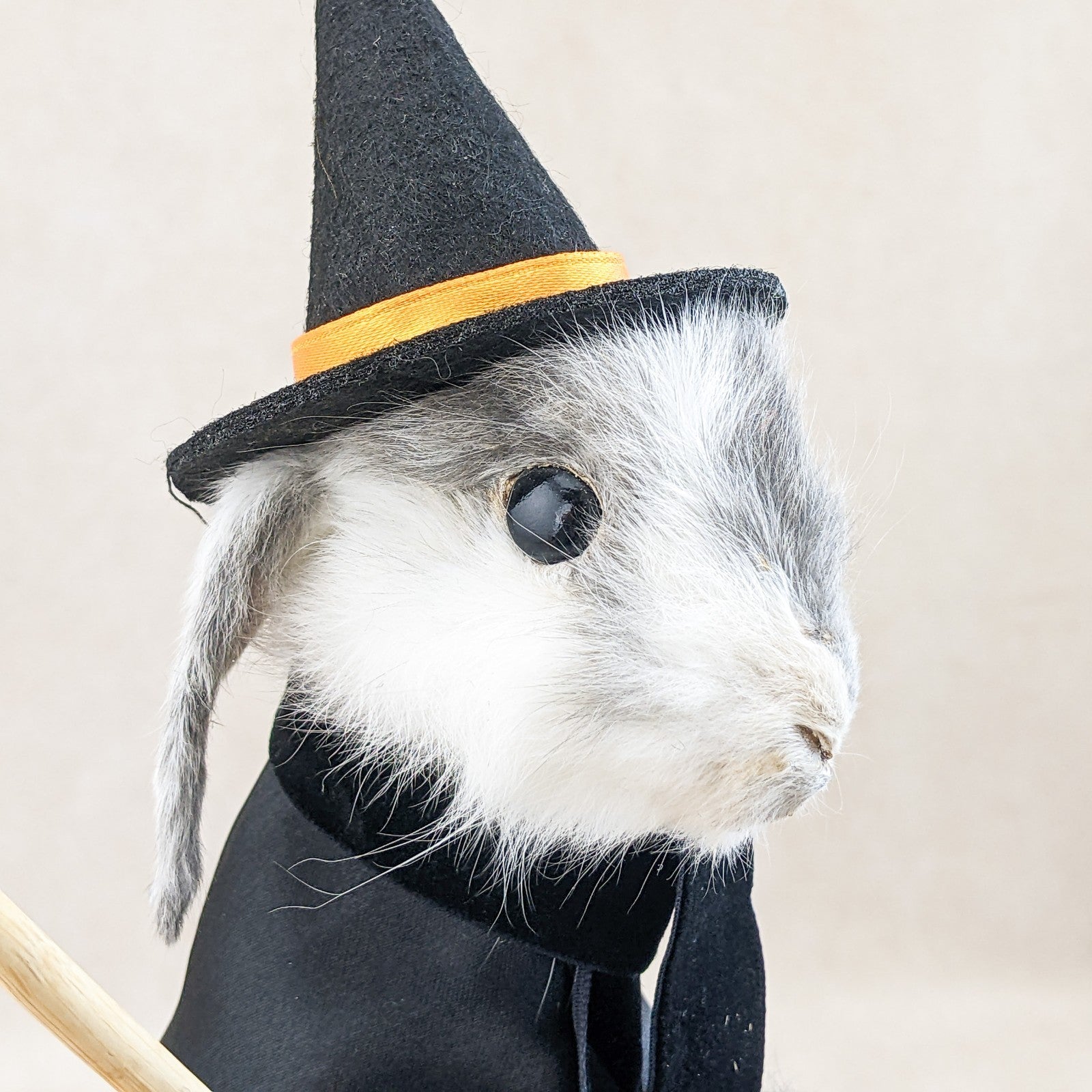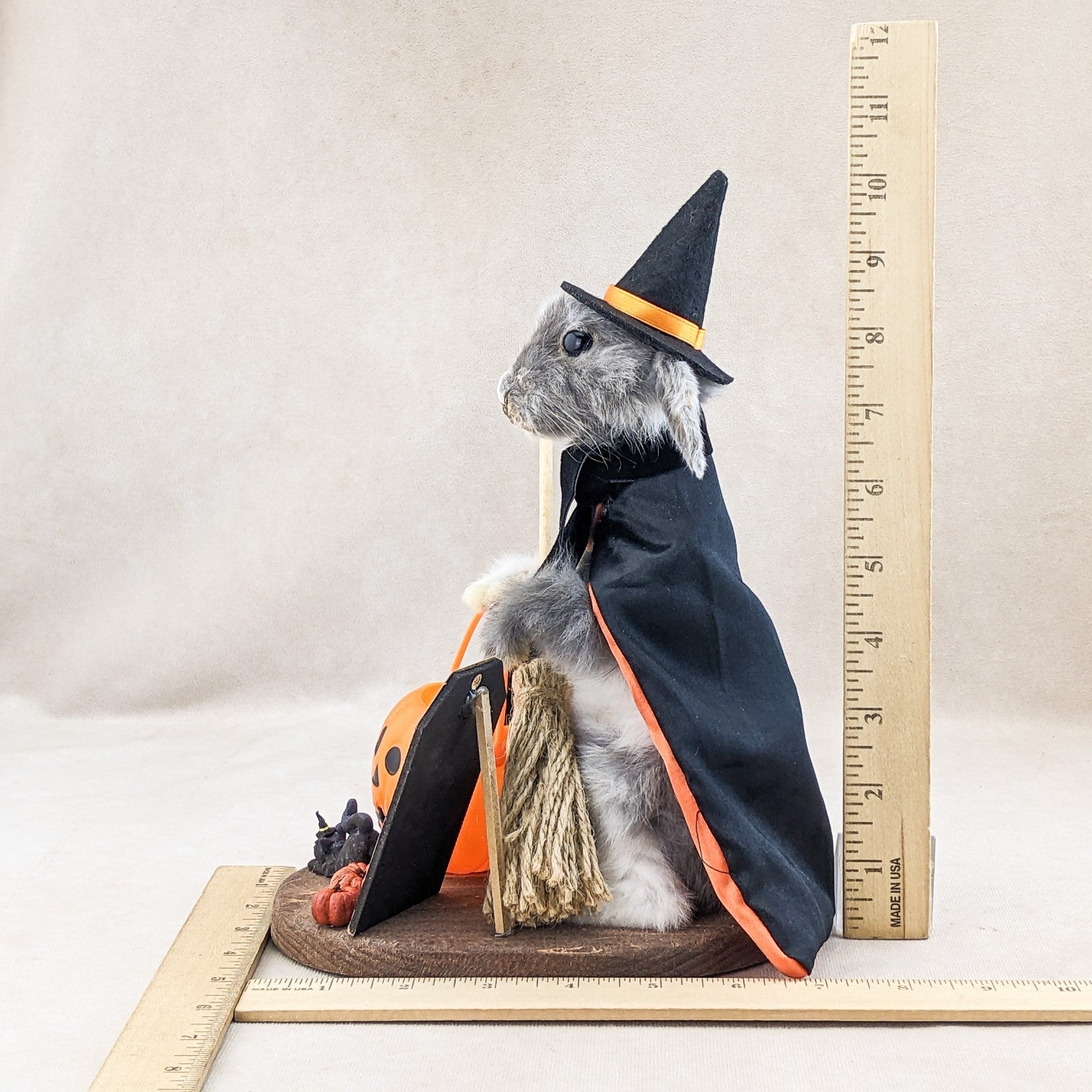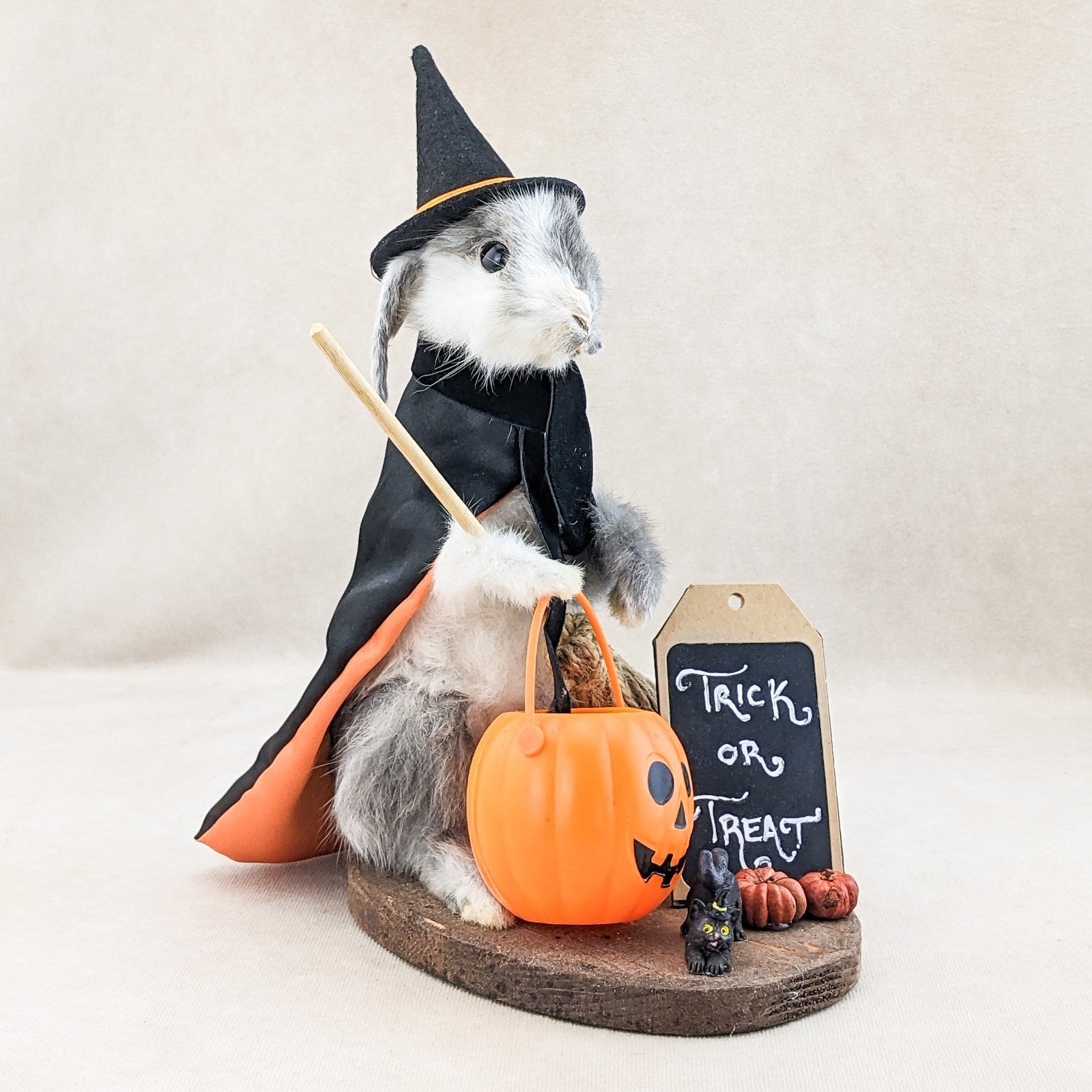 Trick or Treat! This witch bunny has put on her little black and orange witch hat and matching cape to collect candy! She stands next to a trick or treat chalkboard sign and pumpkins while holding a cute pumpkin pail, a detachable broom, and has witch cat familiar to keep her company. Approx 11 x 7 x 4.5"