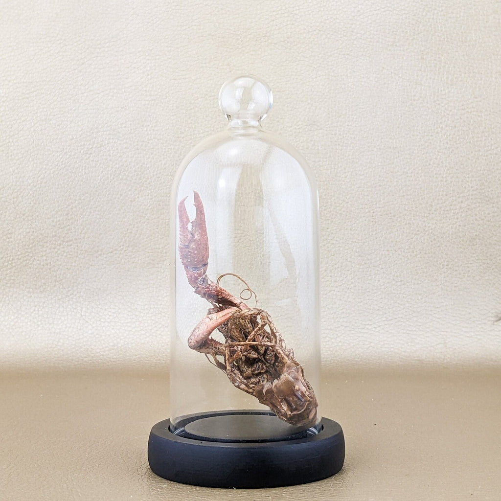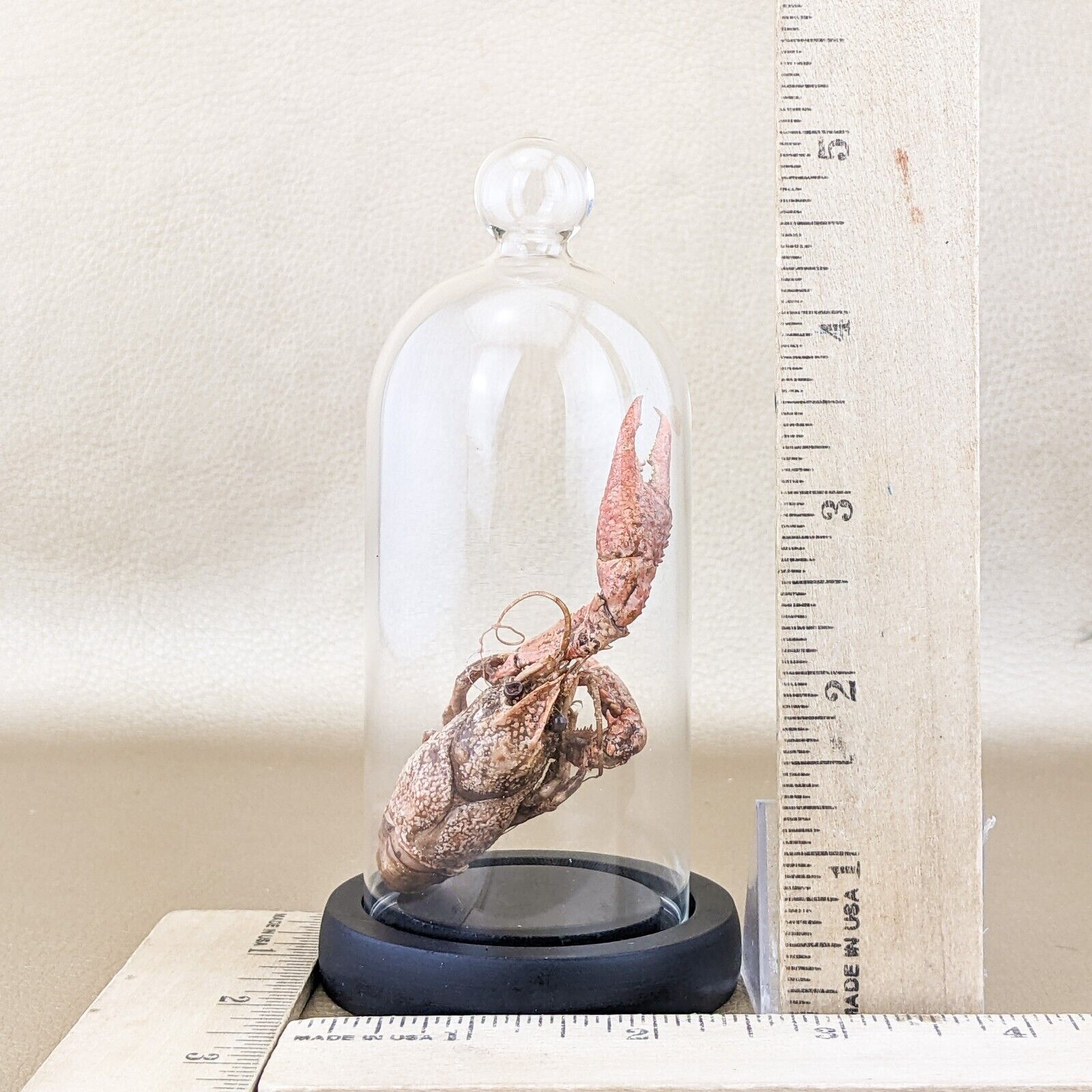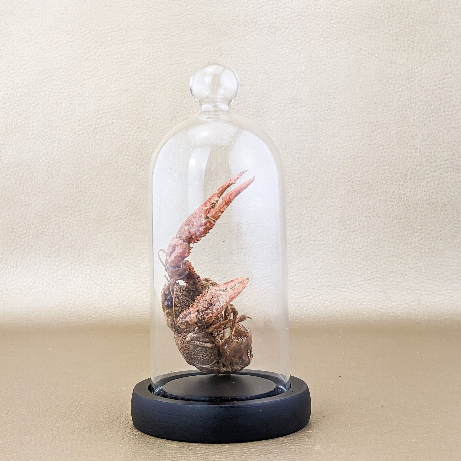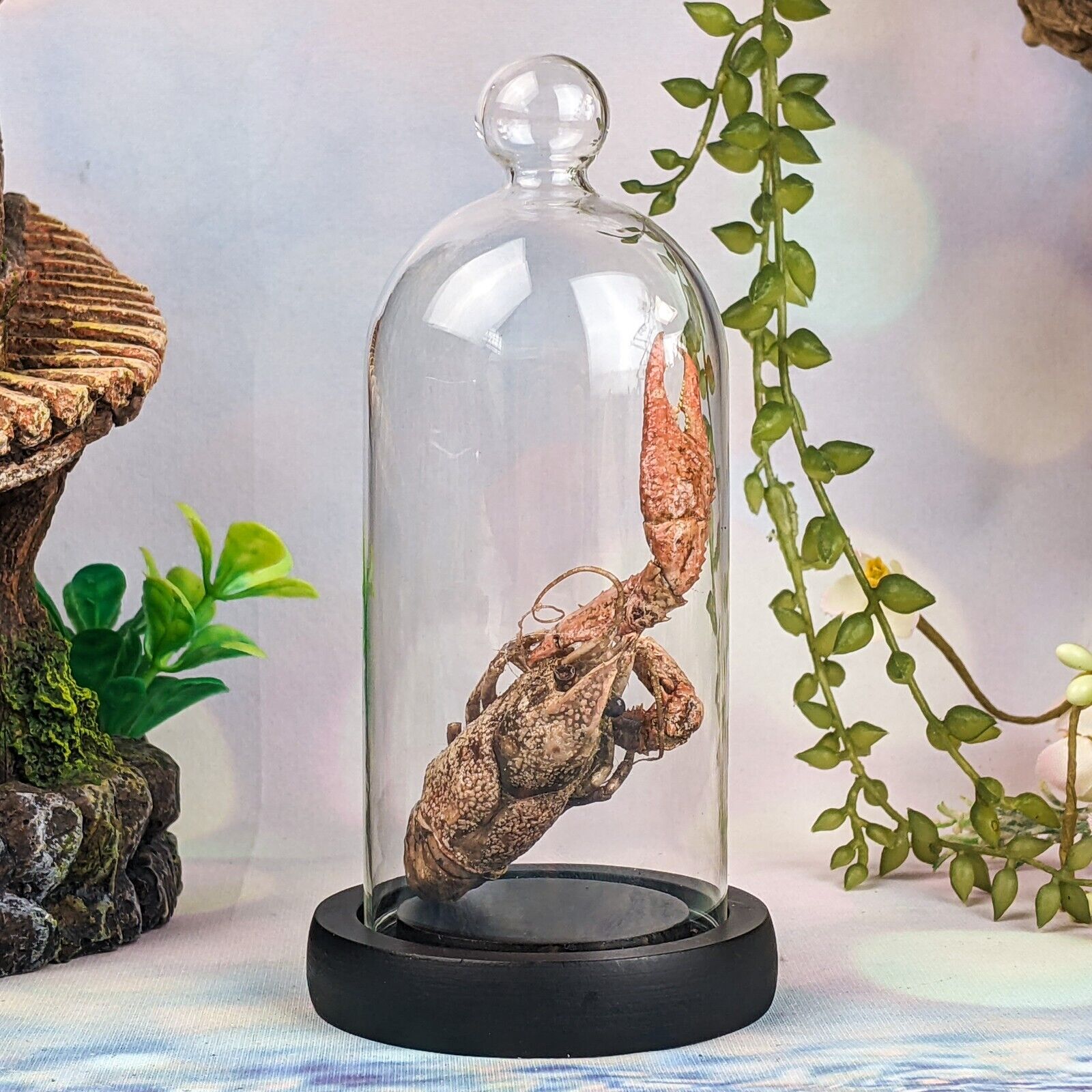 Y93d #4 This is a nice display of a Crawdad! He is displayed nicely in a glass dome and can be removed. He has also been sprayed with a clear acrylic spray to give him a "wet look". This display is approx. 5" x 2 1/2" with a glass dome and wood bottom. This will stay nice, safe and clean for years to come under its protective glass. The cover can be removed if you would like to inspect your specimen. This has been preserved with formalin so we do not recommend displaying without it under glass.