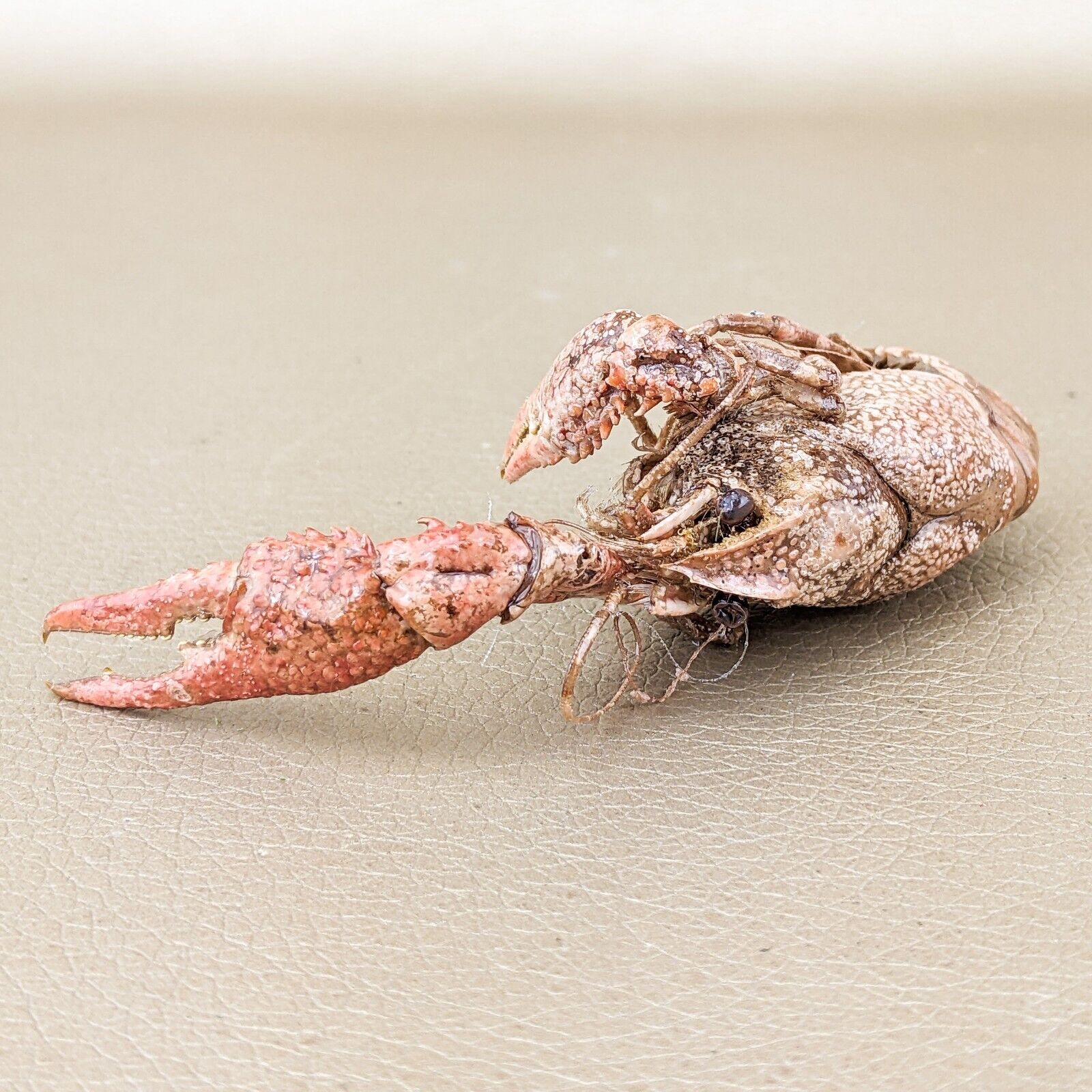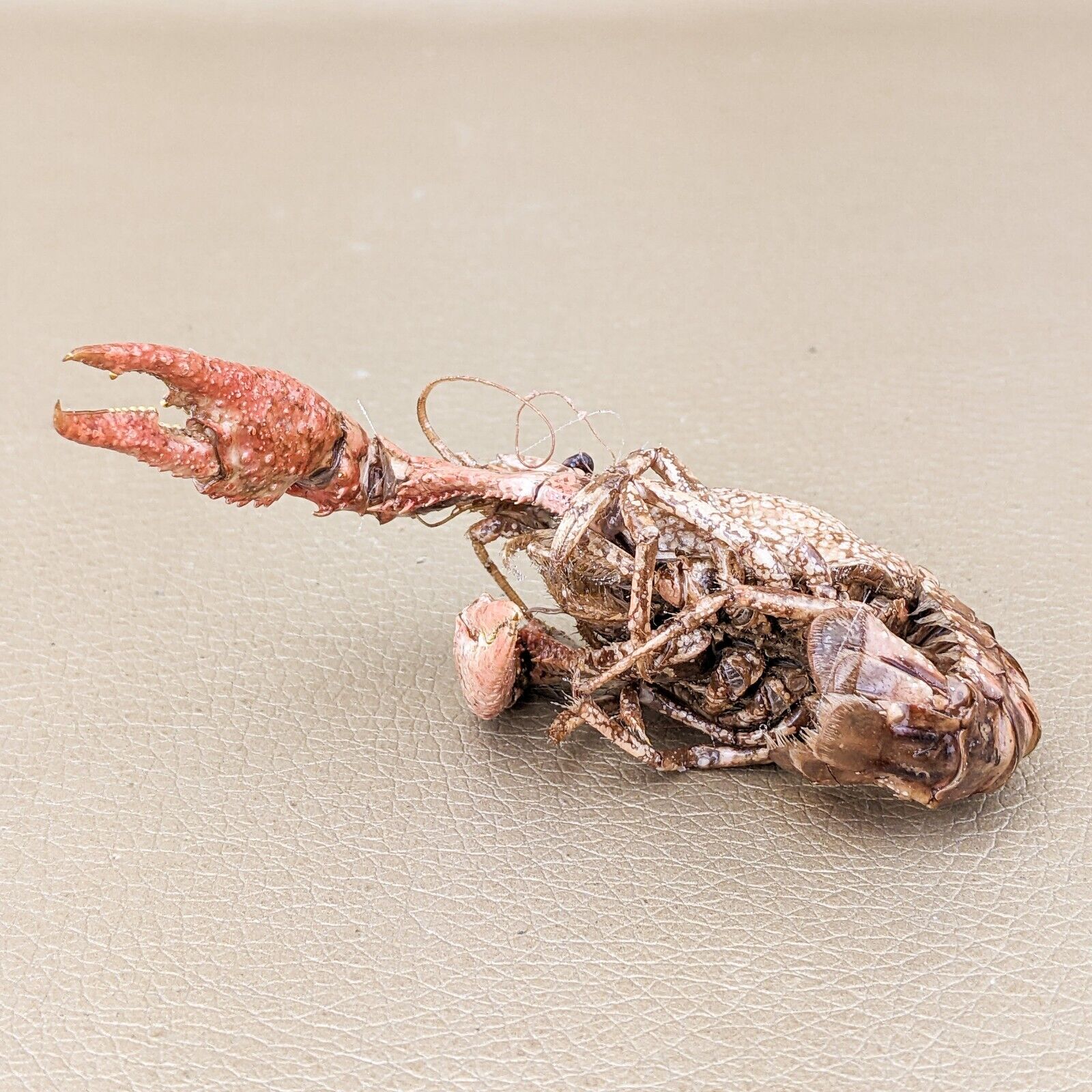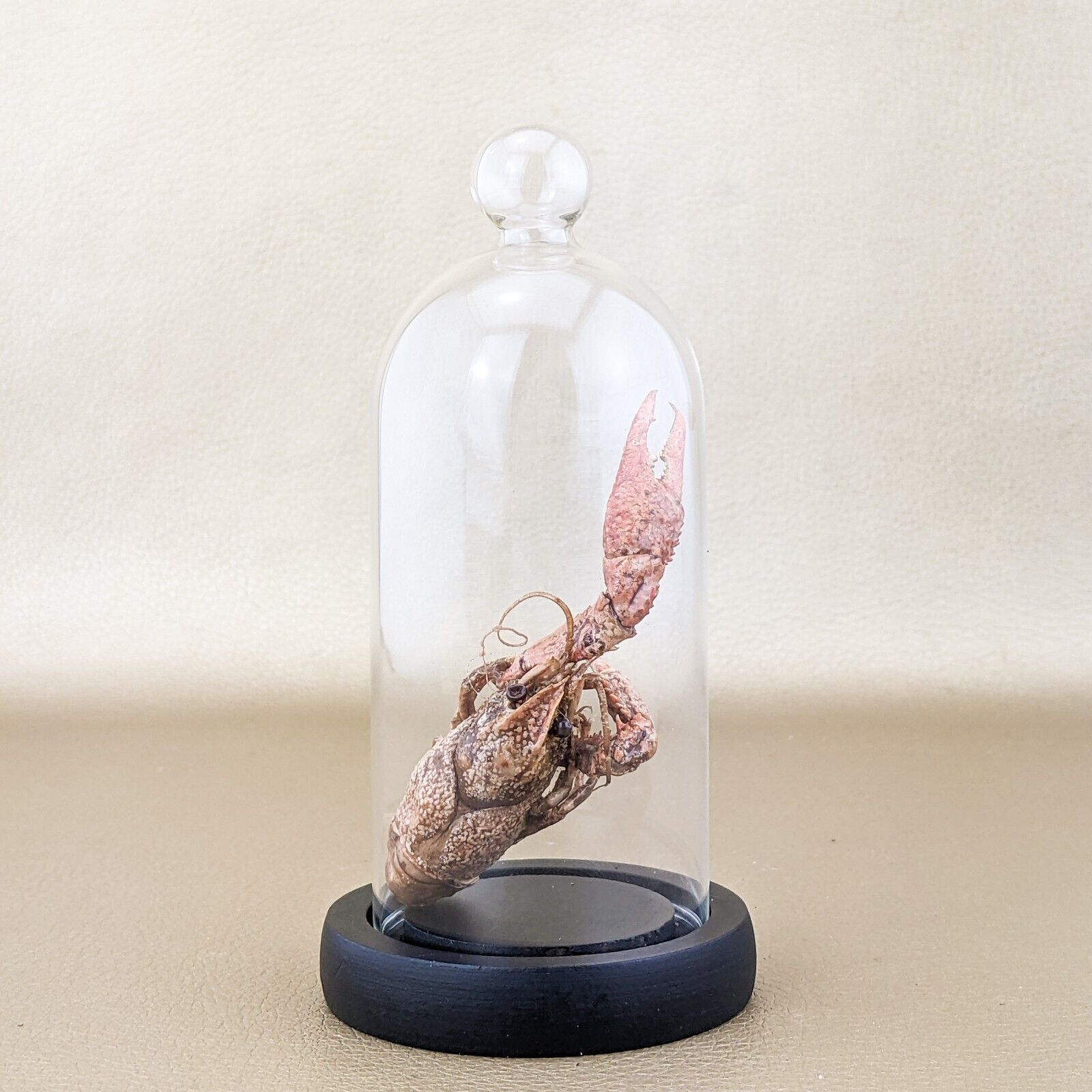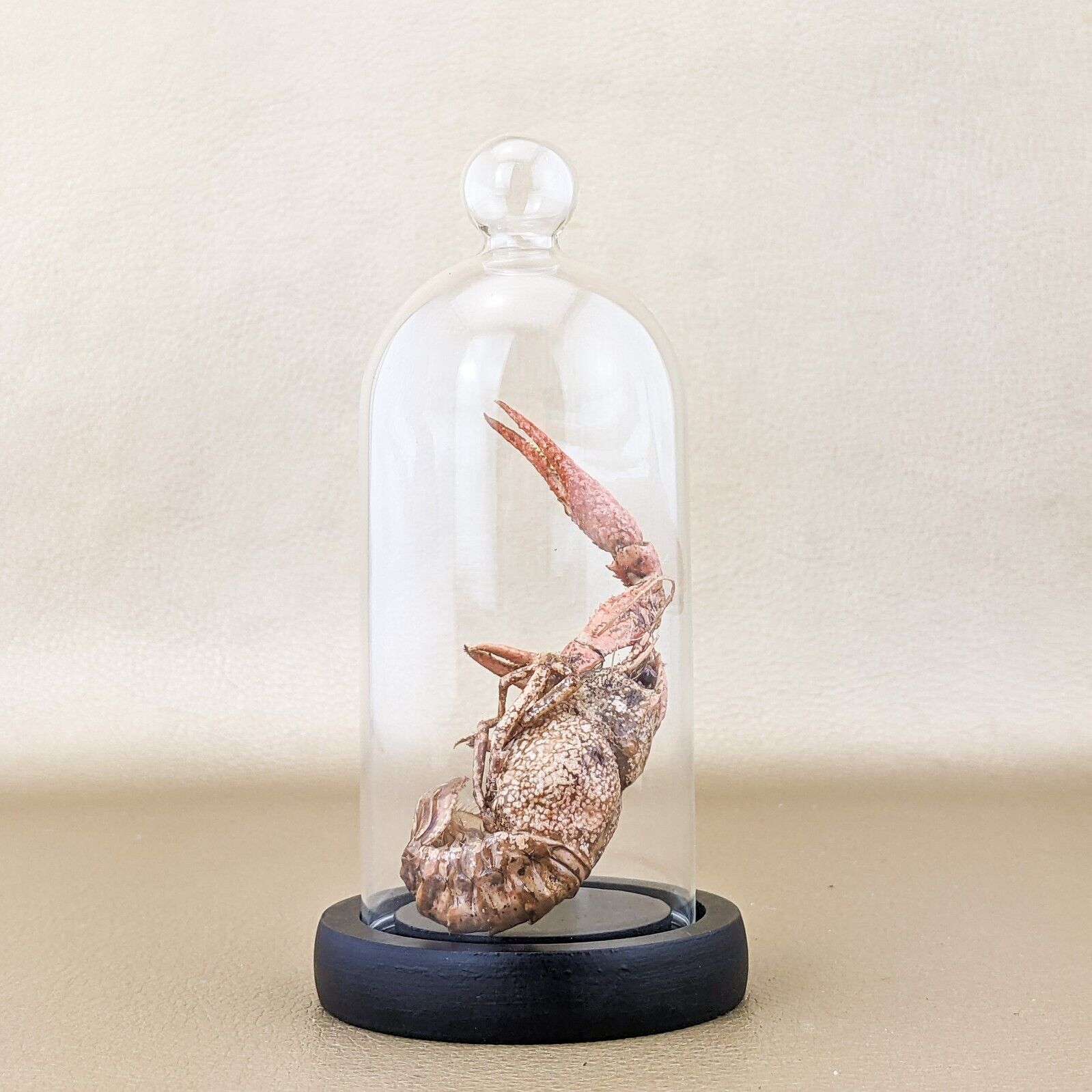 Y93d #4 This is a nice display of a Crawdad! He is displayed nicely in a glass dome and can be removed. He has also been sprayed with a clear acrylic spray to give him a "wet look". This display is approx. 5" x 2 1/2" with a glass dome and wood bottom. This will stay nice, safe and clean for years to come under its protective glass. The cover can be removed if you would like to inspect your specimen. This has been preserved with formalin so we do not recommend displaying without it under glass.
