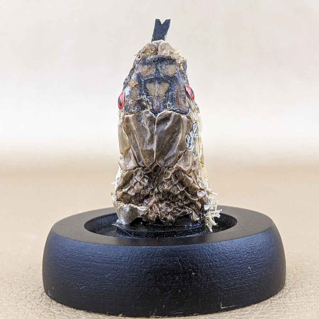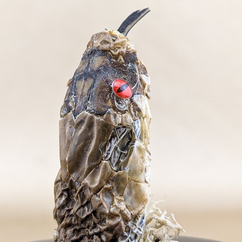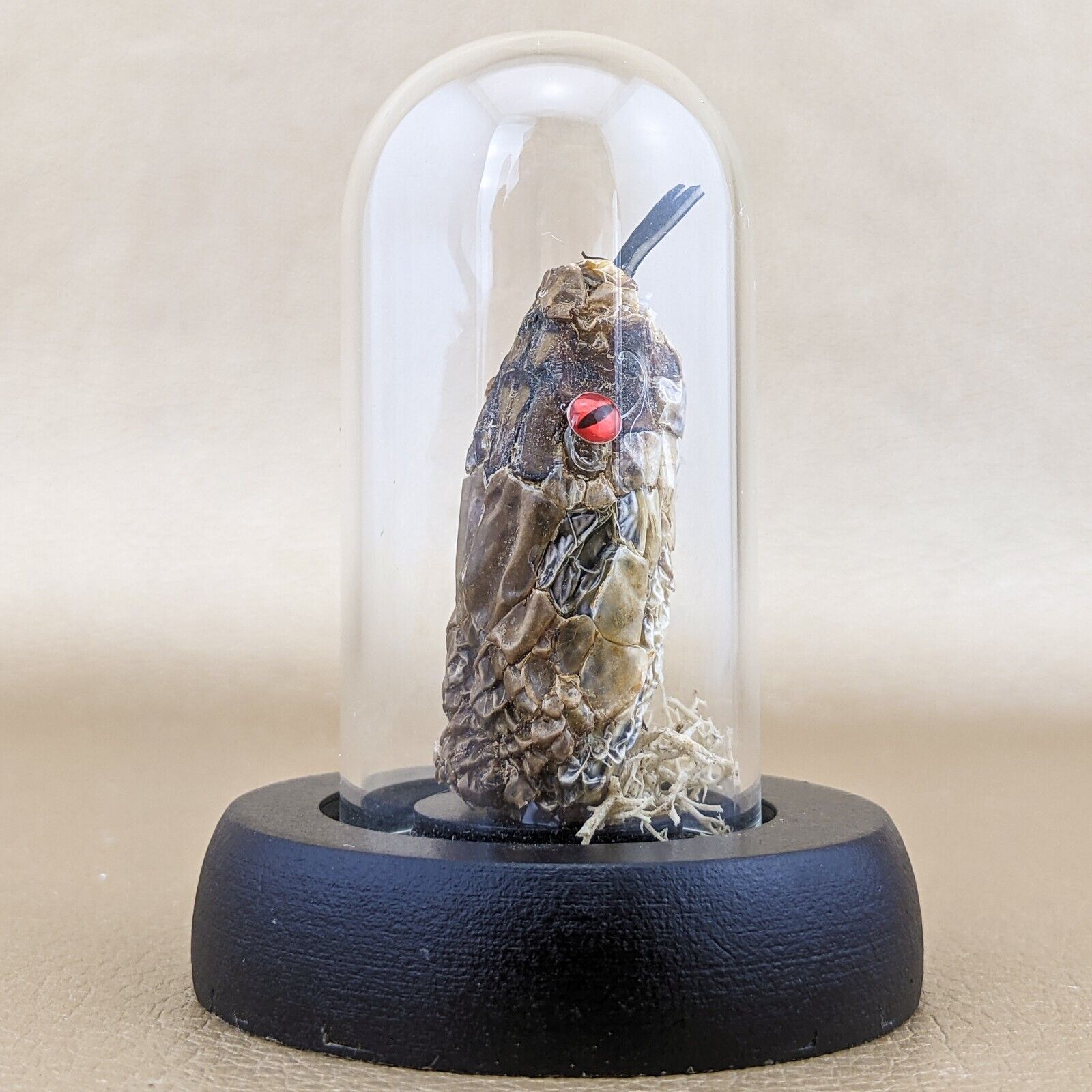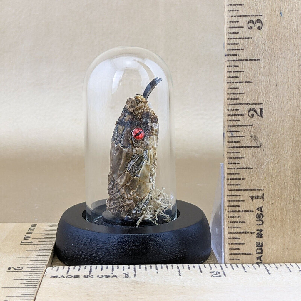 z38L #4    This is a nice display of a common Red banded snake head.  He is displayed in a glass dome display with a wood base.  This would be a great addition to any collection and sure to attract some attention!  We have added a faux forked tongue but the head is from real snake.   This is the specimen you will be receiving so please check out the pictures! This display is approx.  2 3/4 x 2".