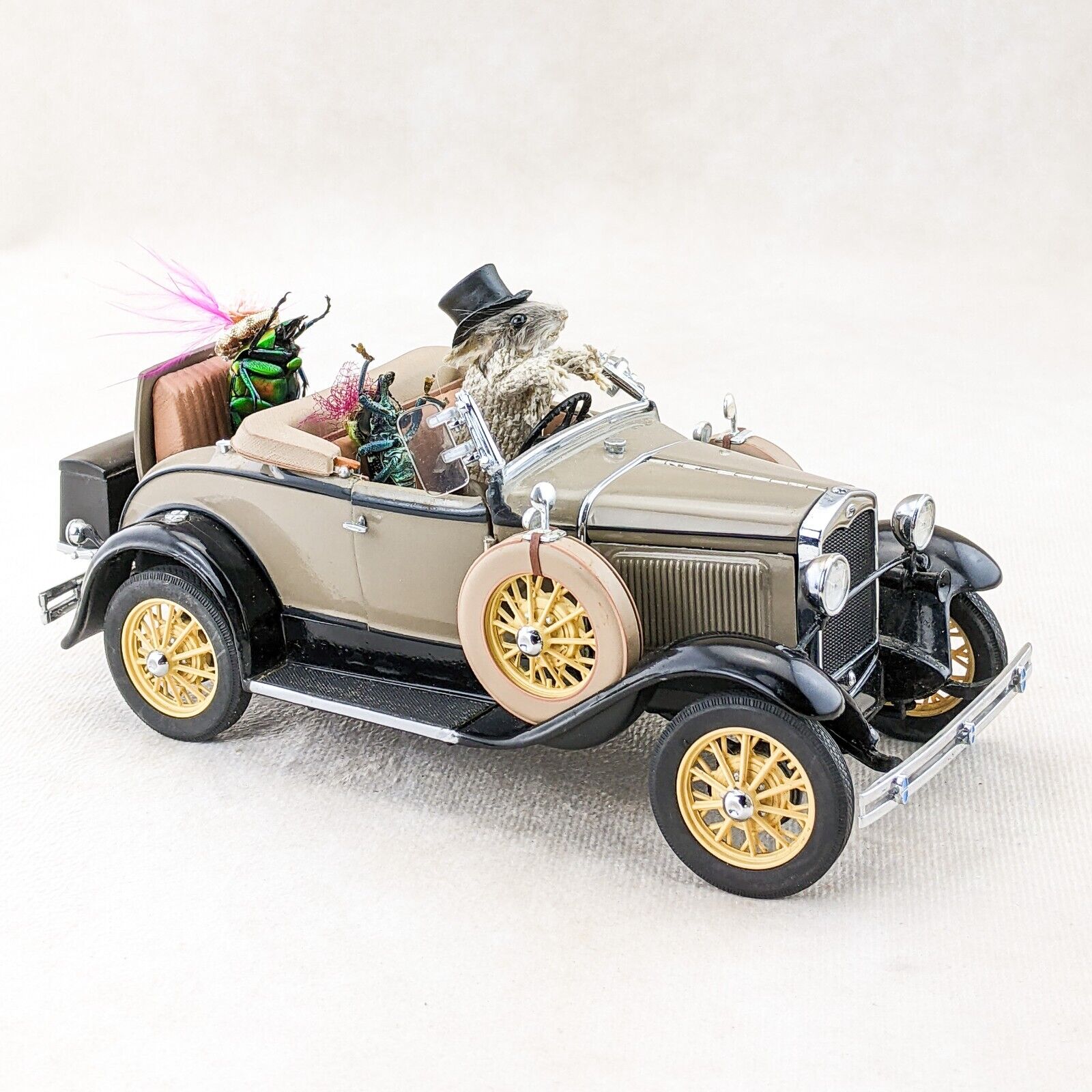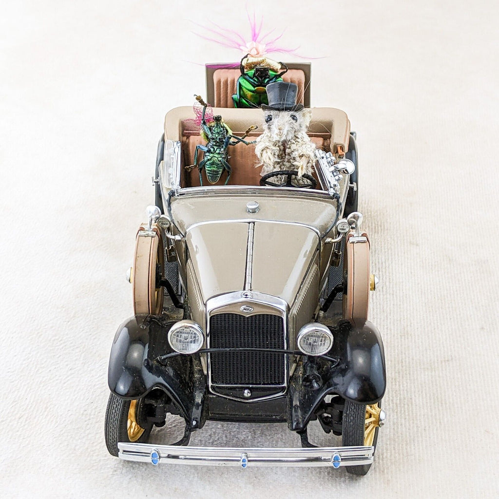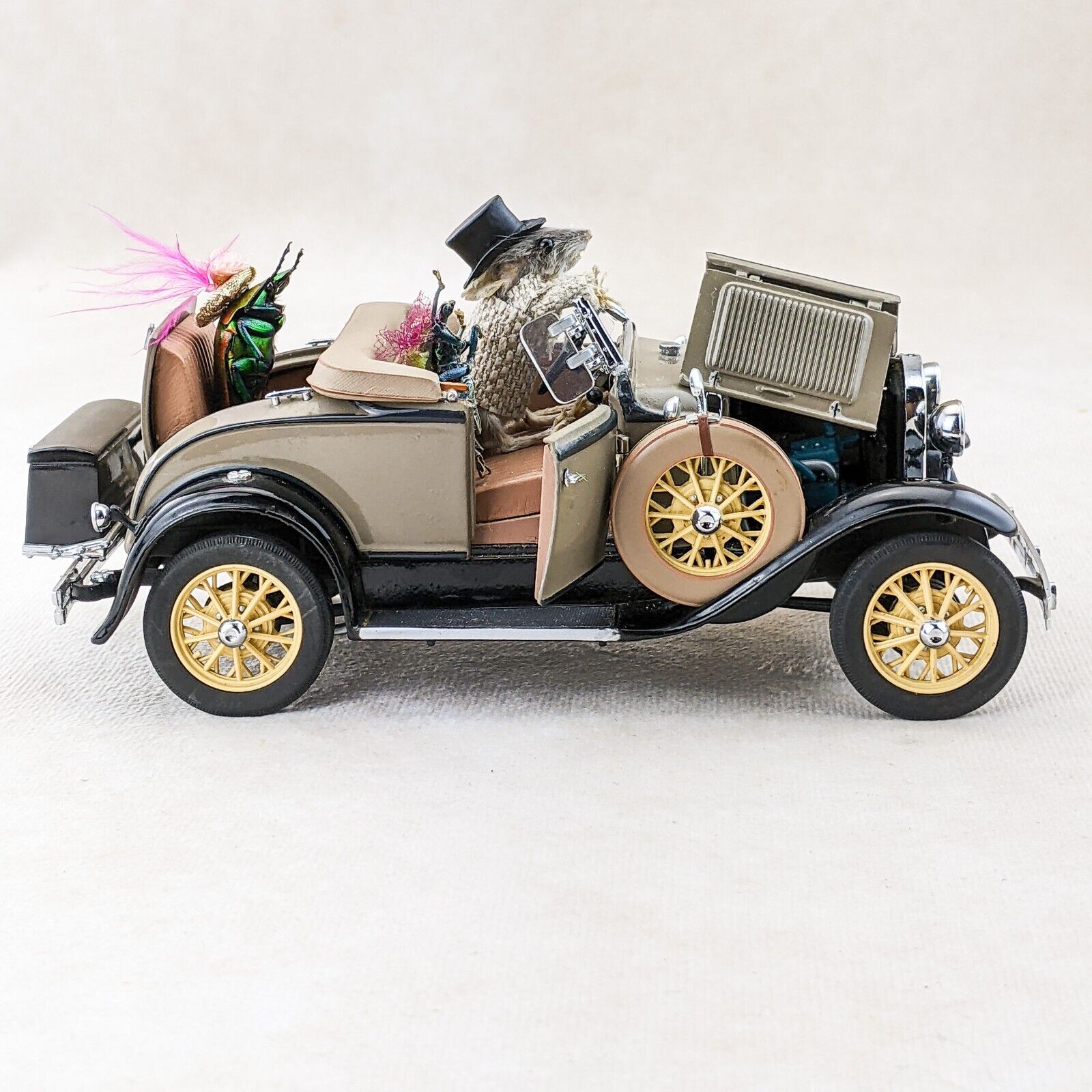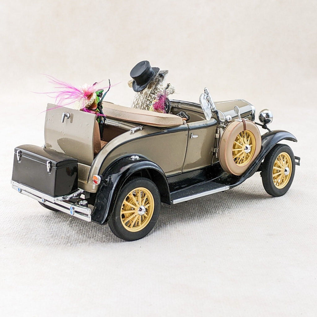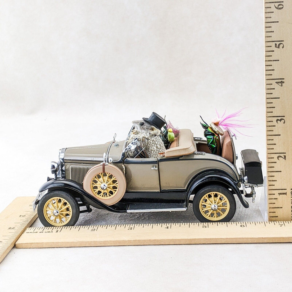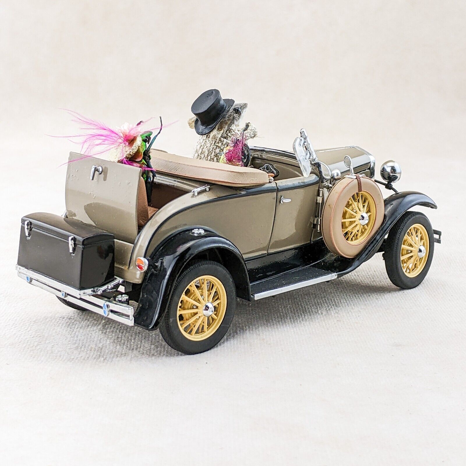 A motley crew of charming critters hit the road in a 1931 Ford A Model Roadster (with hinged hood cover and opening and closing doors). Dressed in their finest outfits, they're off to Hollywood to chase their dreams. In the driver's seat is a dapper mouse, clad in a tan suit jacket and salmon shirt, his top hat at a jaunty angle. His lady beetle friend, donning a green bonnet hat and purple veil, bounces excitedly in the passenger seat. Ready for their close-up, these plucky pals are headed for a world of glamour and glitz, with a story that's sure to be as whimsical as their wardrobe. So, hop in and join them for the ride of a lifetime - you never know where the road may lead! This piece measures approx. 6 1/2 x 2 1/2 x 3 1/4"