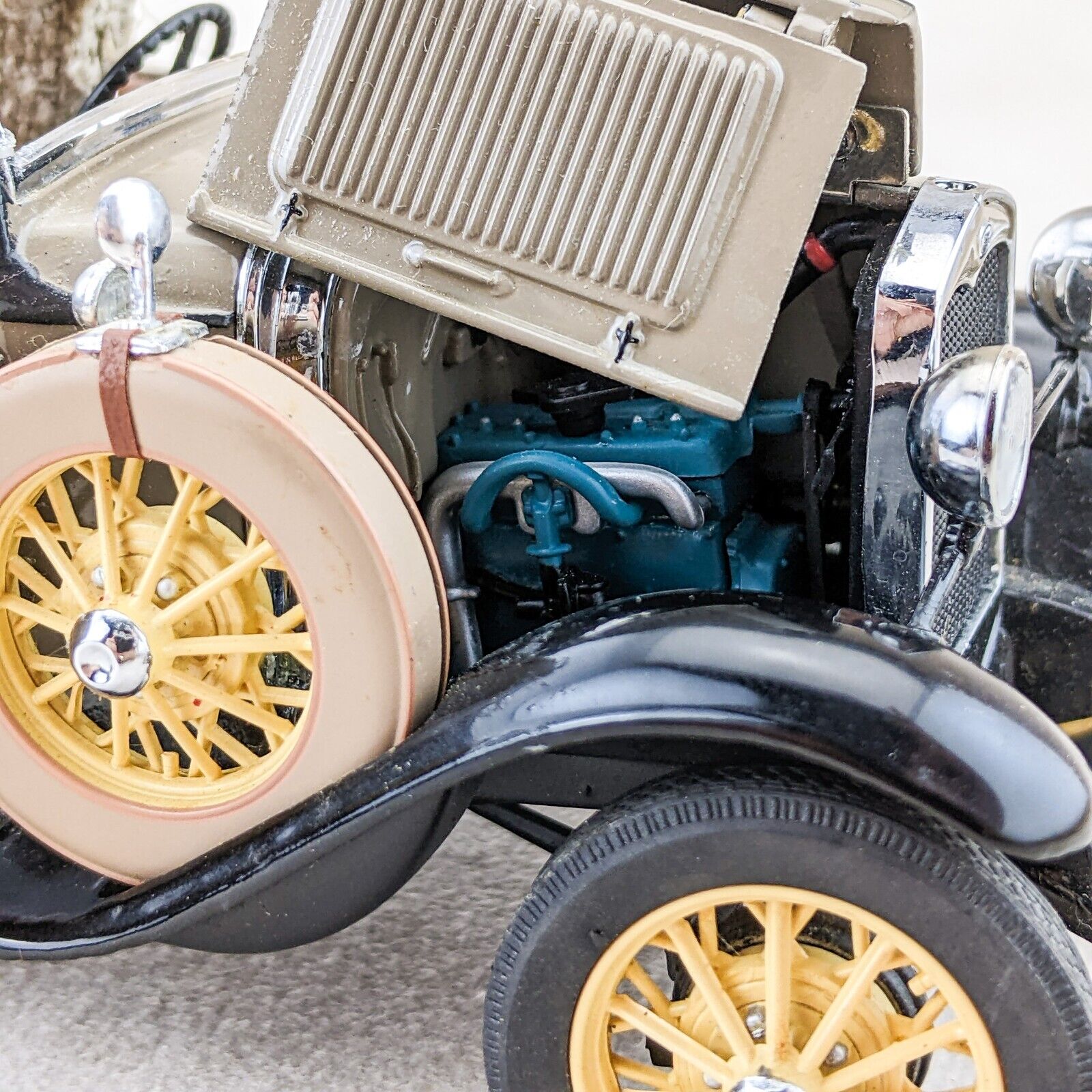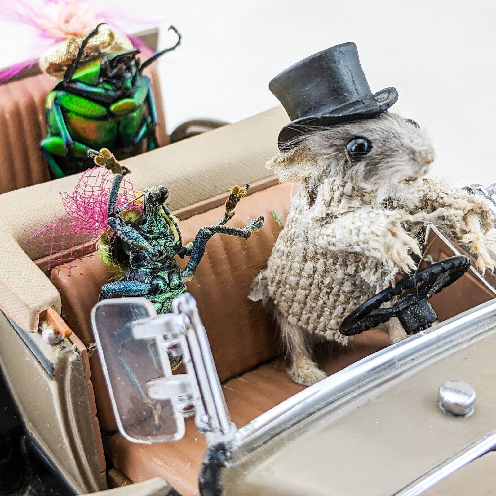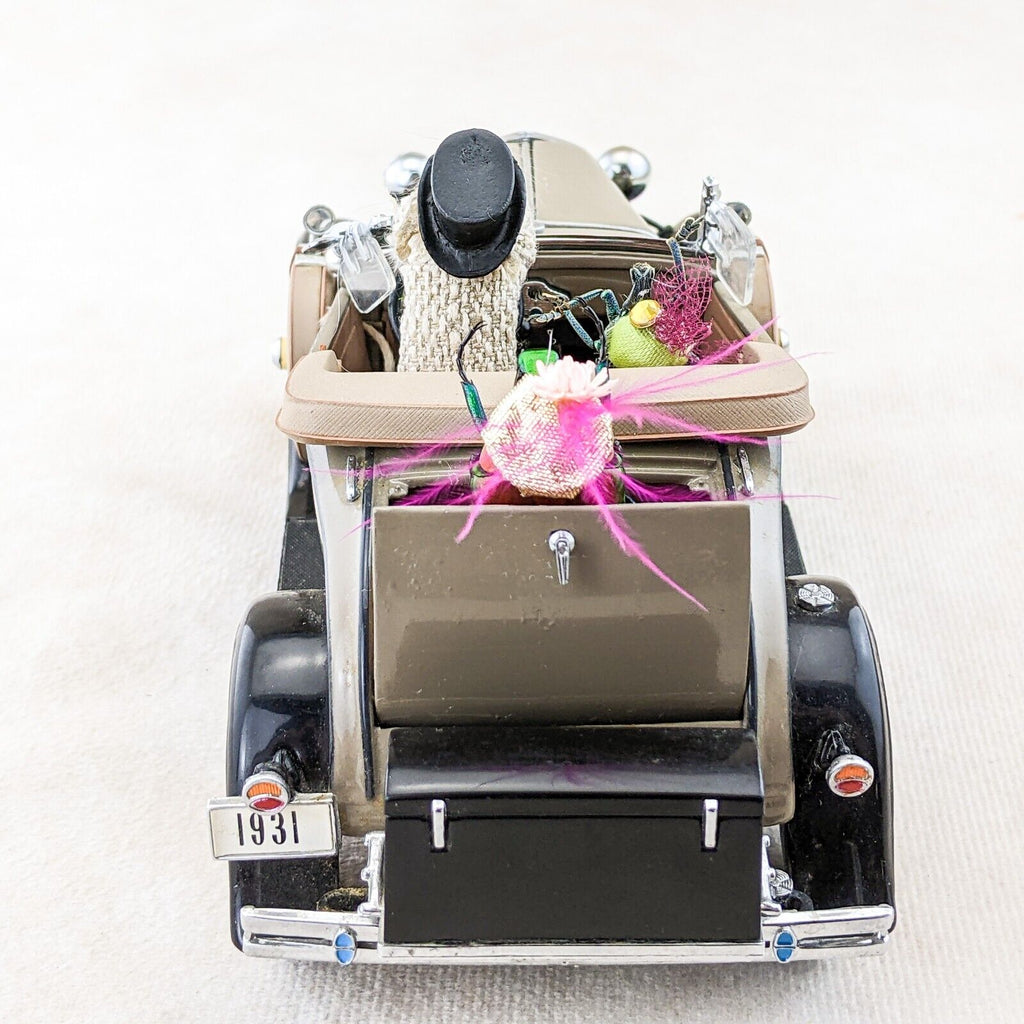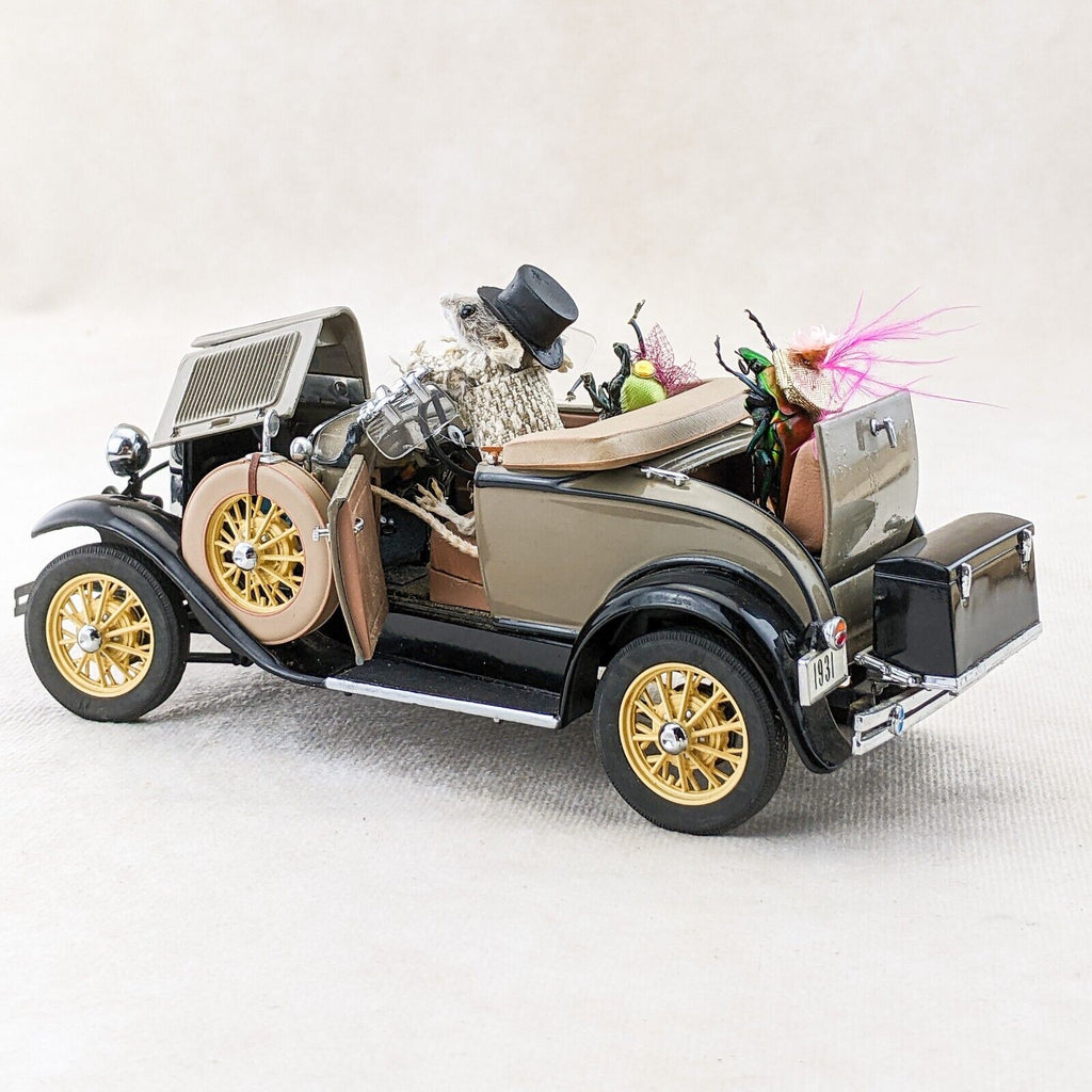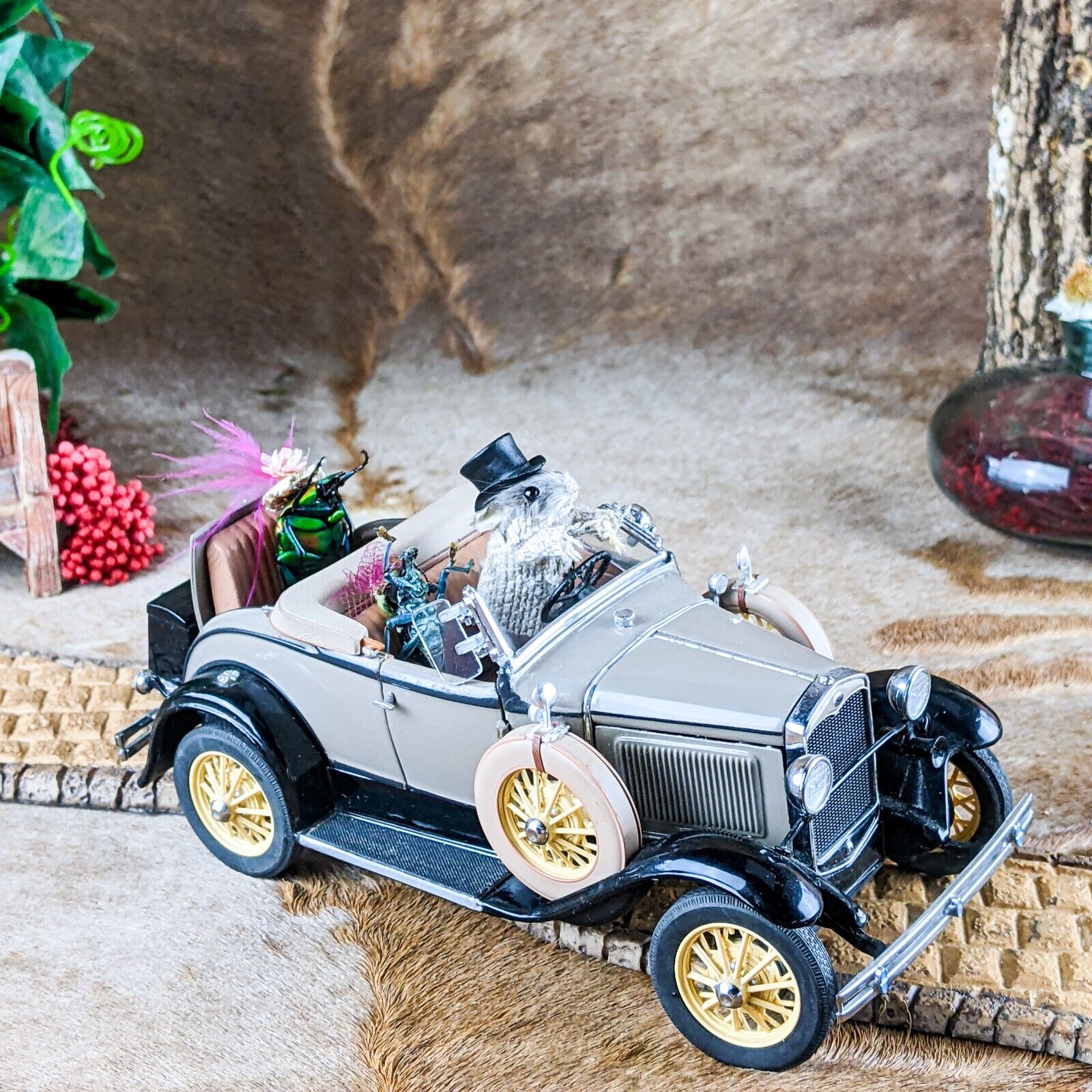 A motley crew of charming critters hit the road in a 1931 Ford A Model Roadster (with hinged hood cover and opening and closing doors). Dressed in their finest outfits, they're off to Hollywood to chase their dreams. In the driver's seat is a dapper mouse, clad in a tan suit jacket and salmon shirt, his top hat at a jaunty angle. His lady beetle friend, donning a green bonnet hat and purple veil, bounces excitedly in the passenger seat. Ready for their close-up, these plucky pals are headed for a world of glamour and glitz, with a story that's sure to be as whimsical as their wardrobe. So, hop in and join them for the ride of a lifetime - you never know where the road may lead! This piece measures approx. 6 1/2 x 2 1/2 x 3 1/4"