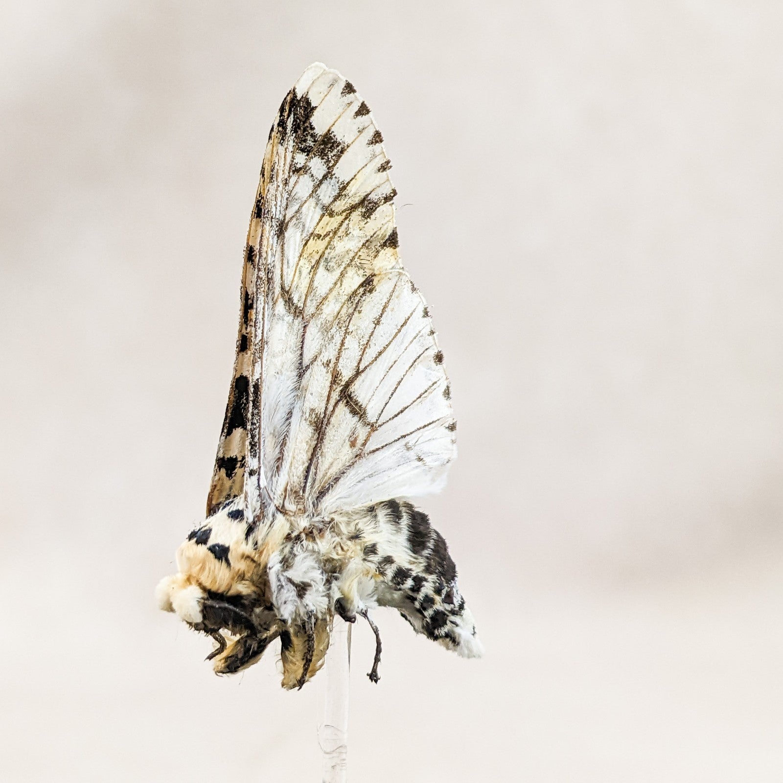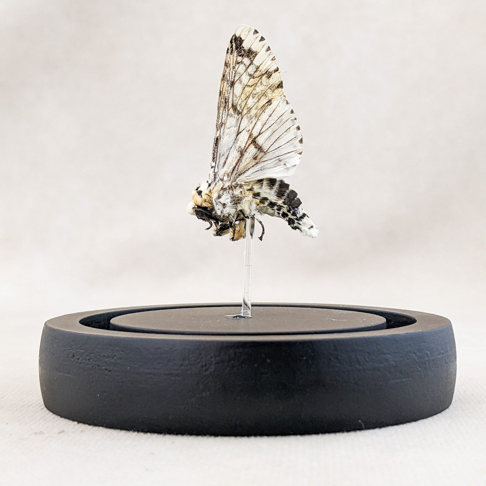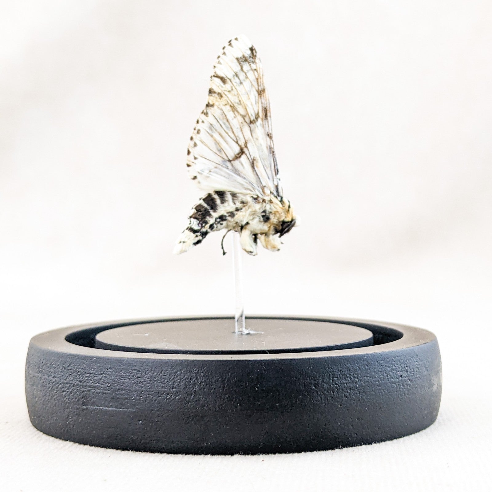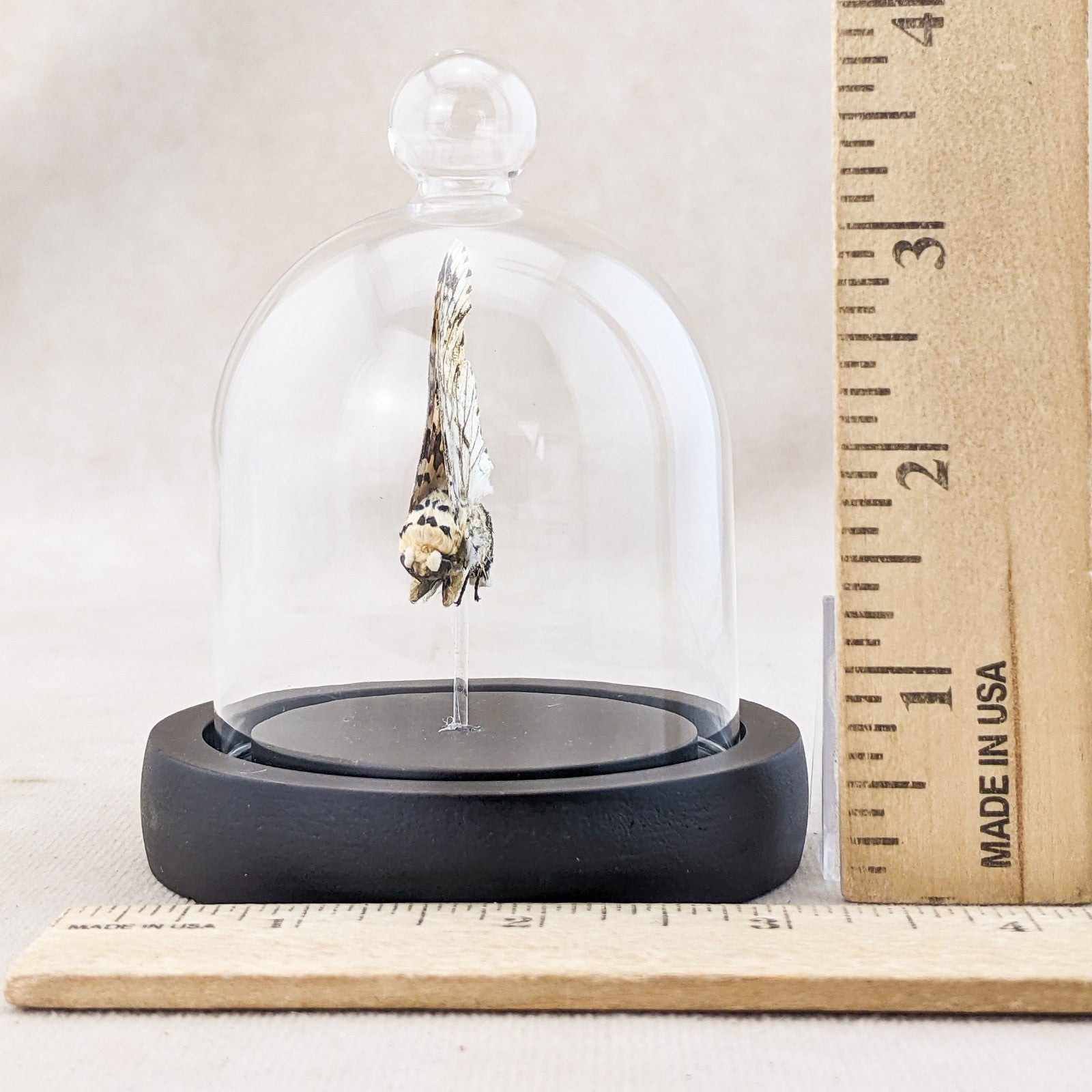 V23 #4 This is a Giant Zeuzera multistrigata equisetifolia moth has been mounted in a clear glass display dome with a black wood base. The display is approx 3" x 3 3/4" and will keep this little guy safe from dust and wind. This would be perfect for any collection and is very vibrant.